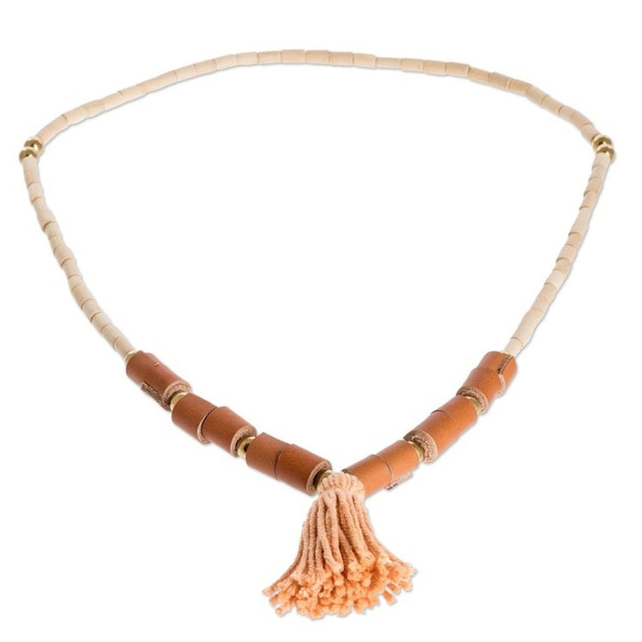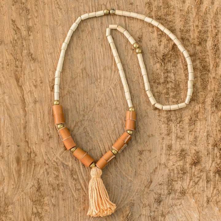 This 'Corcovado Bohemian' necklace by Rebeca Zamora is a beautifully bohemian accessory. The long necklace is crafted from tubes of tan leather, natural pinewood beads, and golden hematite, with a light peach-colored tassel as a pendant. The mixed-material design is both original and culturally proud, reflecting Rebeca's love for the natural beauty of her country. This piece is a beautiful expression of her artistry and commitment to sustainable creativity.