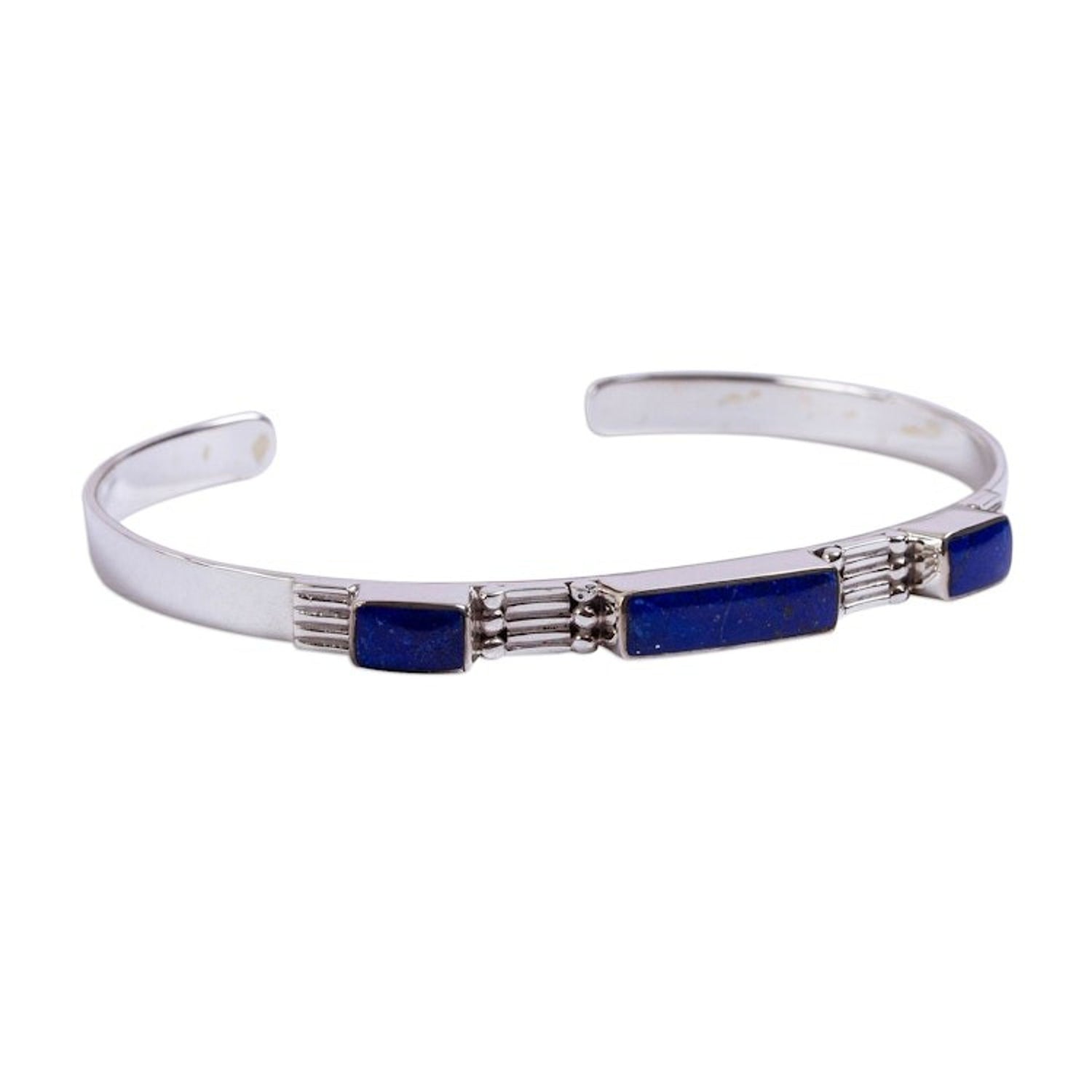 Handcrafted in Mexico from 925 sterling silver and lapis lazuli, this cuff bracelet measures 6 inches in length and 0.2 inches in width. It has a high-polish finish. Please note that color and variegation will vary.