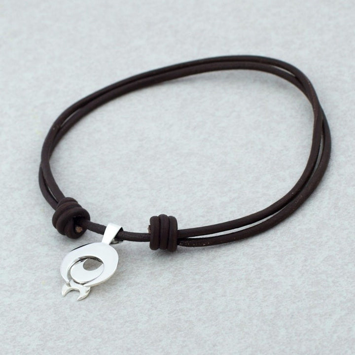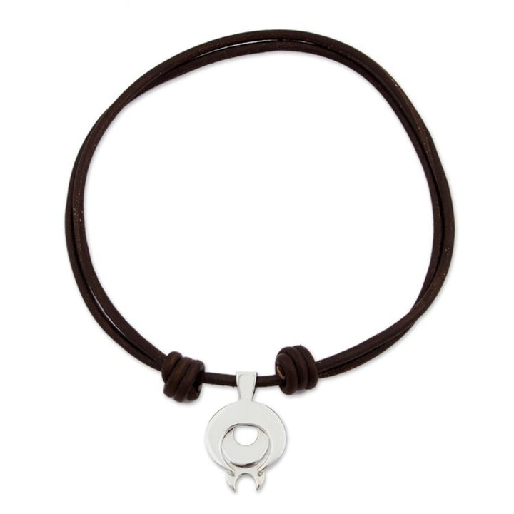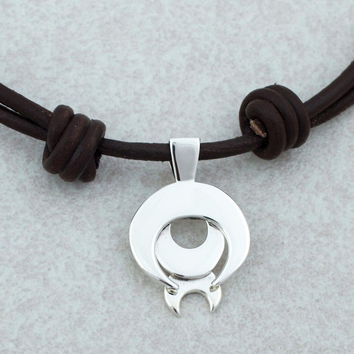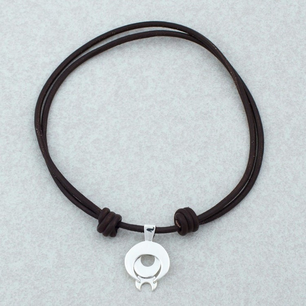 This 'Capricorn Moon' necklace by Mikelo is a beautiful and elegant accessory. The image of a horned goat is formed of four crescent moons in an elegant shape, hanging from a length of brown leather cord. The pendant is inspired by the Capricorn zodiac sign and is crafted from sterling silver with a high-polish finish. The design is a beautiful reflection of Mikelo's dedication to creating original pieces inspired by nature, faith, and the mysteries of the universe.