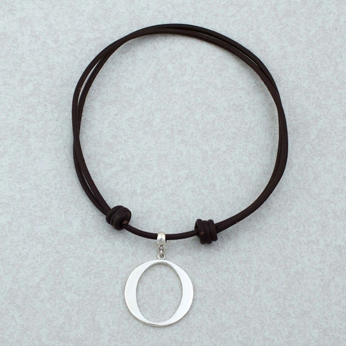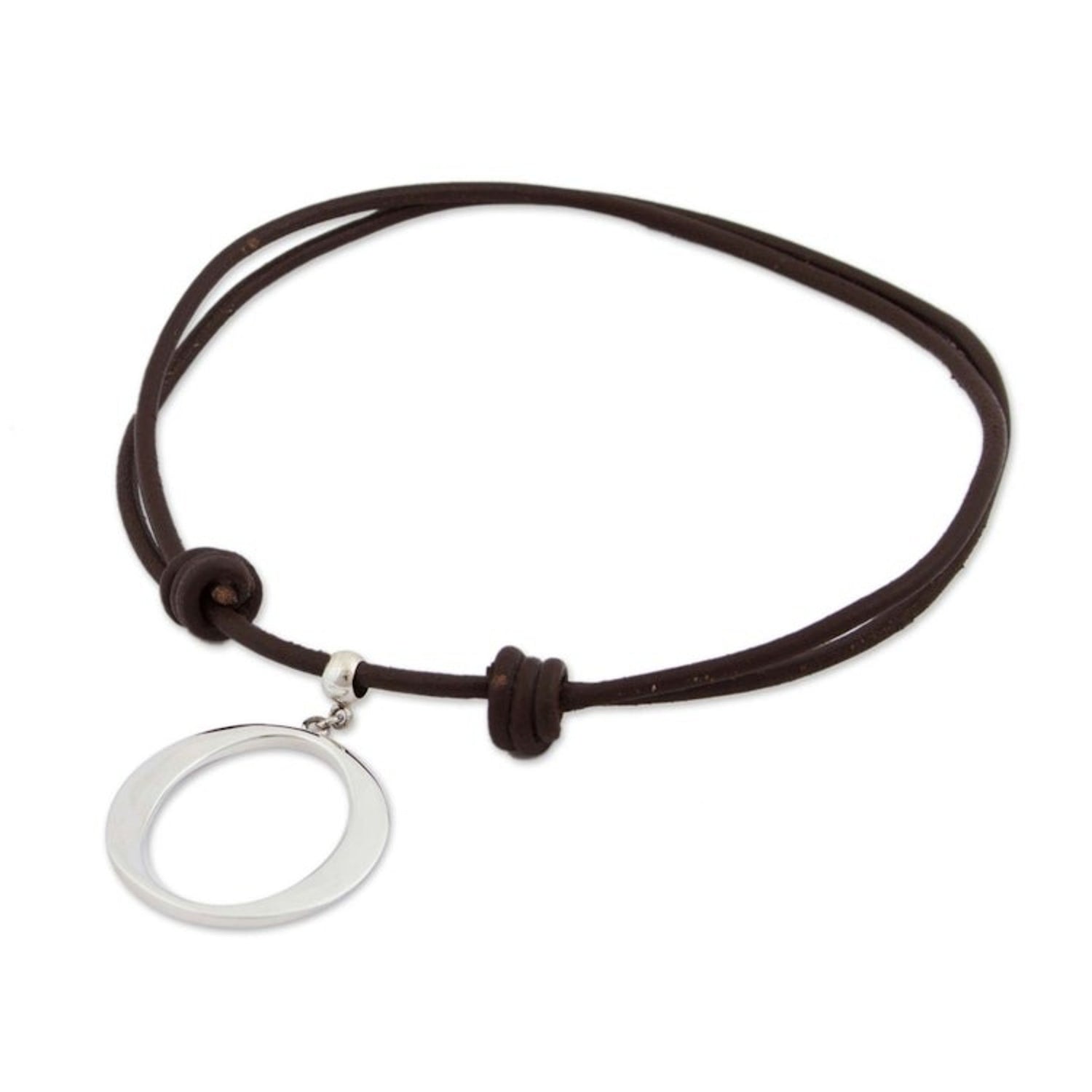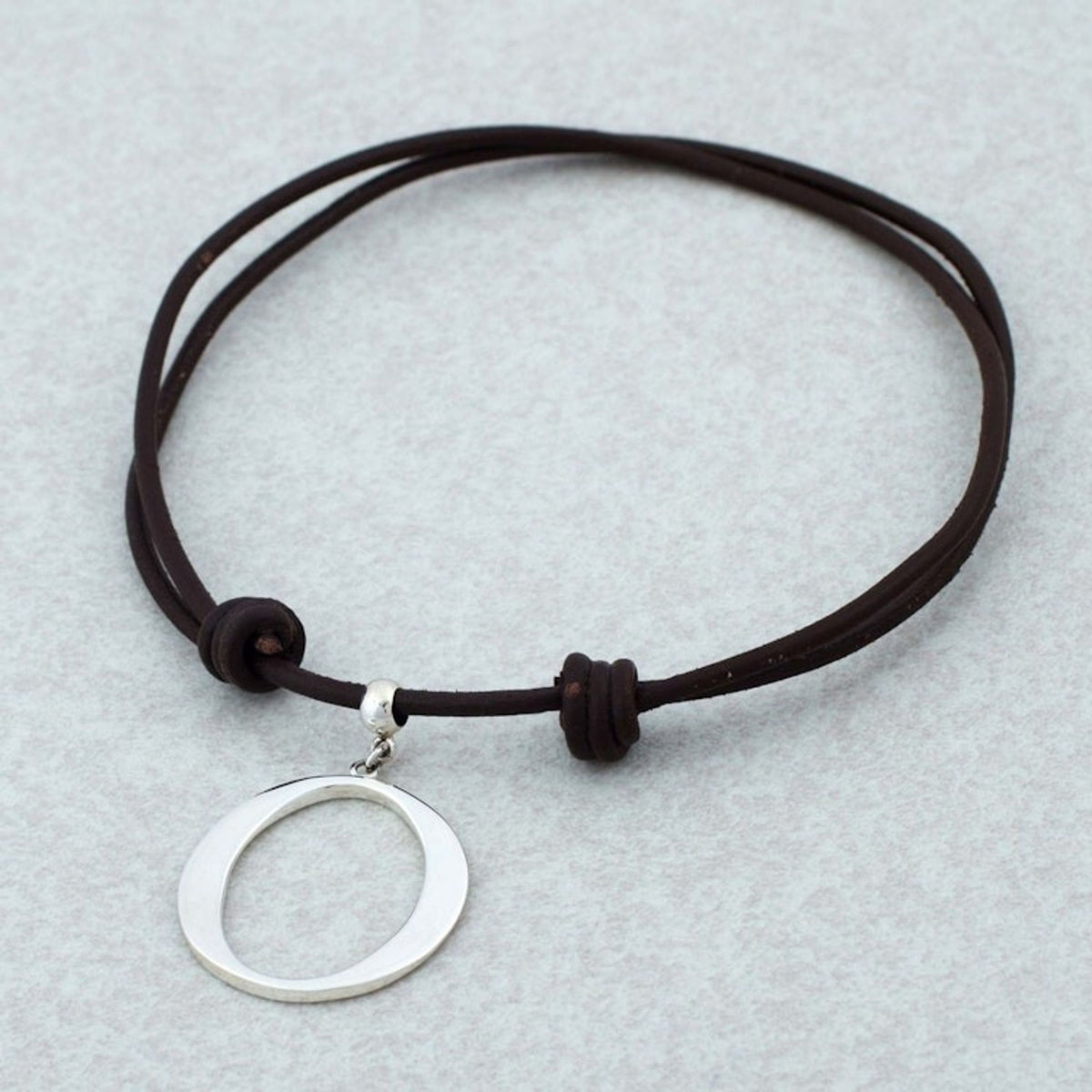 This 'Droplets of Life' necklace by Mikelo is a simple yet striking accessory. A ring of sterling silver hangs from a length of adjustable brown leather cord. This fantastic pendant necklace is sure to be noticed wherever it goes, and is a beautiful reflection of Mikelo's ability to create pieces that are hand-forged with traditional techniques.
