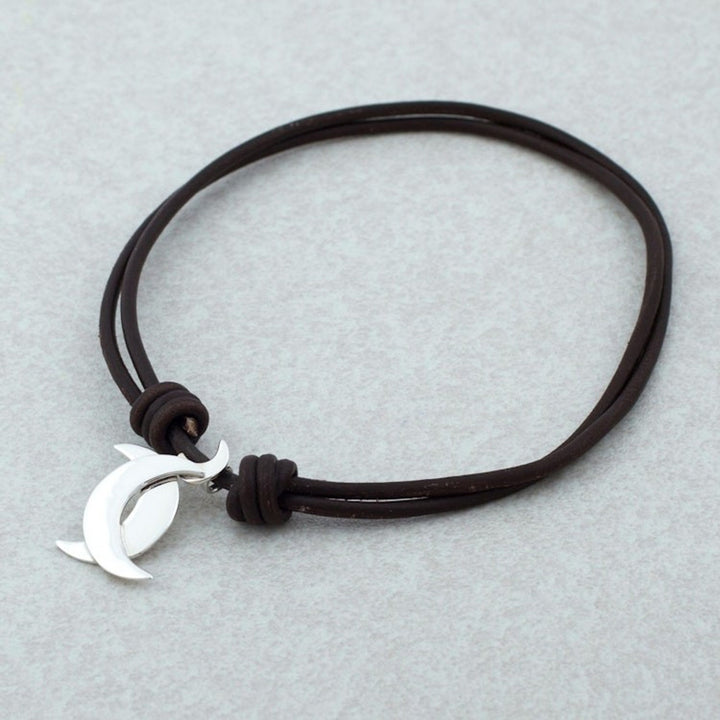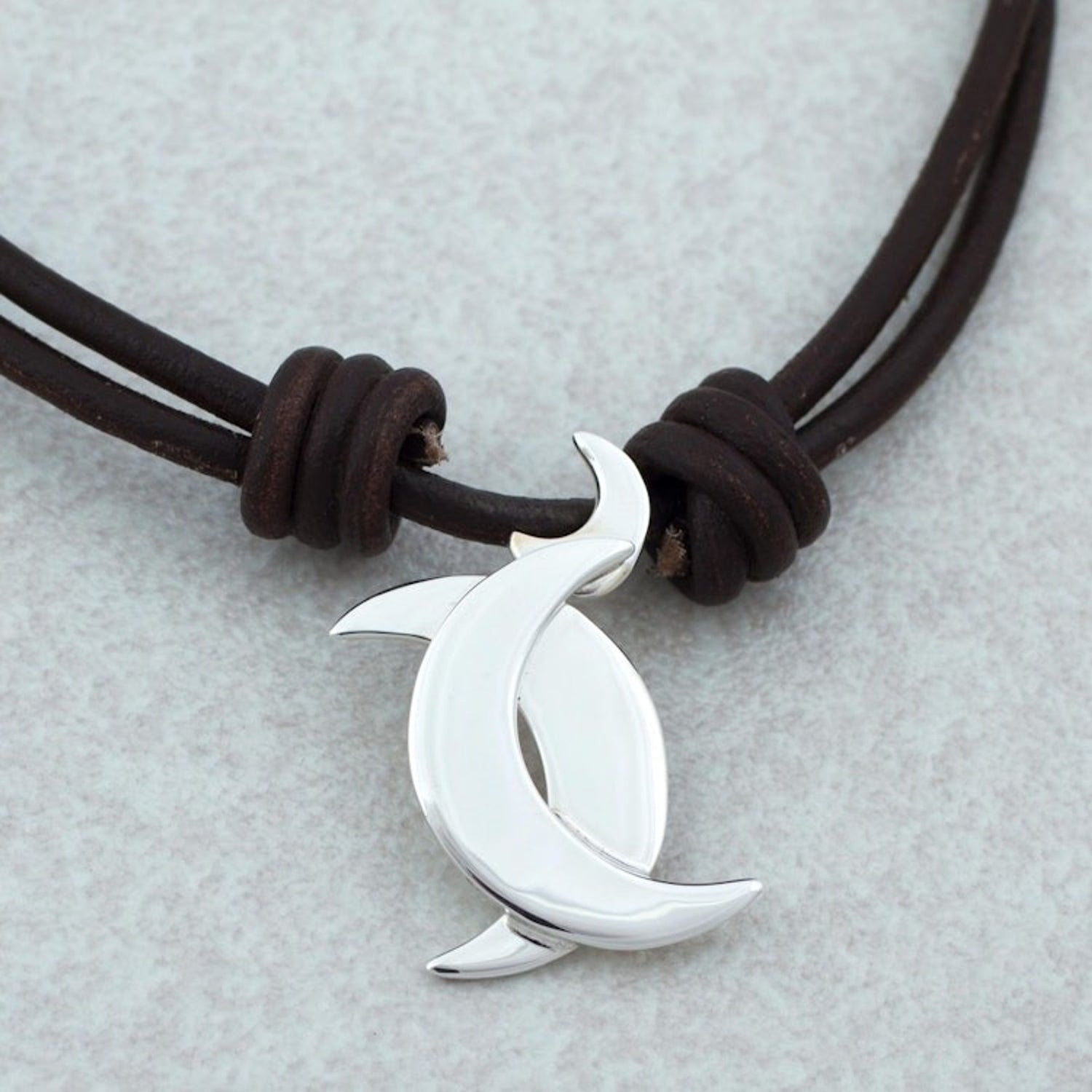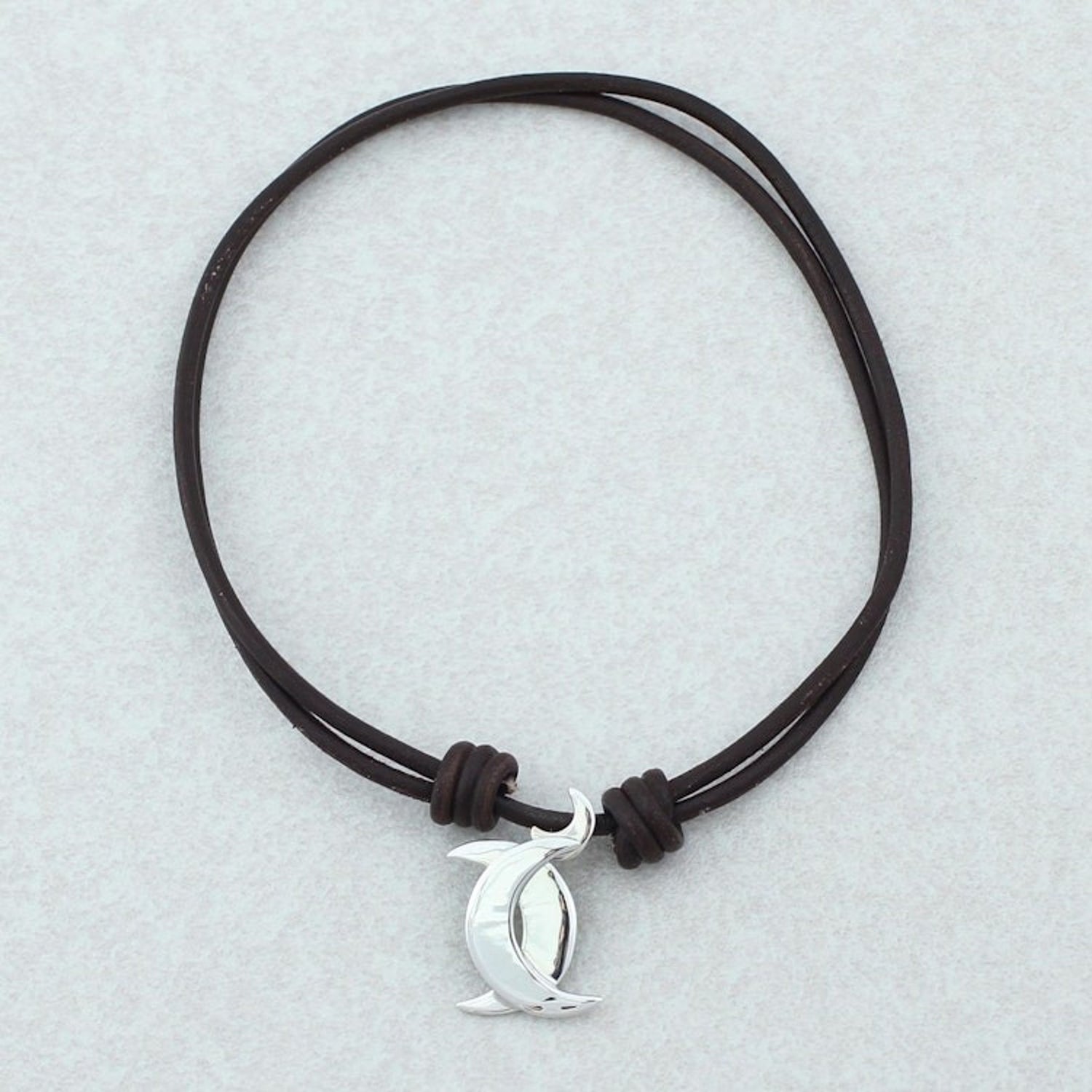 This 'Gemini Moon' necklace by Mikelo is an elegant accessory. Three crescent moons form an elegant shape inspired by the Gemini zodiac sign, hanging from an adjustable length of brown leather cord. The pendant is crafted from sterling silver with a rich glow inspired by the moon. This piece is a beautiful reflection of Mikelo's ability to translate imagination into silver, and to create pieces that are inspired by the mysteries of the universe.