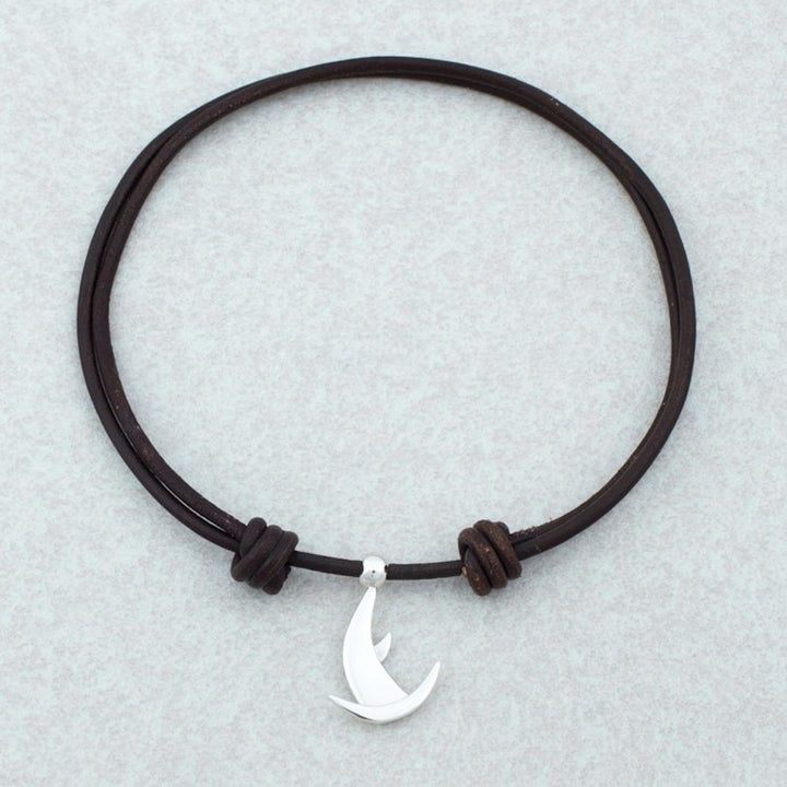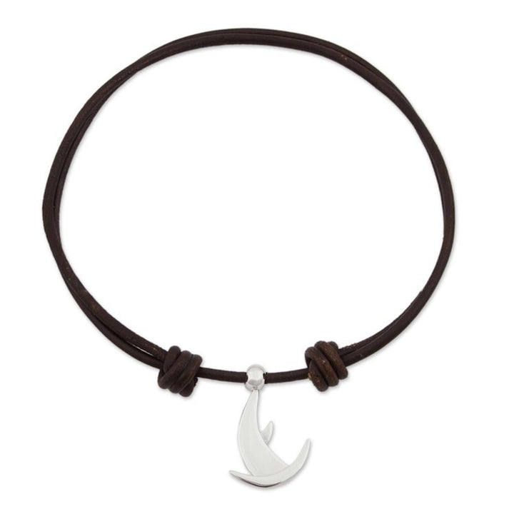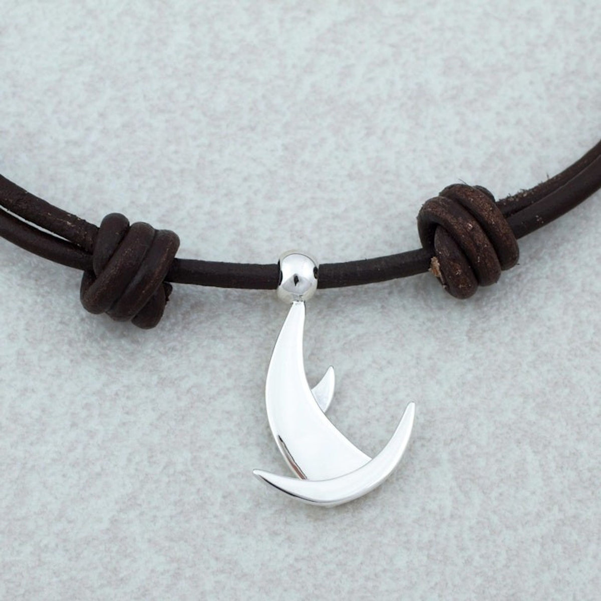 This 'Virgo Moon' necklace by Mikelo is an elegant accessory. Crescent moon shapes with a high-polish finish are inspired by the zodiac sign Virgo, and are worn on an adjustable brown leather cord. The pendant is crafted from sterling silver in his family's style of Taxco silver work. This piece is a beautiful reflection of Mikelo's ability to translate imagination into silver, and his dedication to creating pieces that bring peace, harmony, and balance to the wearer.