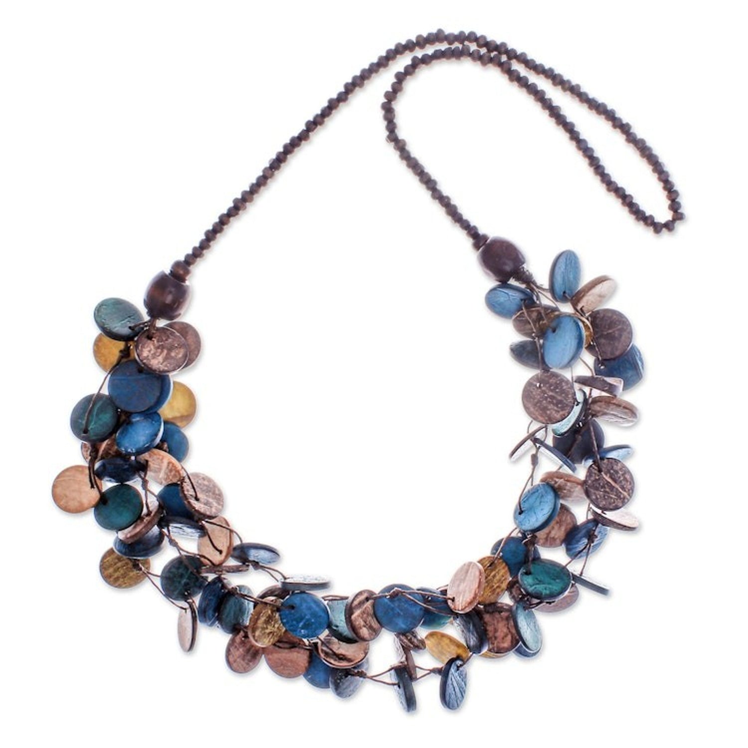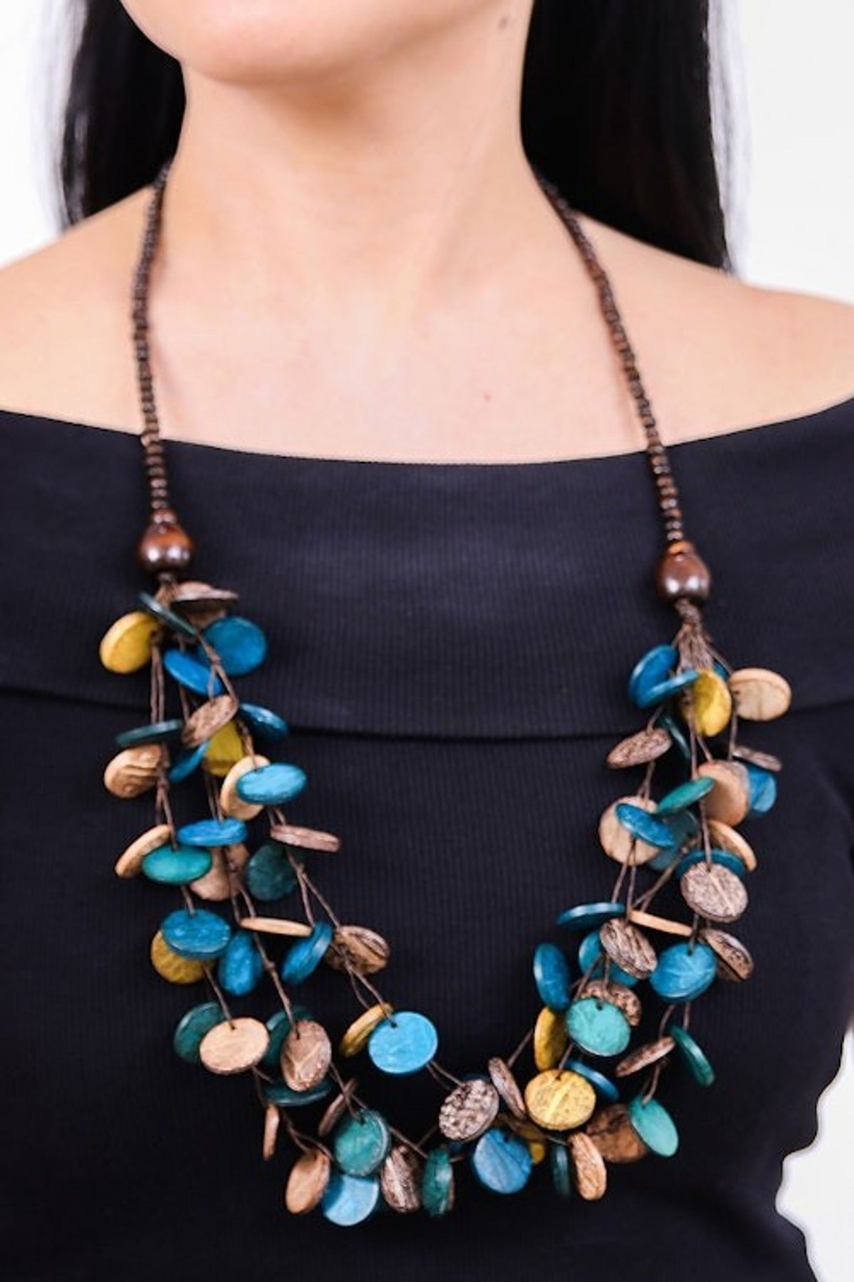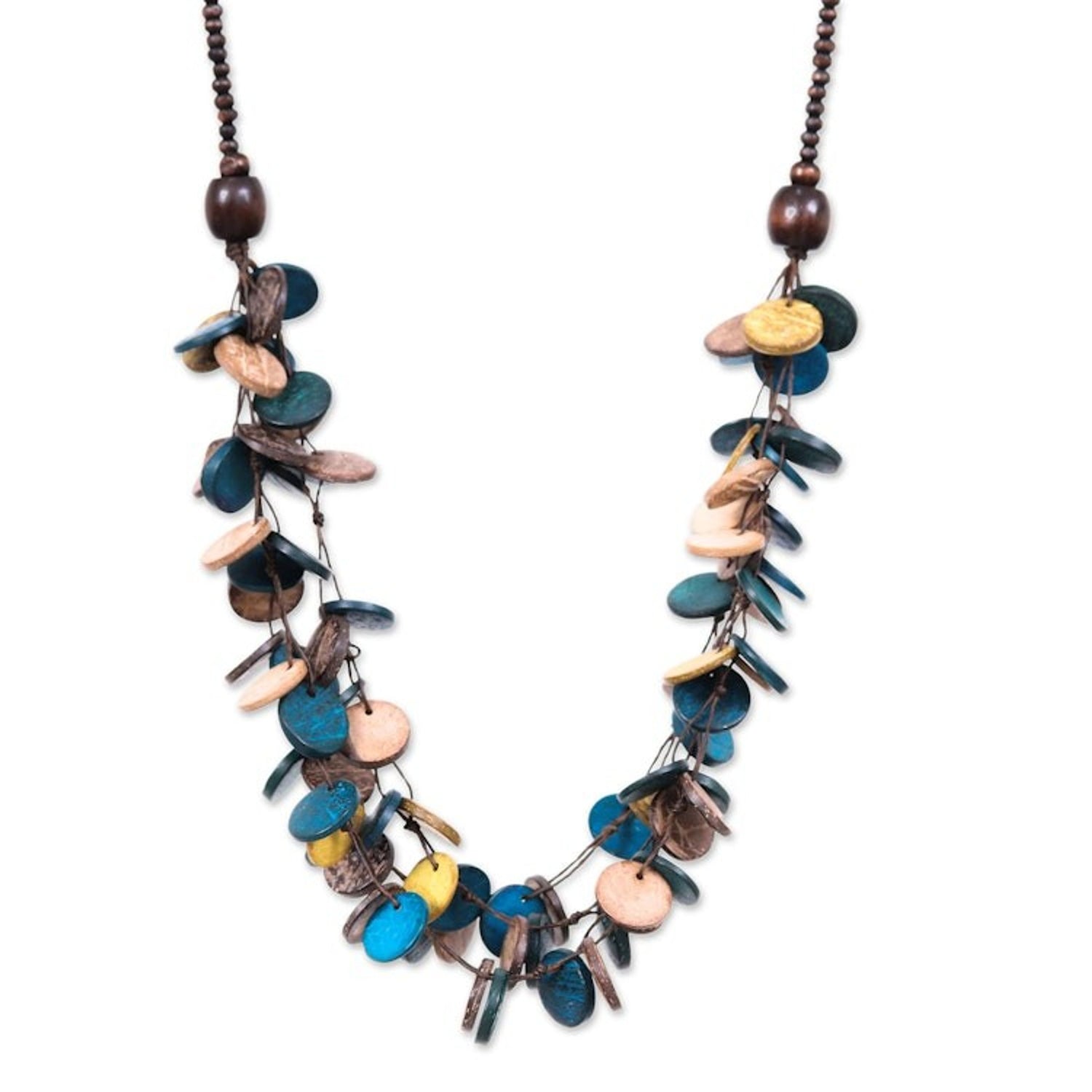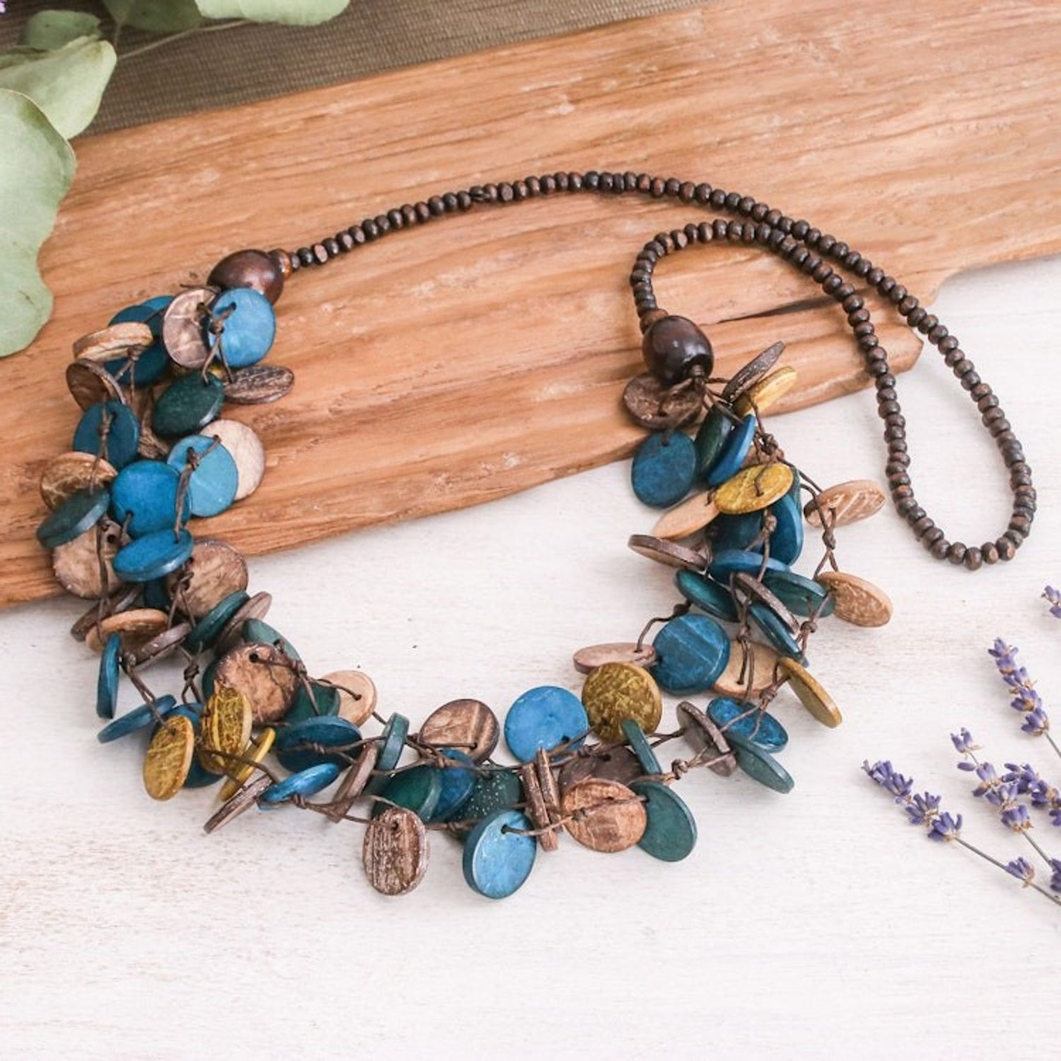 This 'Cycles of Majesty' necklace by Sumalee Nawakul is a majestic accessory. Sumalee combines little leaf wood beads and coconut shell pieces in this three-strand necklace, painted in teal and golden hues to evoke the grace of an ancient palace. This piece is a beautiful reflection of Sumalee's dedication to creating vibrant jewelry that celebrates Thai craftsmanship.