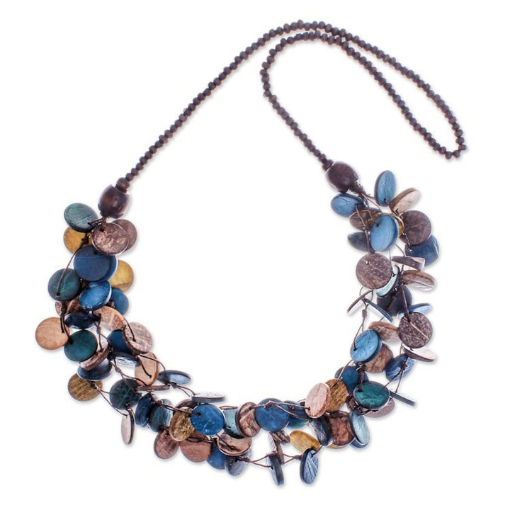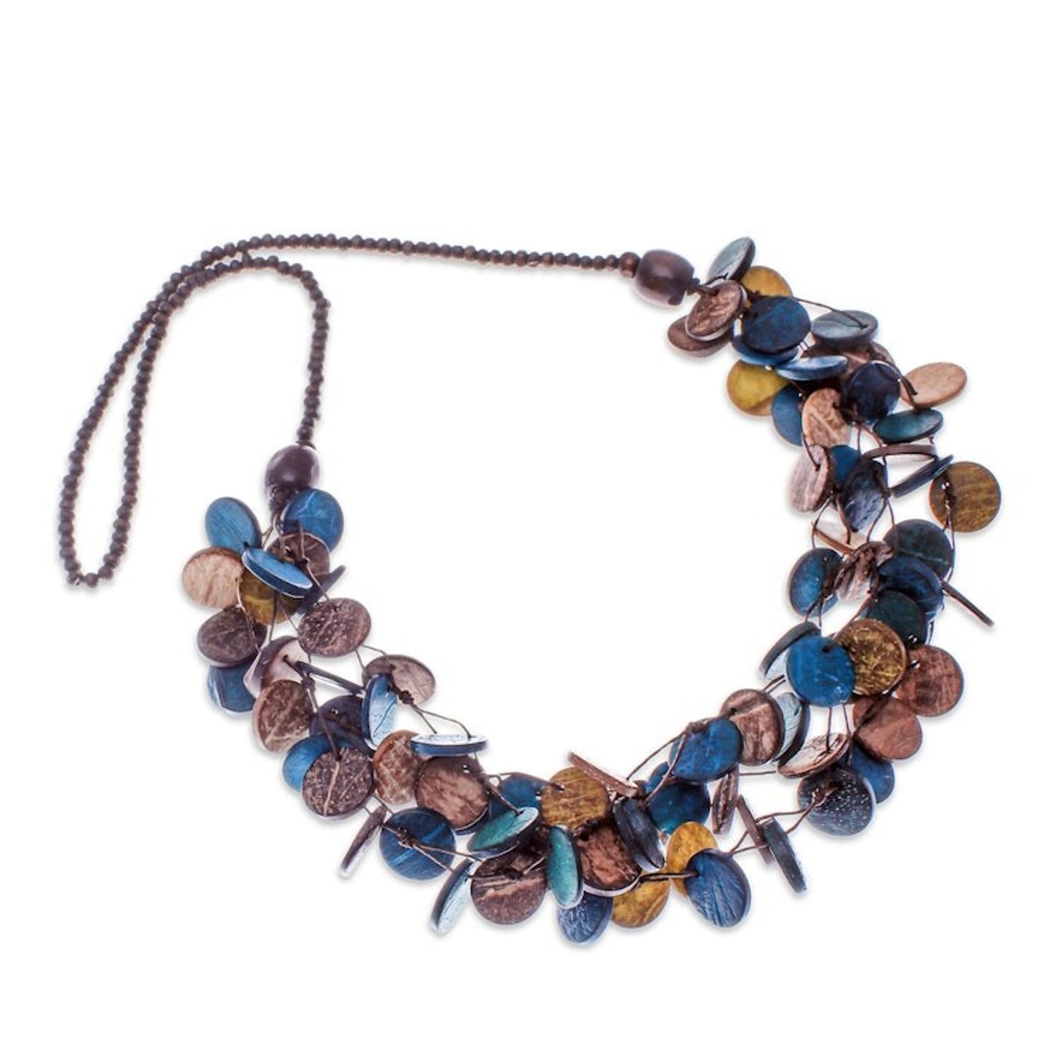 Handcrafted in Thailand from little leaf wood, coconut shell, and waxed polyester cord, this beaded necklace has a length of 30.5 inches, and the pendants measure 2.8 inches in length and 15.3 inches in width. Please note that color, size, and/or motif may vary slightly, and wood grain and color can vary slightly.