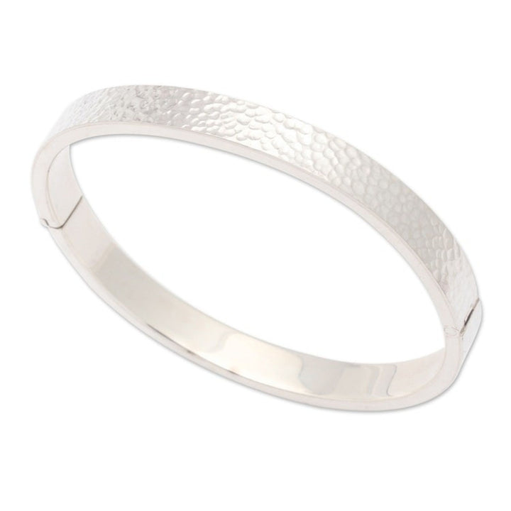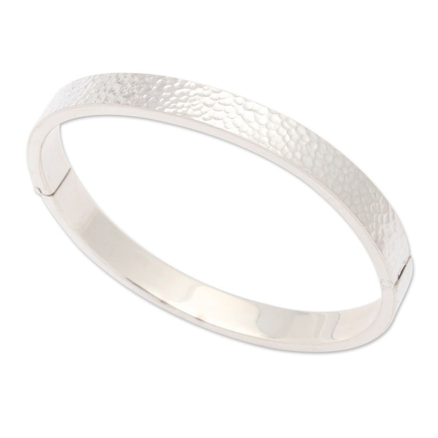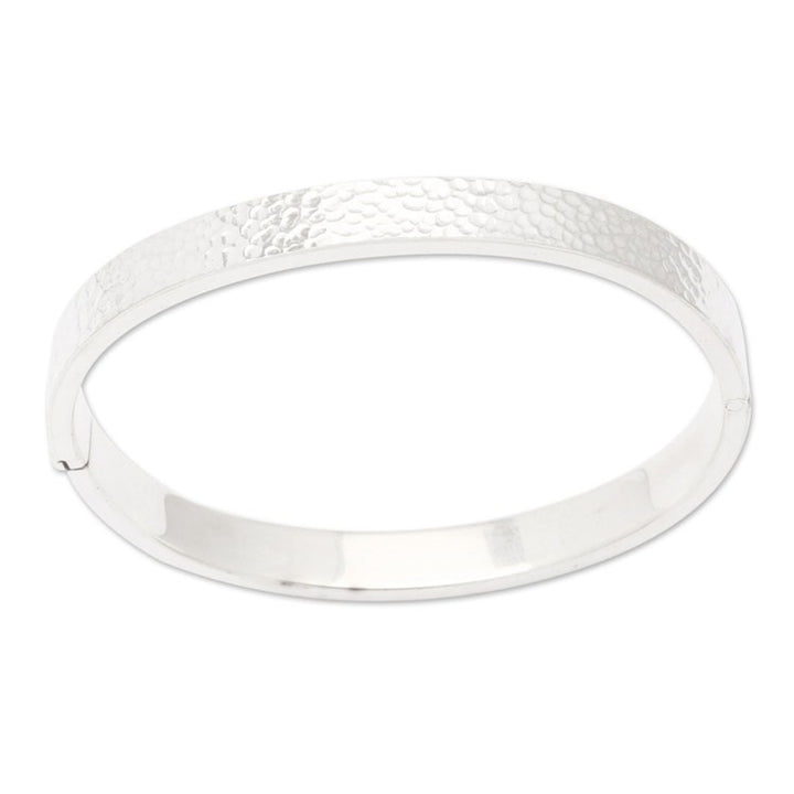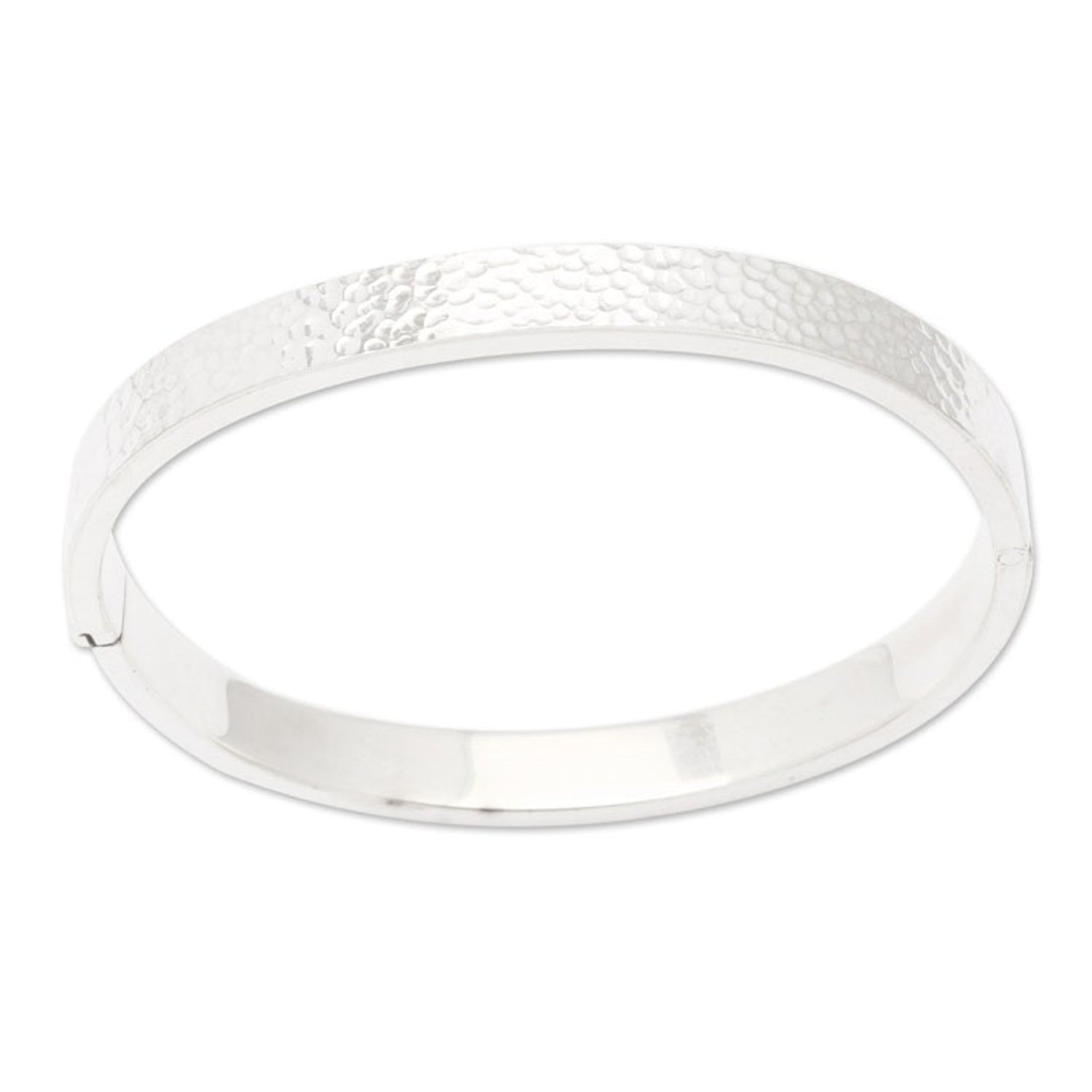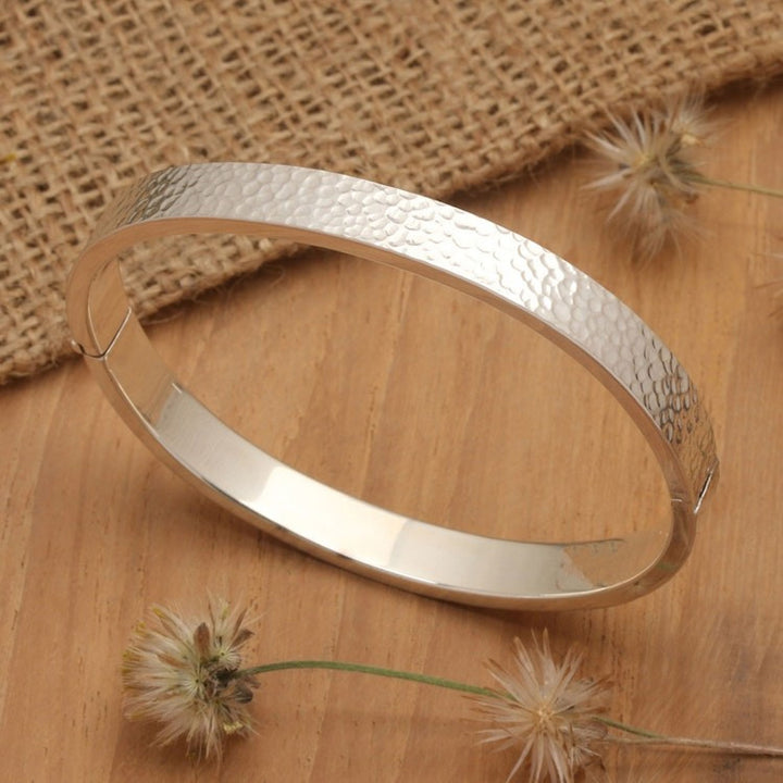 This 'Textured Oval' wristband bracelet by Nyoman Rena is a captivating accessory. This sterling silver wristband bracelet combines exquisite hammered textures with polished surfaces. The contemporary design, resembling a thick bangle, is accented by a side push-button clasp. The piece is a beautiful reflection of Nyoman Rena's ability to blend his carving skills with metalwork and to create designs that capture both Balinese heritage and contemporary design.