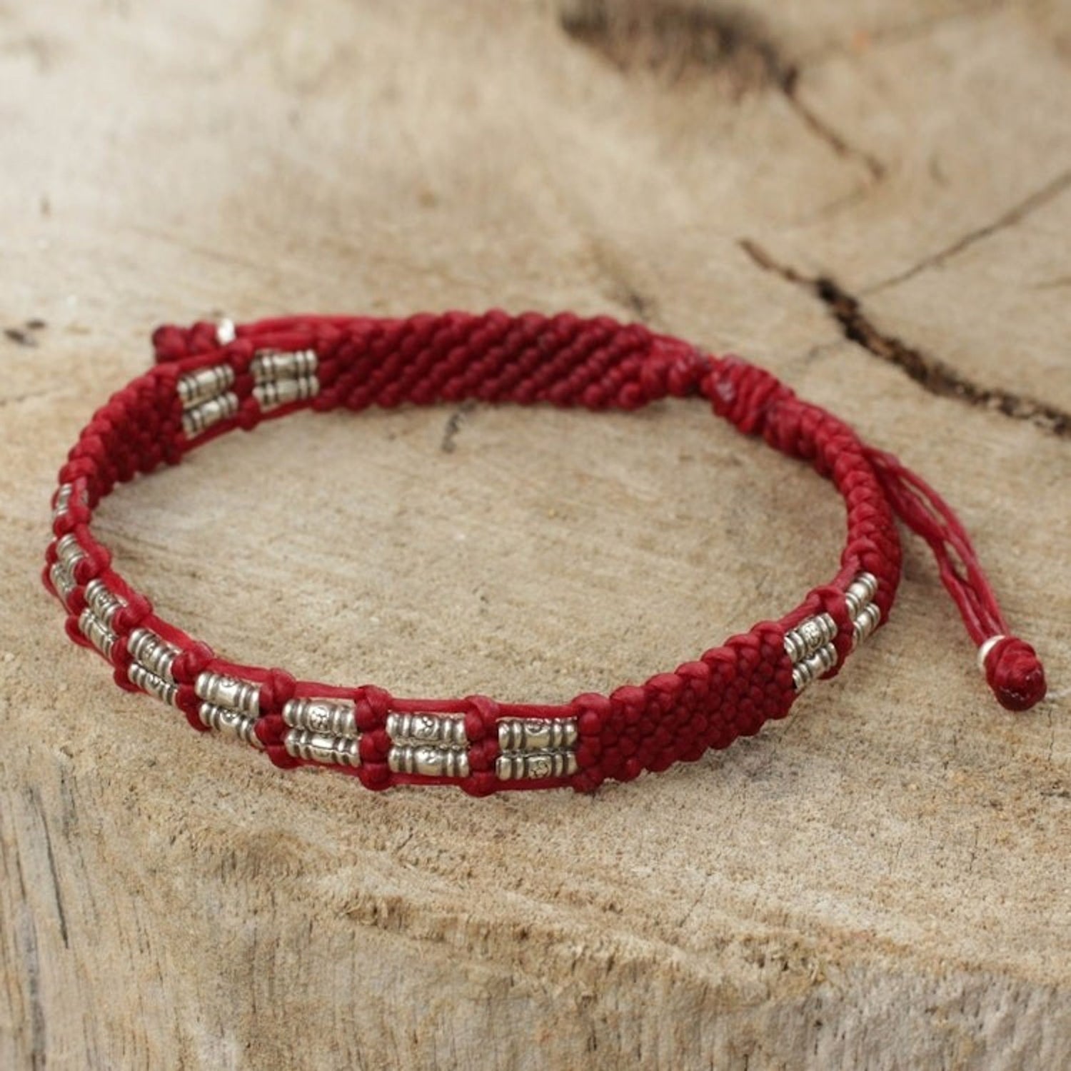 This 'Affinity in Red' bracelet by Napapat is an original accessory. Two by two, flower-stamped silver beads stick together like old chums. The silver beads are crafted by Karen hill tribe artisans, and Thai jewelry artisan Napapat hand-knots them on crimson cords in this original bracelet design. The bracelet can be adjusted to fit by sliding the knots. The design is a beautiful reflection of Napapat's dedication to creating pieces that reflect patience, imagination, and heartfelt artistry.