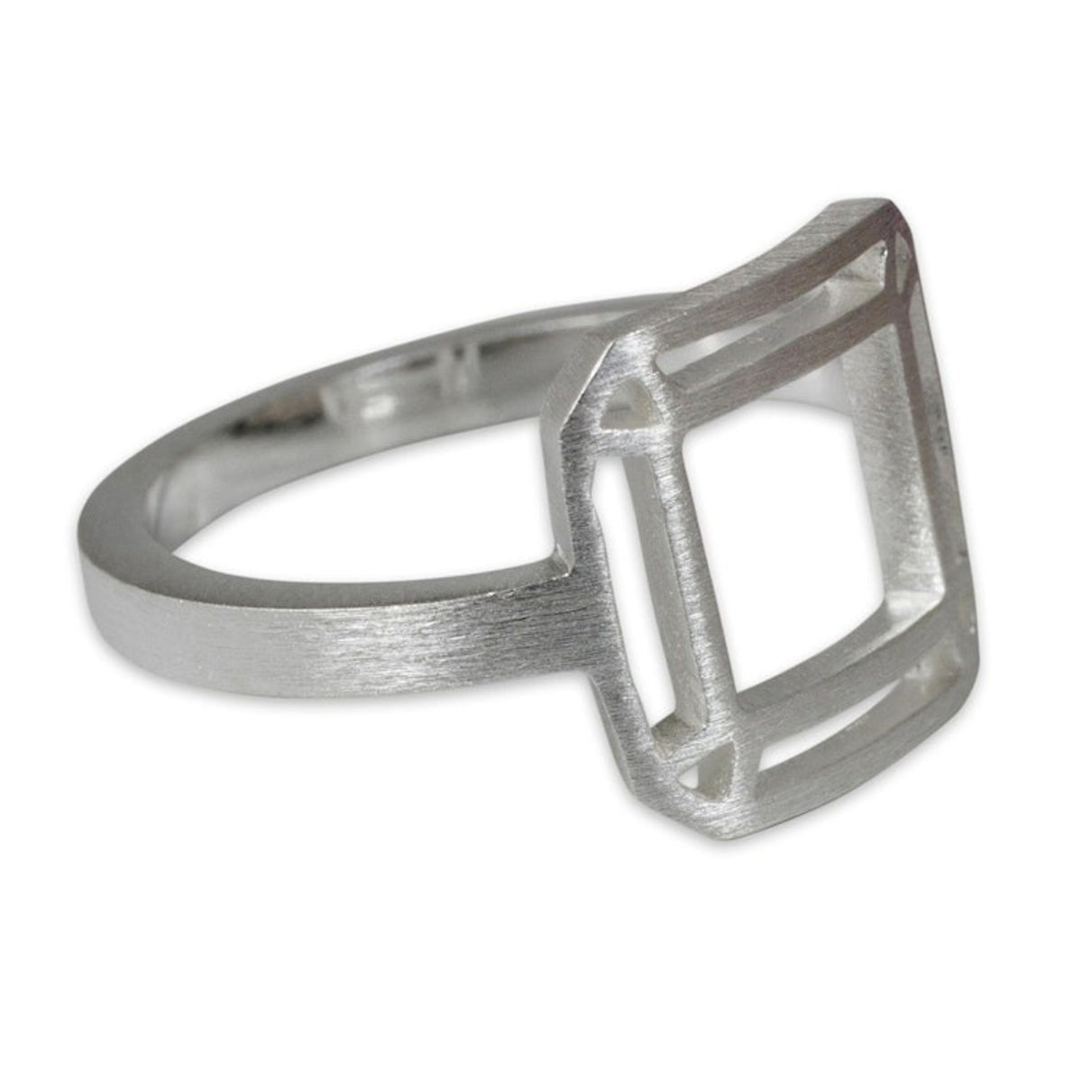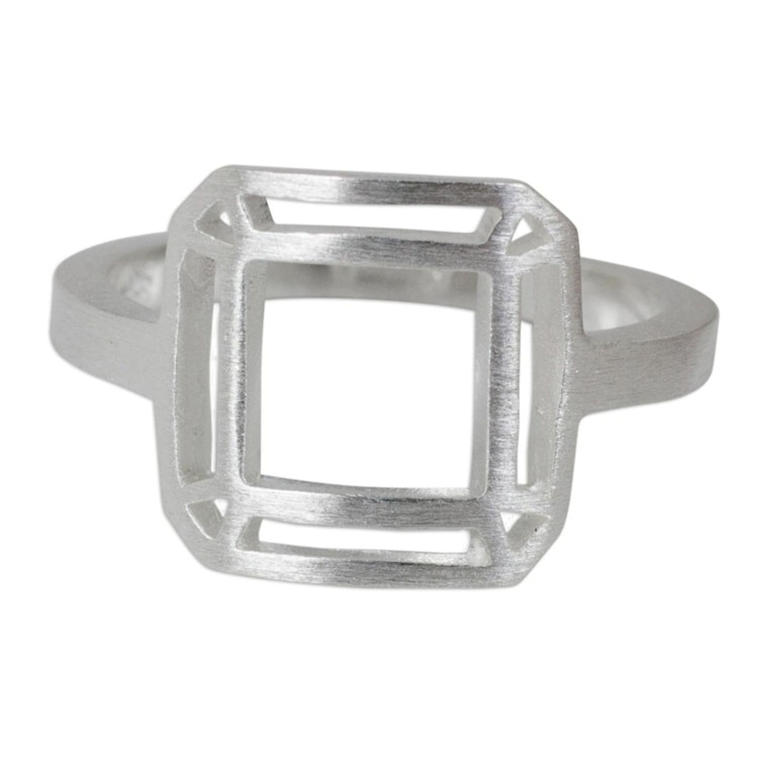 This 'Satin Window' ring by Jantana is a geometry-themed accessory. Open concentric squares crown a geometry-themed ring. The Thai artisan crafts the sterling silver design by hand and gives the cocktail ring a brushed satin finish. This piece is a beautiful reflection of Jantana's dedication to creating jewelry that is a way to share joy, beauty, and craftsmanship with the world.