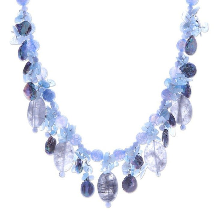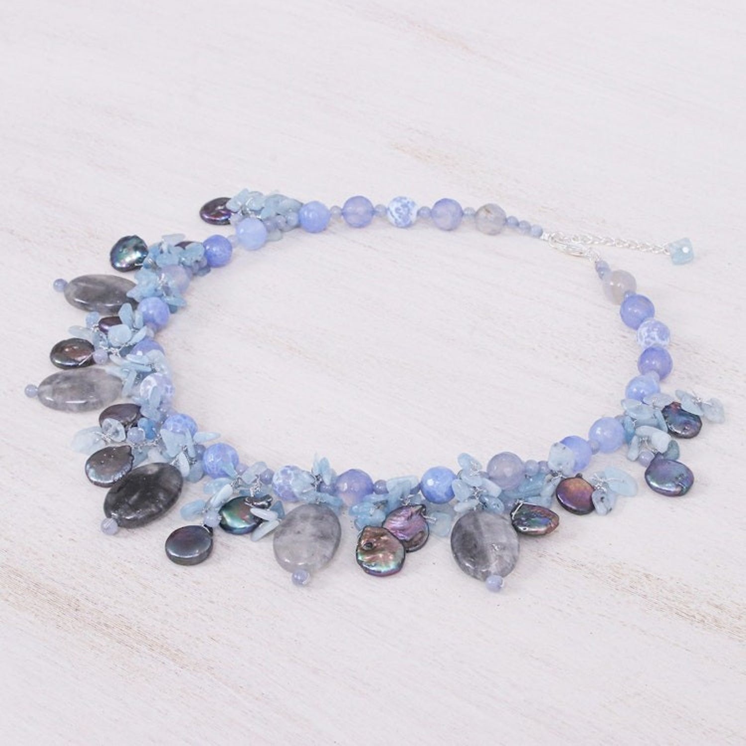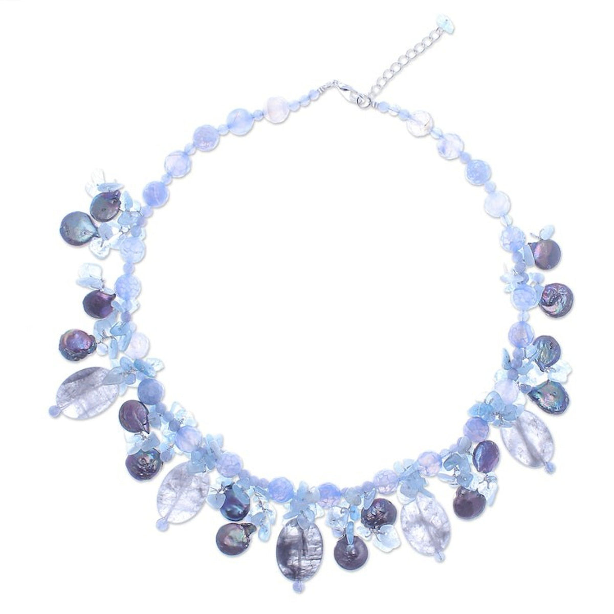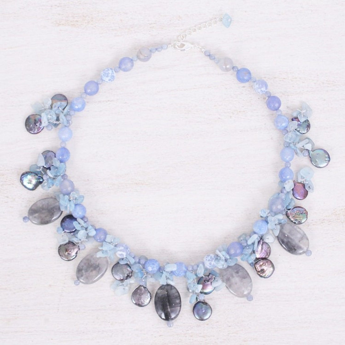 Handcrafted in Thailand from chalcedony, aquamarine, quartz, cultured pearl, silk thread, and silver-plated brass clasp, this necklace has a length of 18.5 inches with a 45mm width. It has a high-polish finish and secures with a lobster claw clasp. Please note that colors may vary slightly.