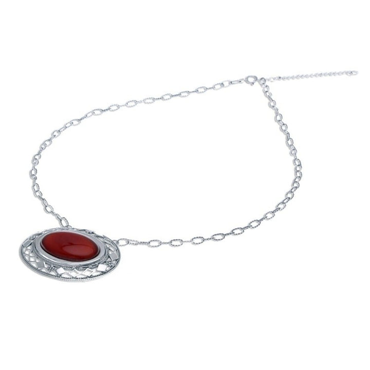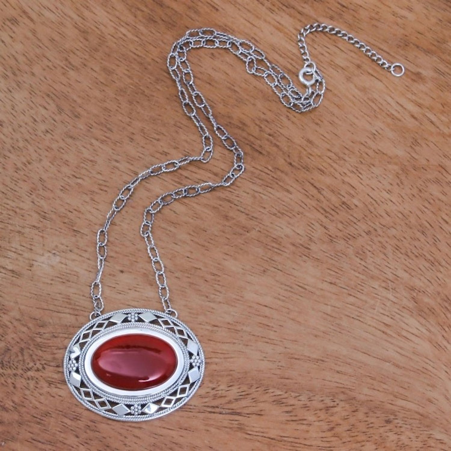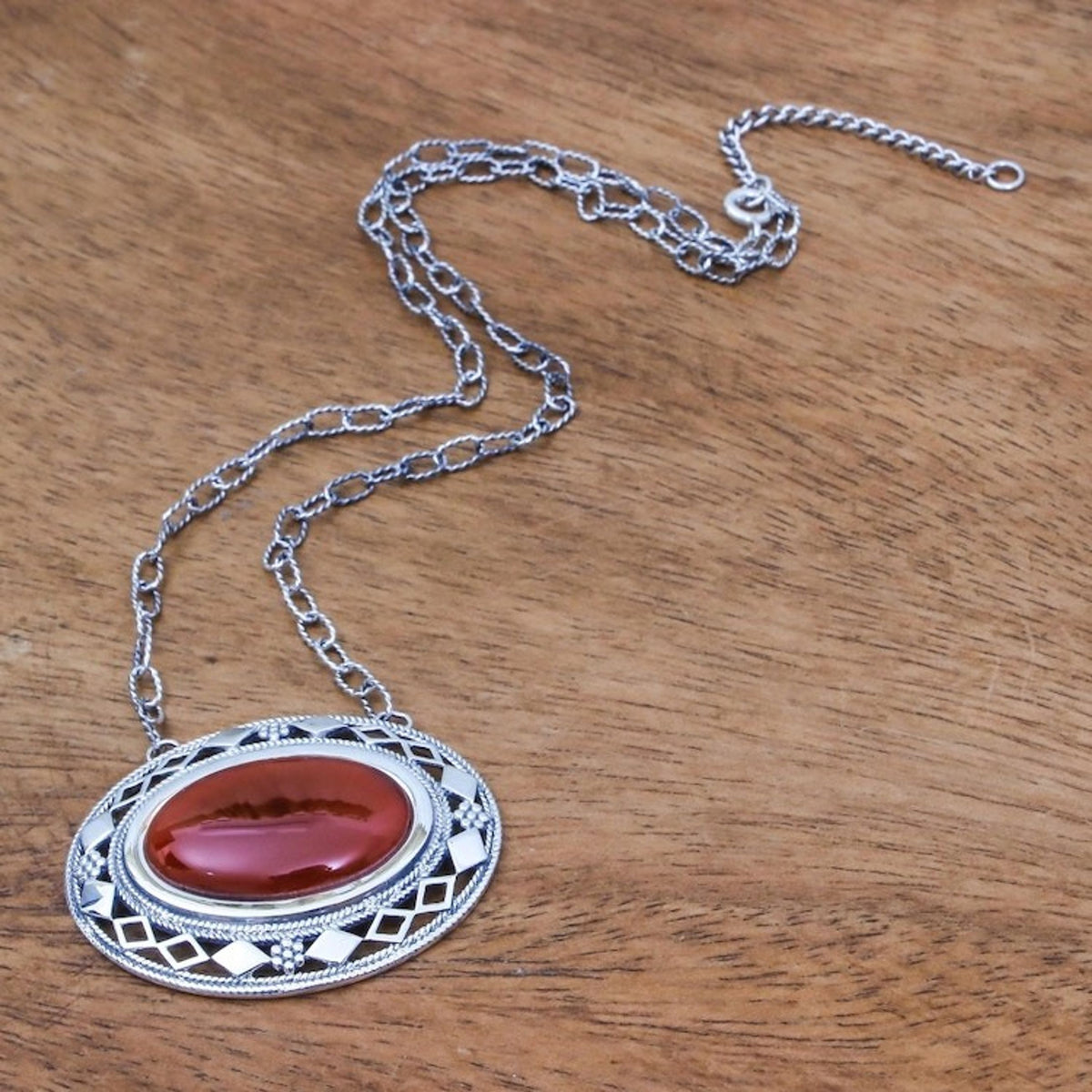 Handcrafted in Thailand from 925 sterling silver and carnelian, this necklace has an adjustable length from 18 to 20 inches with a 3mm width, and the pendant measures 1.6 inches in length and 1.9 inches in width. It has a high-polish finish and secures with a spring ring clasp. Please note that some variations in color and/or pattern are to be expected.