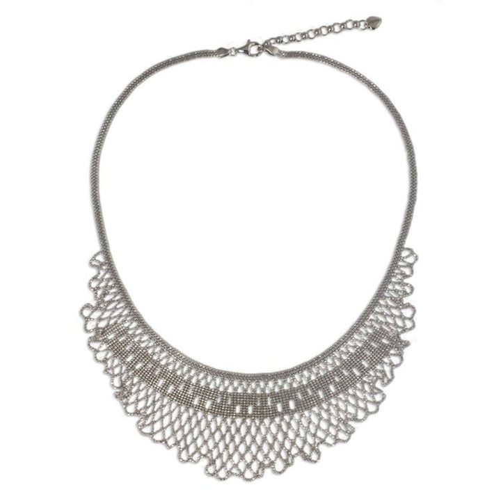 This 'Ruffled Jasmine' necklace by Angels is a lacy accessory. This lacy necklace is crafted by hand. The young Thai artisan works with ball chains, effectively transforming them into original handcrafted jewelry. The design is a beautiful reflection of Angels' dedication to crafting intricate silver chains and her support for the communities who sustain Thailand's silversmithing culture.