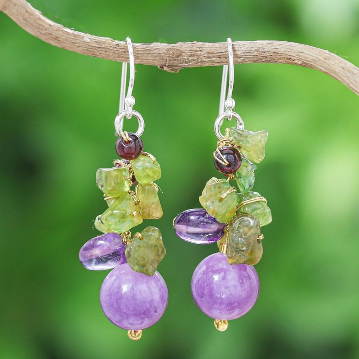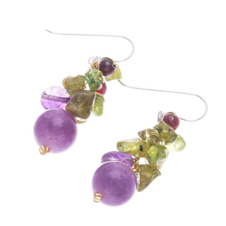 Handcrafted in Thailand from peridot, garnet, amethyst, quartz, metallic thread, and 925 sterling silver, these dangle earrings measure 1.8 inches in length and 0.6 inches in width. They have a high-polish finish and secure with hooks. Please note that colors may vary slightly.