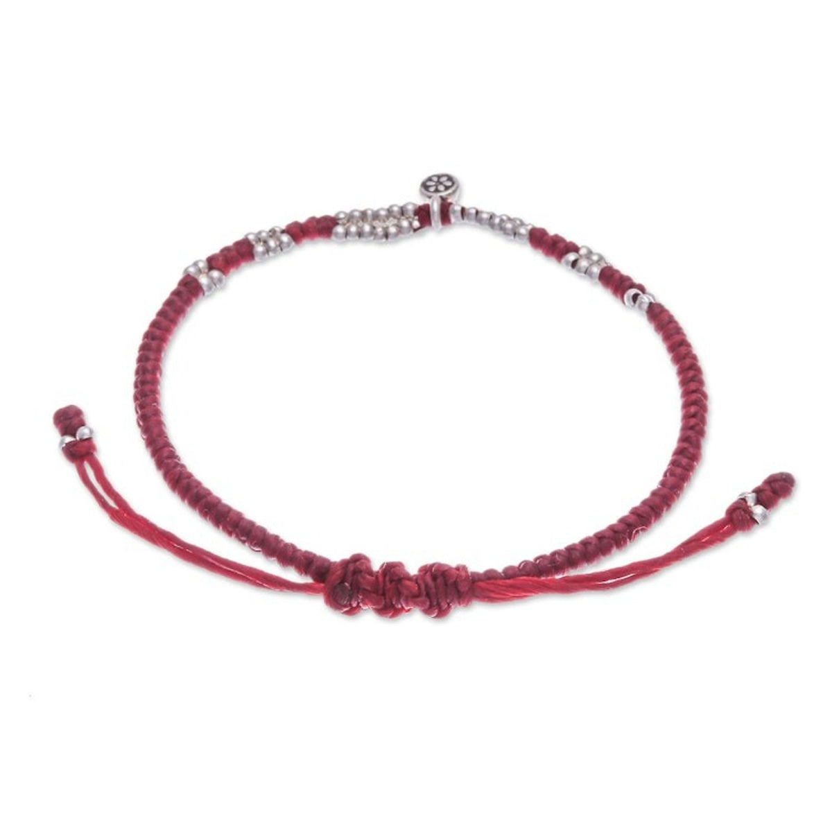 This 'Petite Flower in Red' bracelet by Samart Takham's family workshop is a lovely accessory. This lovely pendant bracelet is hand-crafted from a waxed polyester cord using the macramé technique. The pendant and beads are made with local 950 silver and the cord is adjustable thanks to a sliding knot closure. The design is a beautiful reflection of the family's dedication to preserving generational knowledge while offering beautifully crafted designs that carry the spirit of Thai heritage and family artistry.