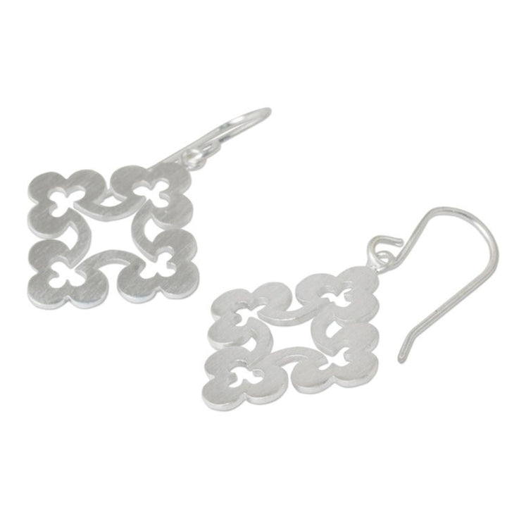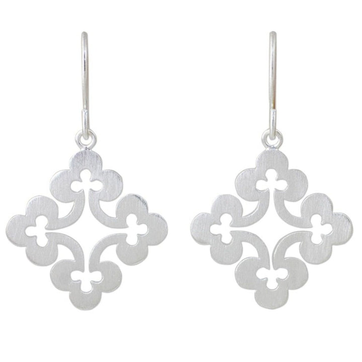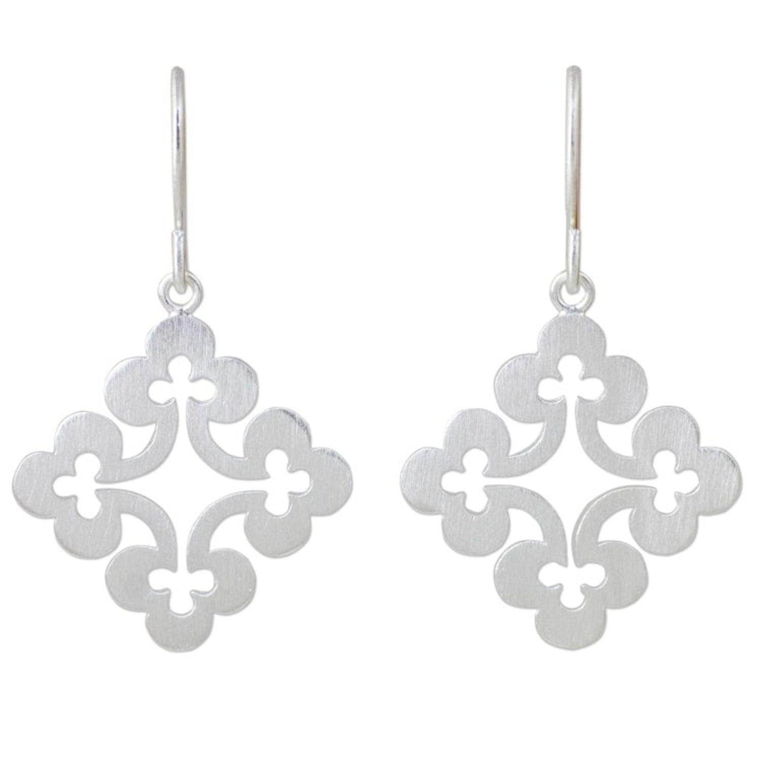Handcrafted in Thailand from sterling silver, these dangle earrings measure 1.5 inches in length and 0.9 inches in width. They secure with hooks.