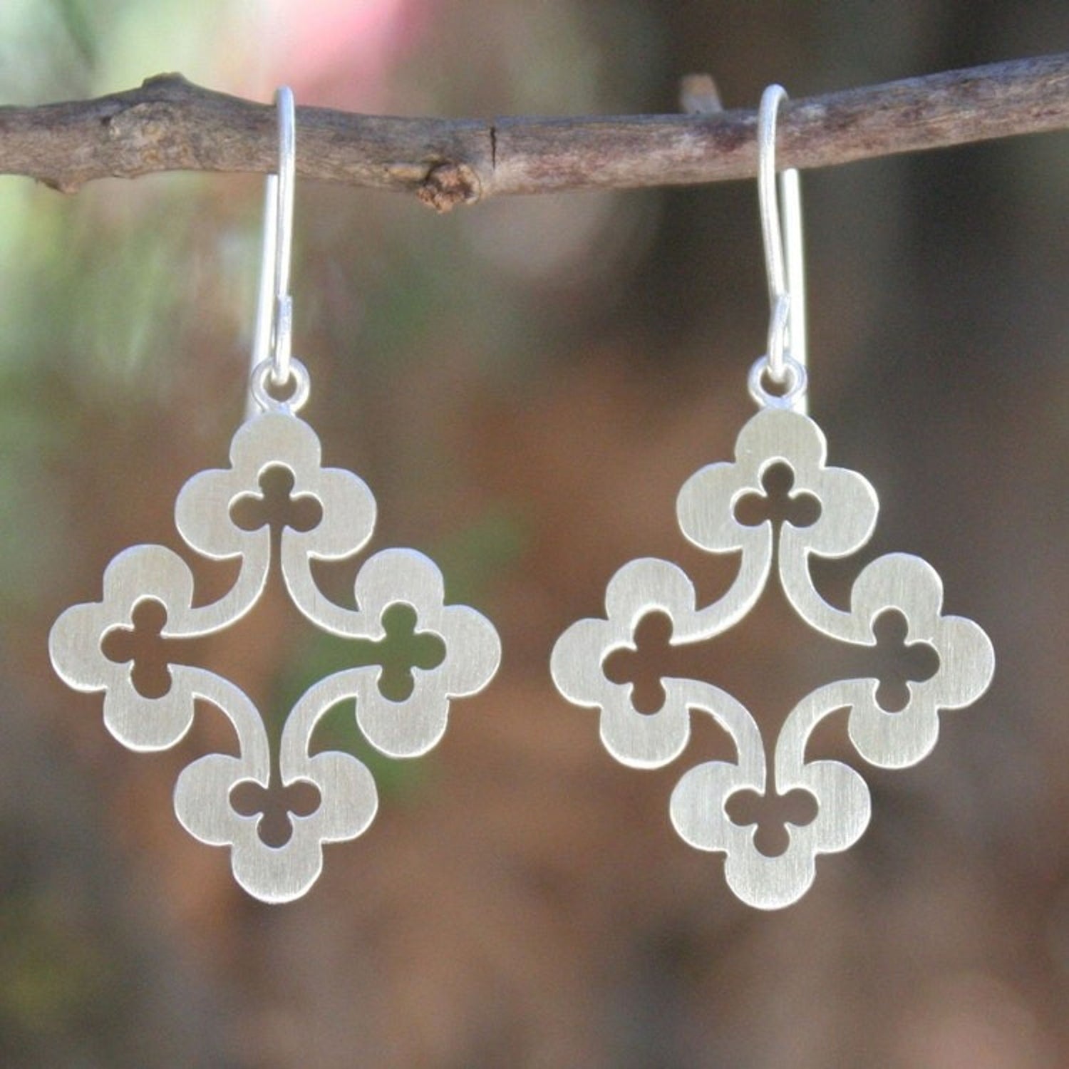 These 'Floral Cross' earrings by Jantana are a contemporary accessory. Fashioned of brushed silver, a floral cross dances on sterling wires. Jantana designs beautifully contemporary earrings. This piece is a beautiful reflection of Jantana's dedication to creating jewelry that is a way to share joy, beauty, and craftsmanship with the world.