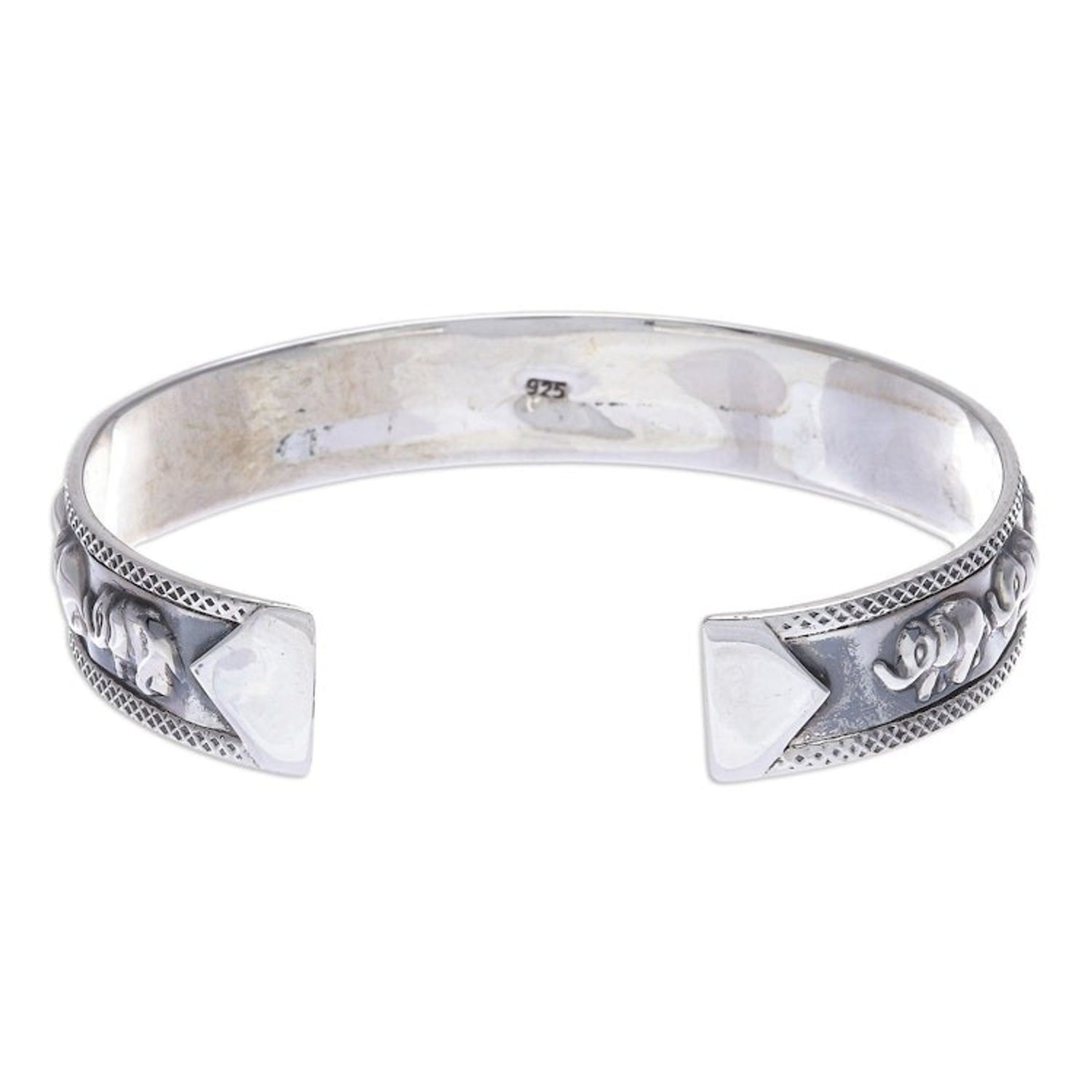 Handcrafted in Thailand from 925 sterling silver, this cuff bracelet measures 6.3 inches in length and 0.5 inches in width. It has an oxidized finish.