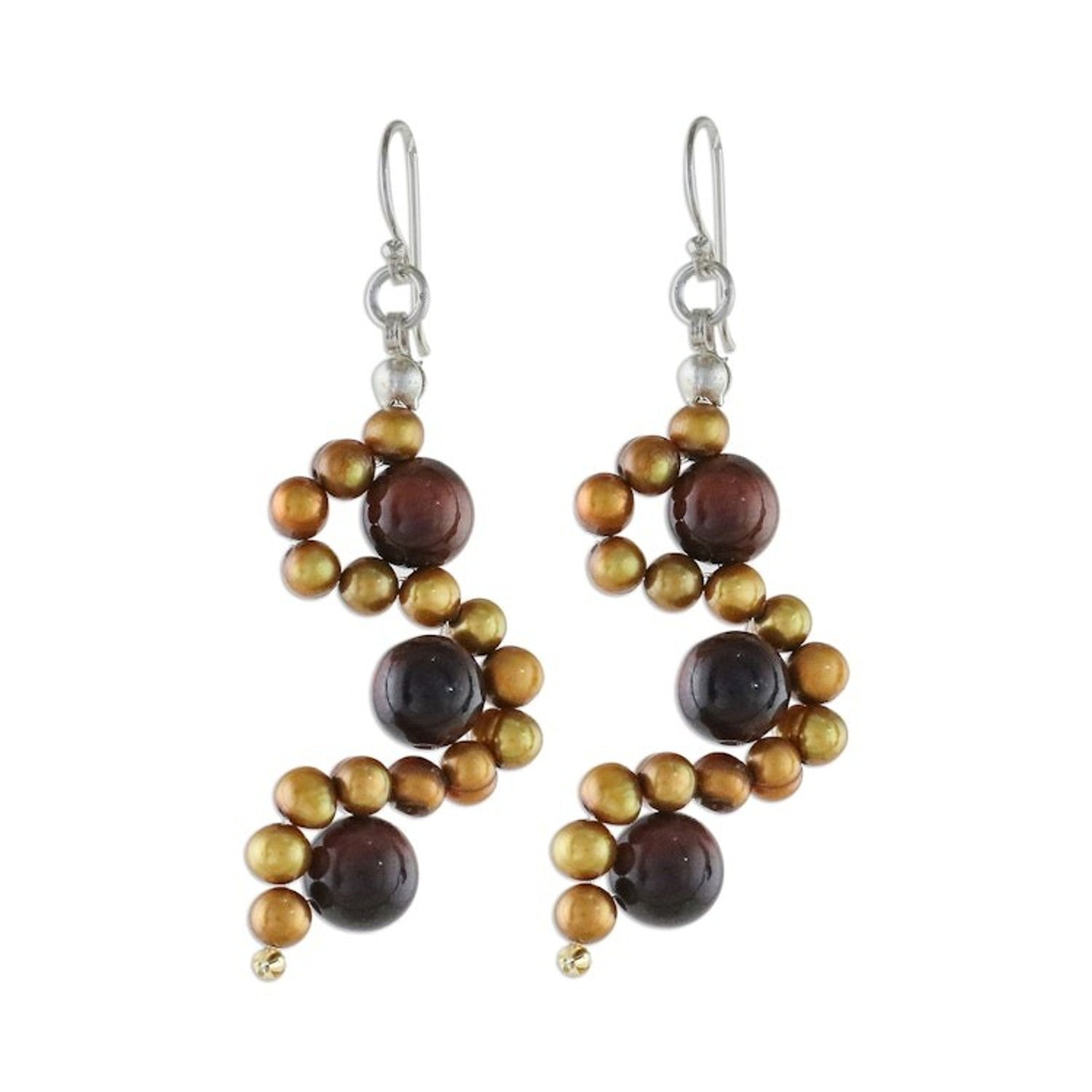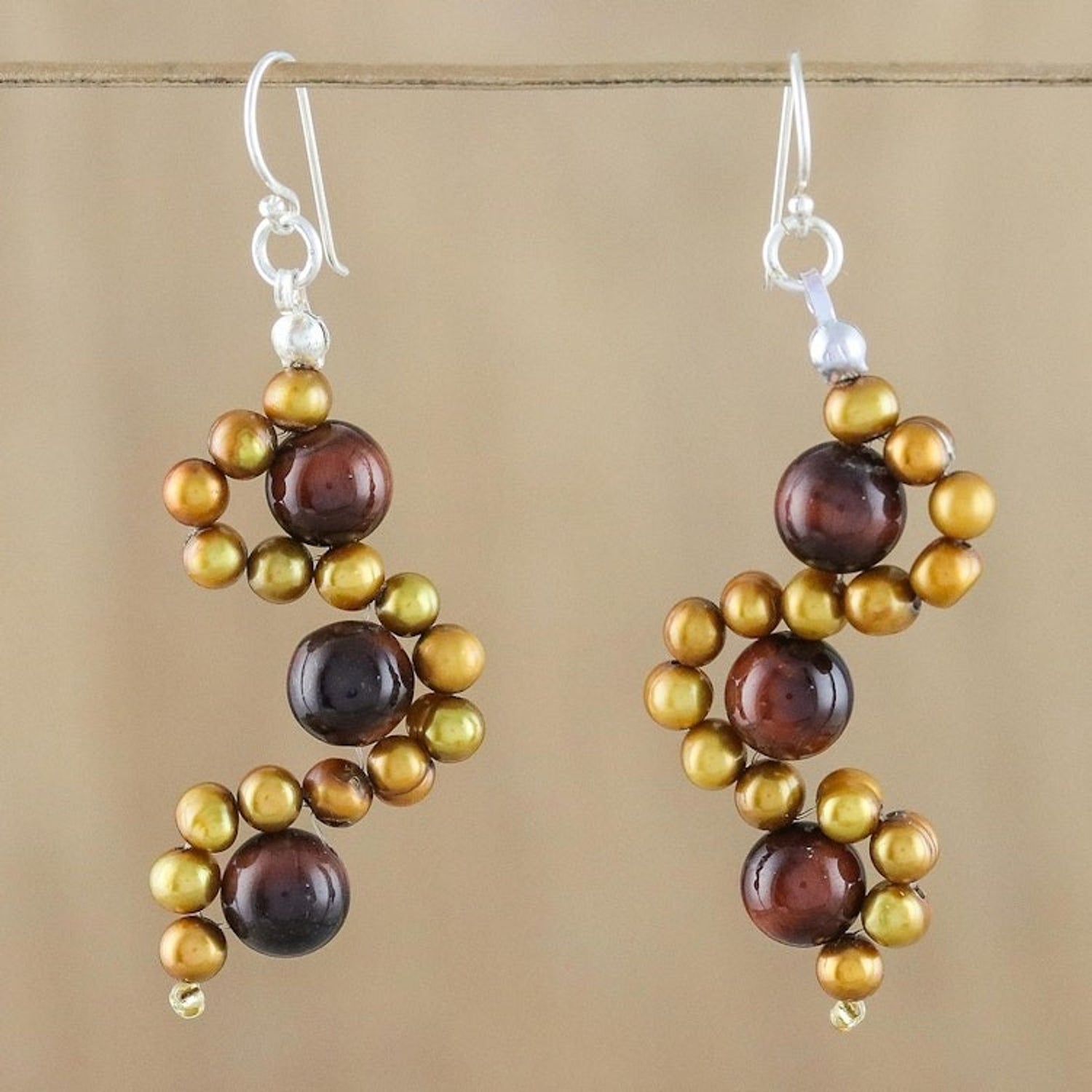 These 'Dancing Gems' earrings by Anusara Konkam are a fabulous accessory. Dancing waves of golden cultured pearl caress earthen tiger's eye in a fabulous pair of dangle earrings. Anusara designs this gleaming accessory, stringing the beads along stainless steel wire to hang from sterling silver hooks. This piece is a beautiful reflection of Anusara's dedication to preserving the artistic traditions of her region while giving back to her community.