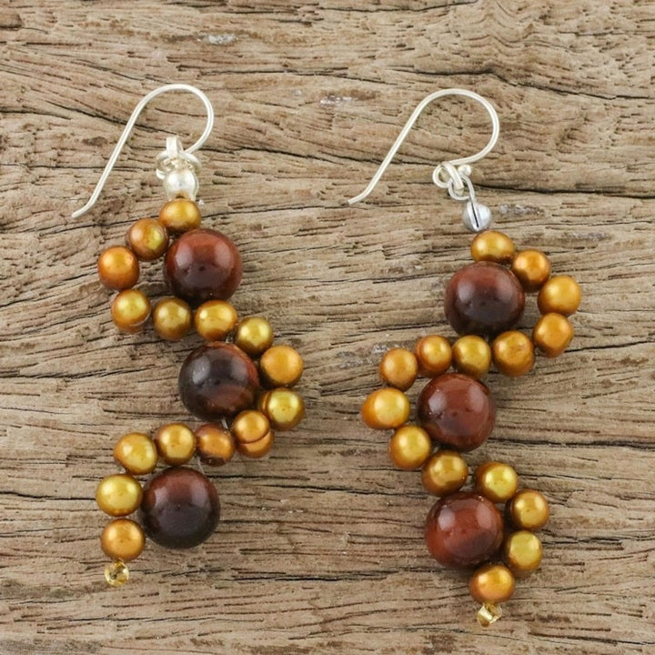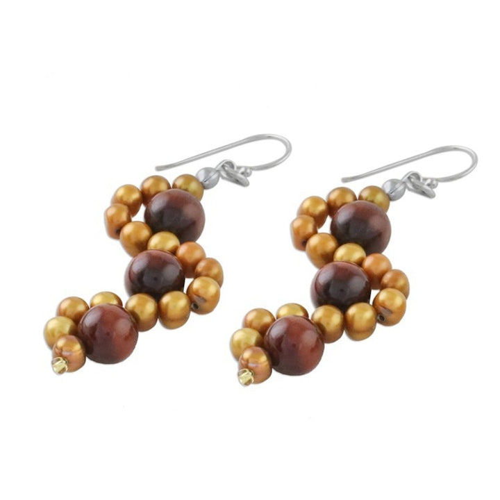 Tiger's Eye and Cultured Pearl Dangle Earrings from Thailand 'Dancing Gems'