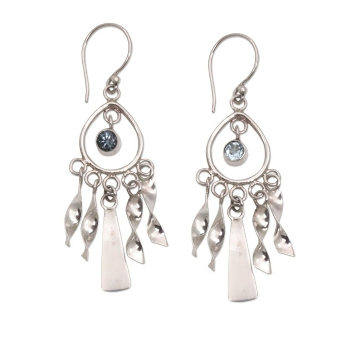 These 'Blue Wind Chime' earrings by Nyoman Sukartini are a beautiful accessory. Delicate sterling twists spin in the breeze, seeming to dance. Fashioned of silver, these earrings evoke shining wind chimes. Sparkling blue topaz adorns them. This piece is a beautiful reflection of Nyoman's dedication to creating sterling silver jewelry that honors Bali's cultural beauty.