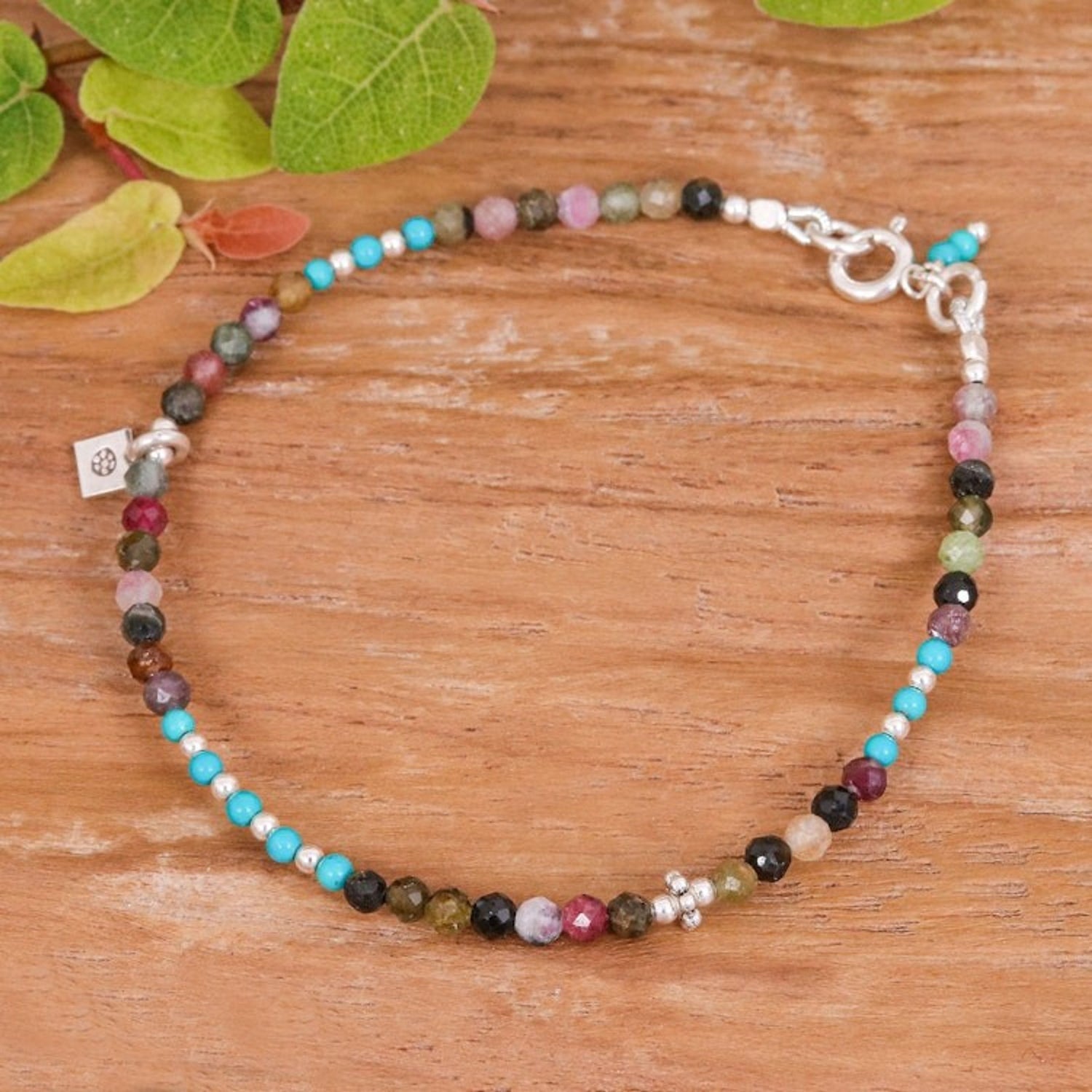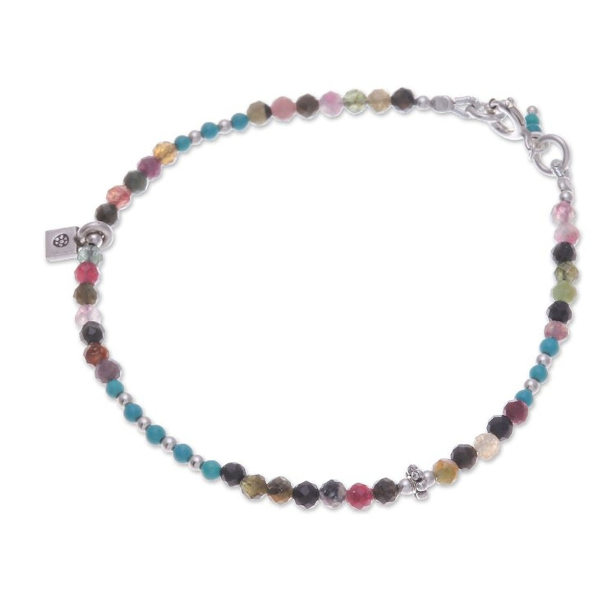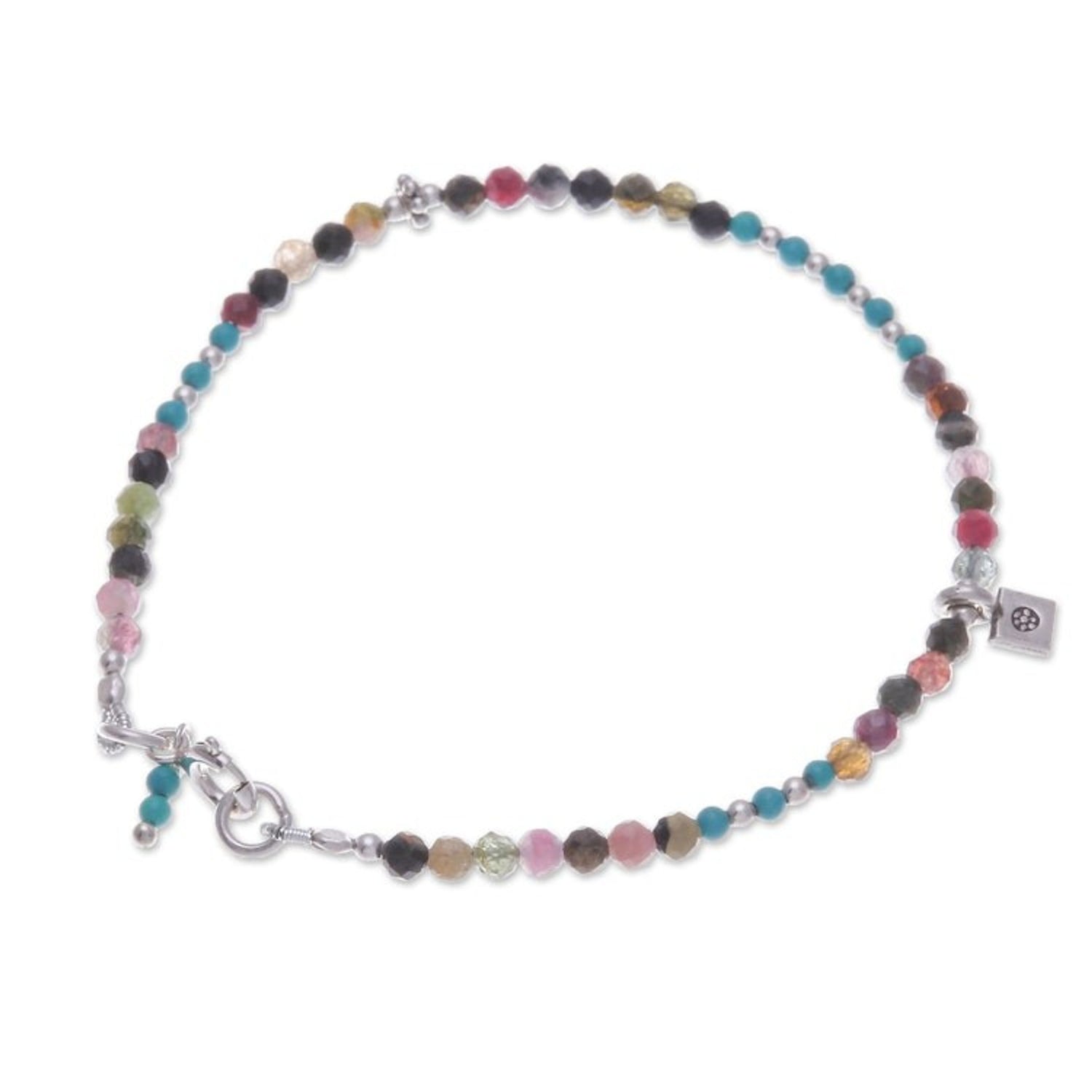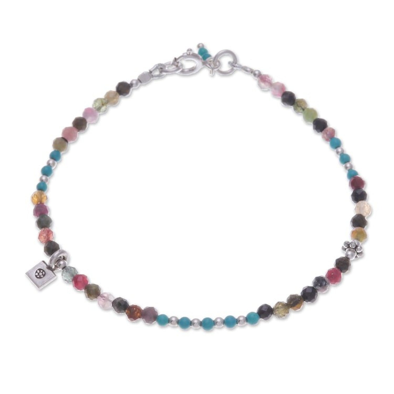 Handcrafted in Thailand from 950 silver charm, 925 sterling silver bead and clasp, tourmaline, and reconstituted turquoise, this charm bracelet has a length of 7 inches with a 3mm width. It has a combination finish and secures with a spring ring clasp. Please note that colors may vary slightly.