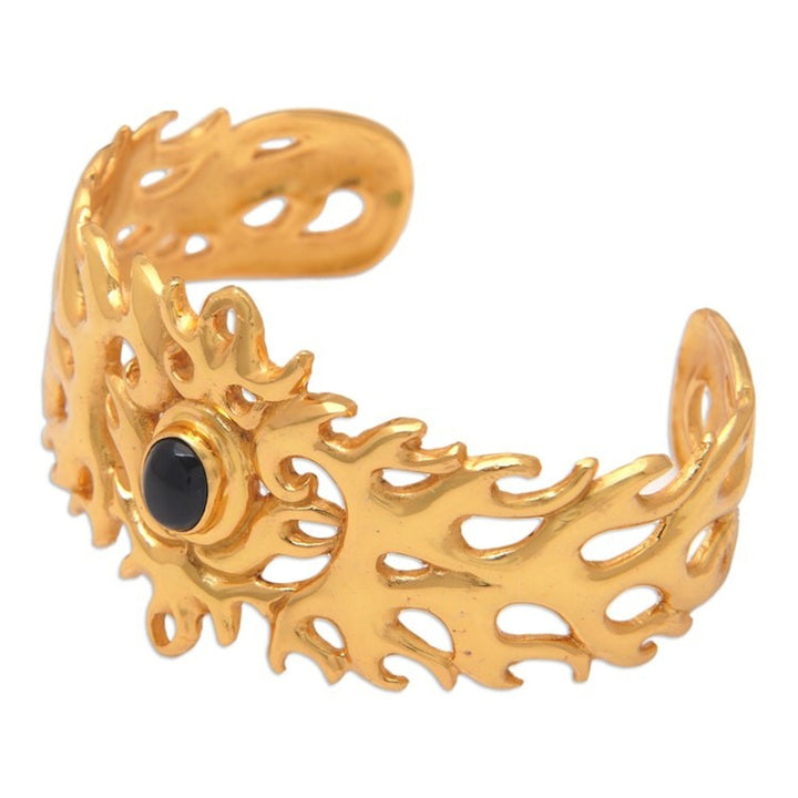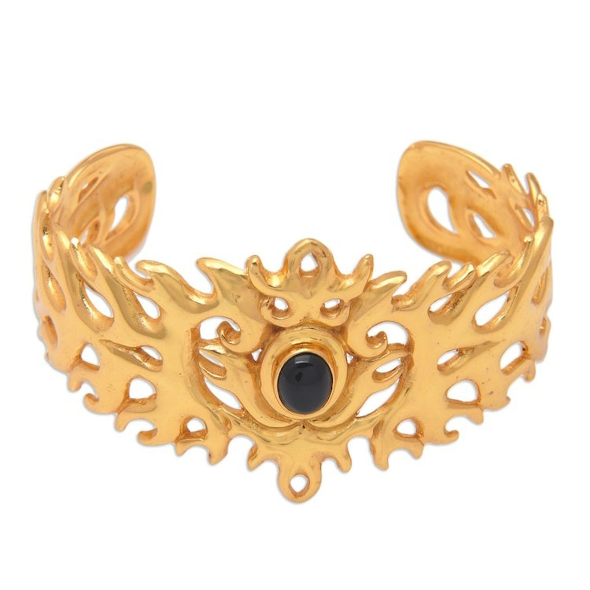 Traditional 22k Gold-Plated Cuff Bracelet with Onyx Cabochon 'Flaming Mysticism'