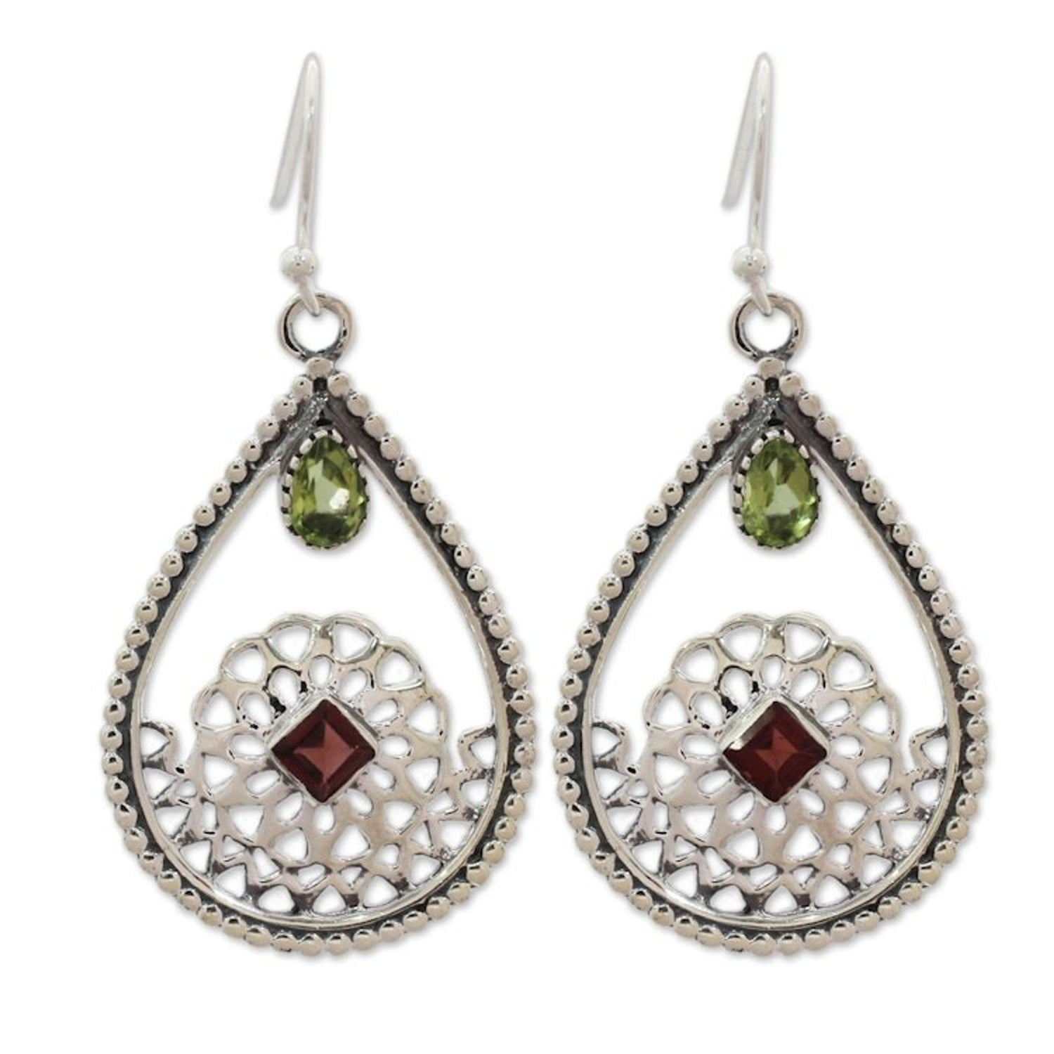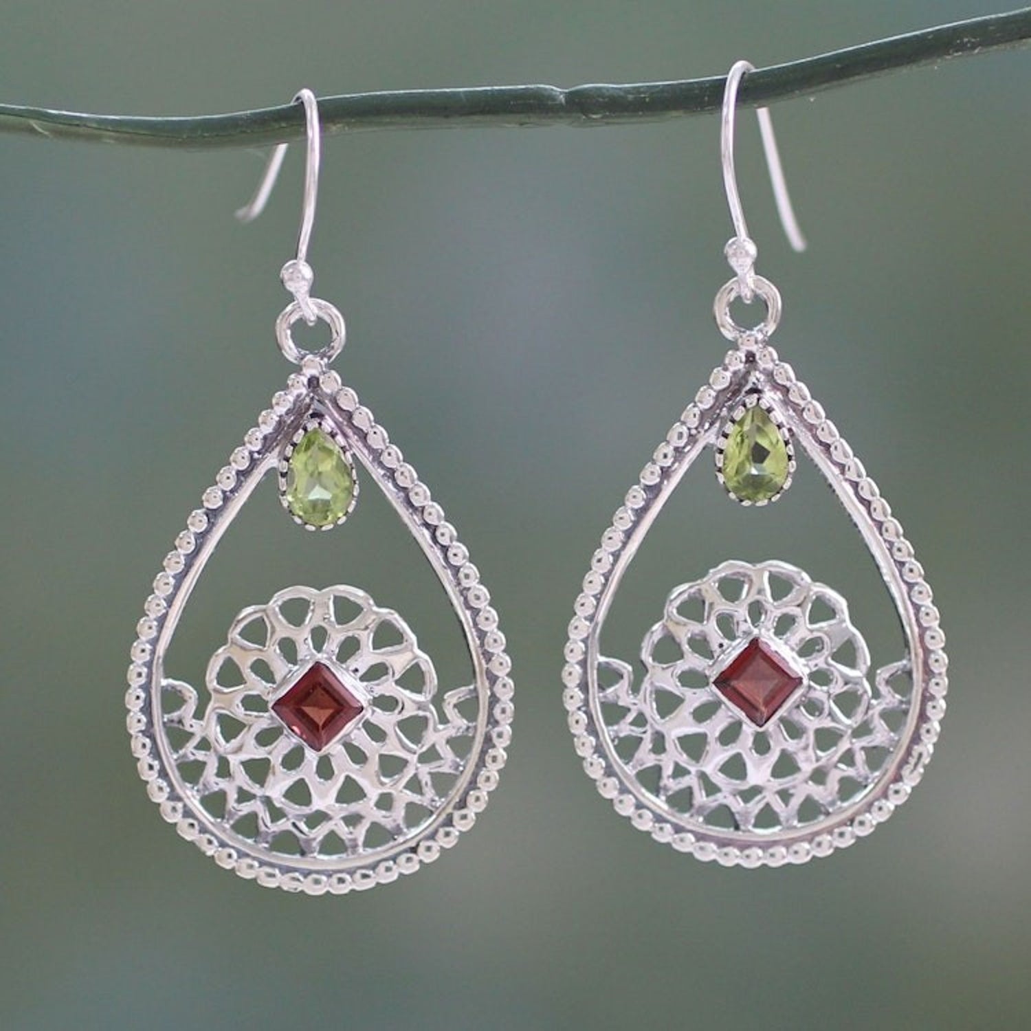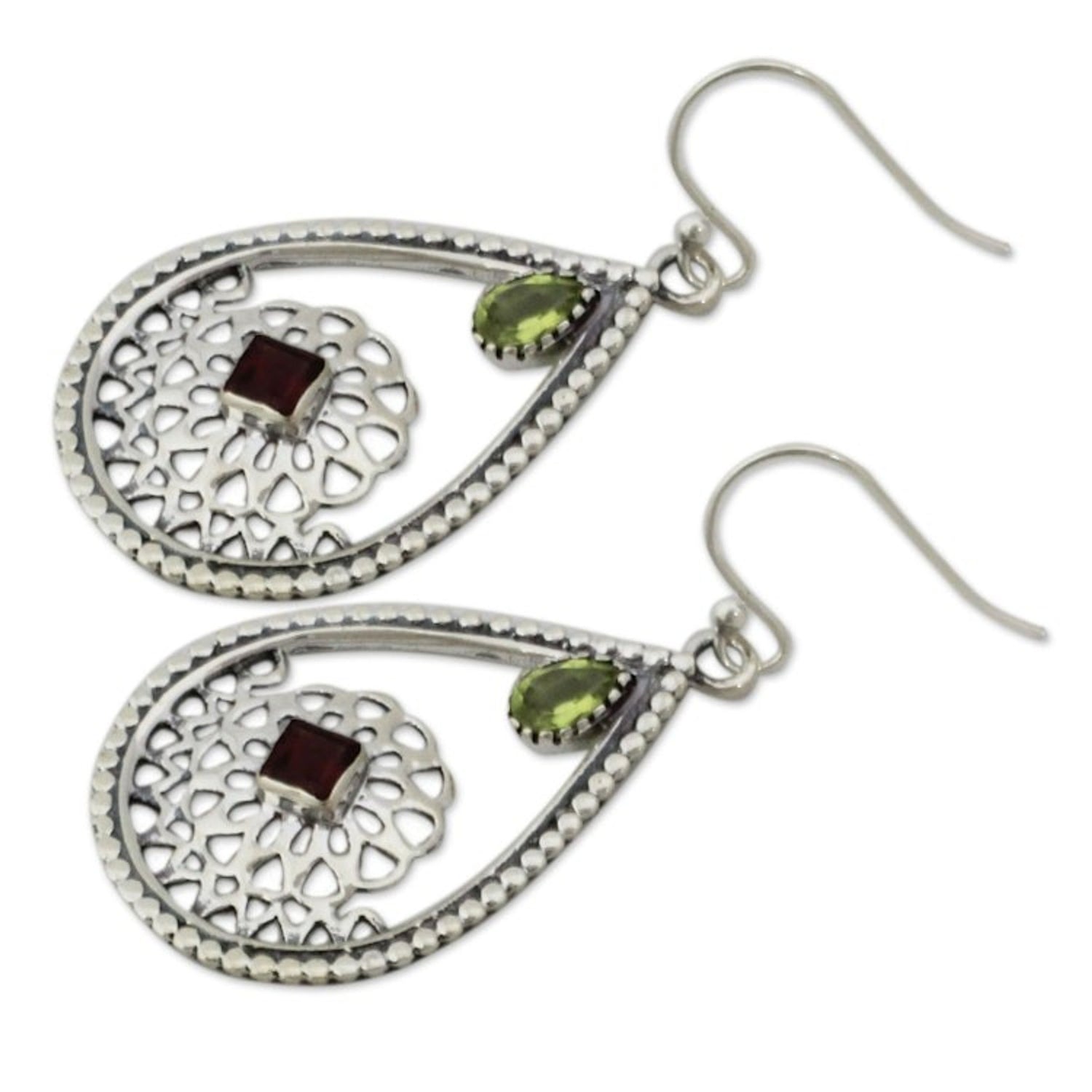 Handcrafted in India from sterling silver, peridot, and garnet, these earrings measure 1.9 inches in length and 1 inch in width. They have a high-polish finish and secure with hooks.