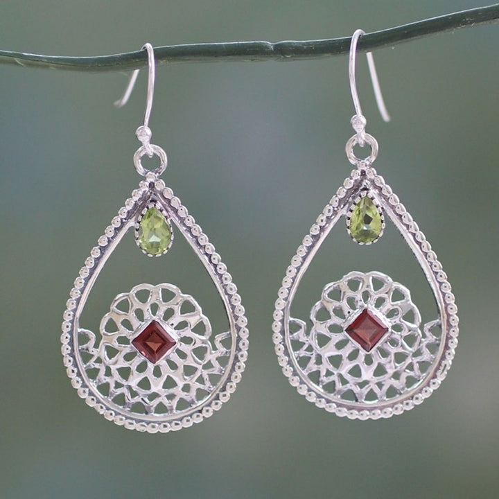 Traditional Indian Silver Earrings with Peridot and Garnet 'Jali Glamour'