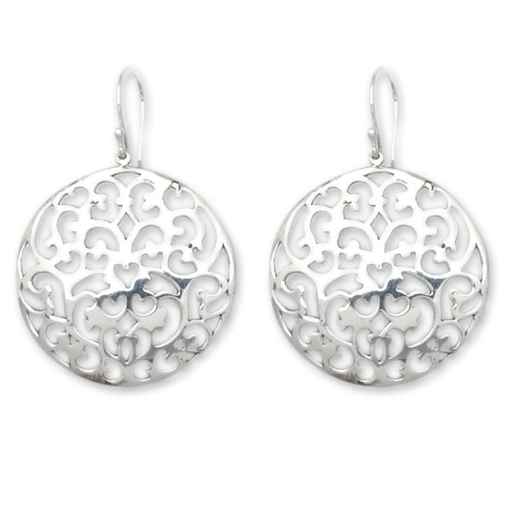 These 'Eden of Love' earrings by Griya Suarningsih are an exquisite accessory. Intricate vines appear to honor love in their discreet heart-shaped details. These round sterling silver dangle earrings feature a traditional leafy pattern typical of the region's classic jewelry, all in a high-polish finish that completes the design exquisitely. This piece is a beautiful reflection of Griya's dedication to preserving the spirit of traditional Balinese silversmithing.
