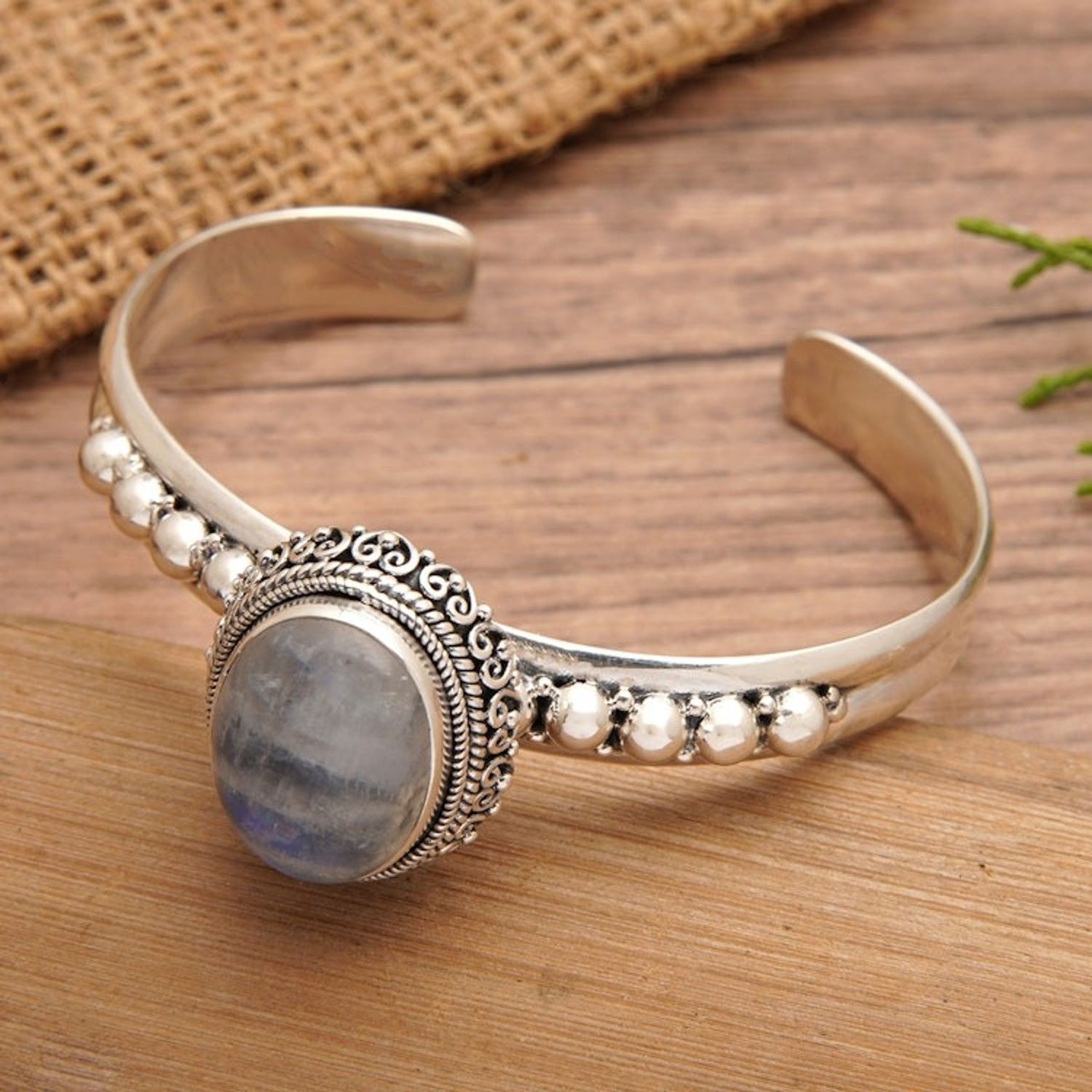 Traditional Natural Rainbow Moonstone Cuff Bracelet 'Queen Moonlight'
