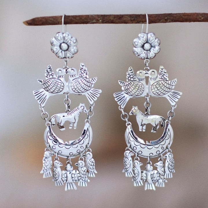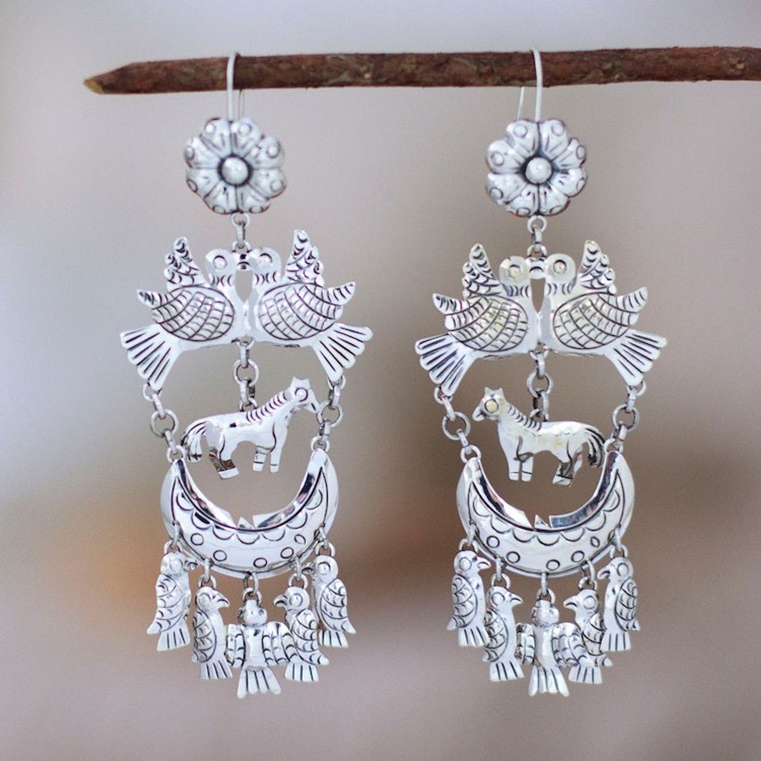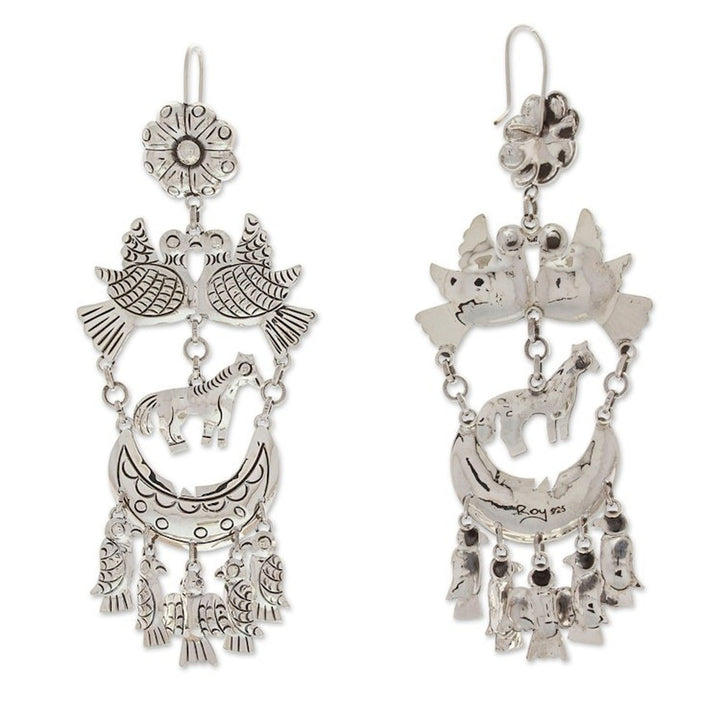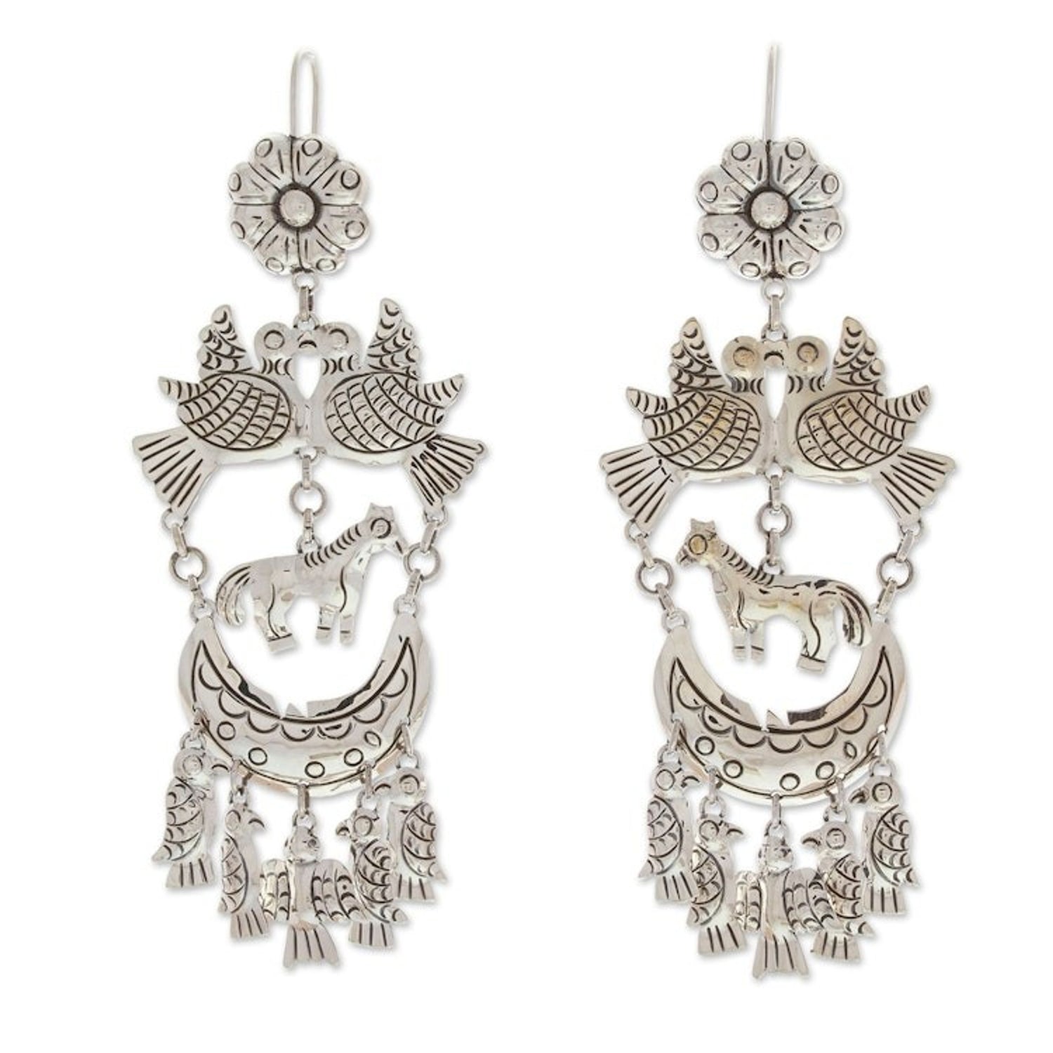 These 'My Paradise' earrings by Roy Nilson are a majestic accessory. Mexico's splendor forms a heavenly scene inspired by traditions and customs. Artisan Roy Nilson works with sterling silver and the classic Taxco silversmith to create these majestic chandelier earrings featuring bird, floral and horse motifs that form a unique celestial scene, which also adds a glimpse of Mexico's elegance to your ensembles. This piece is a beautiful reflection of Roy's dedication to creating jewelry that is a form of art.