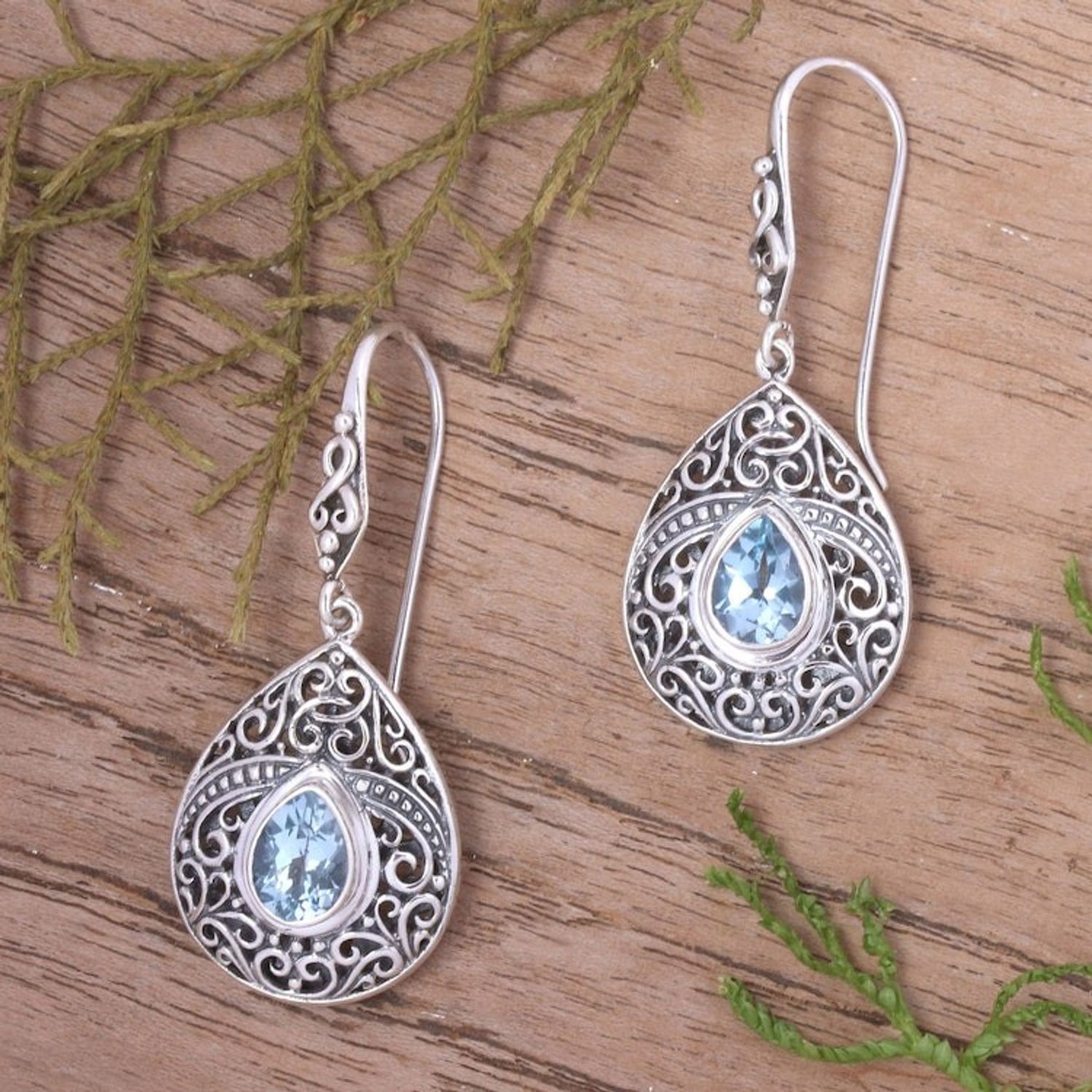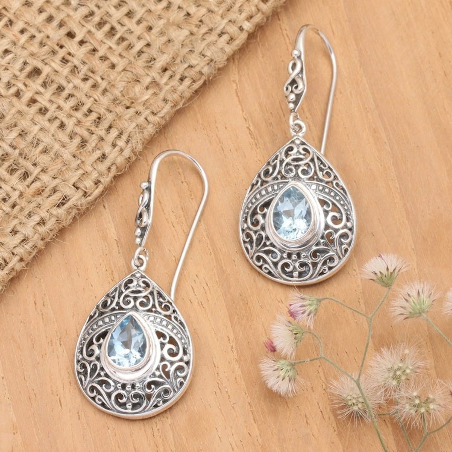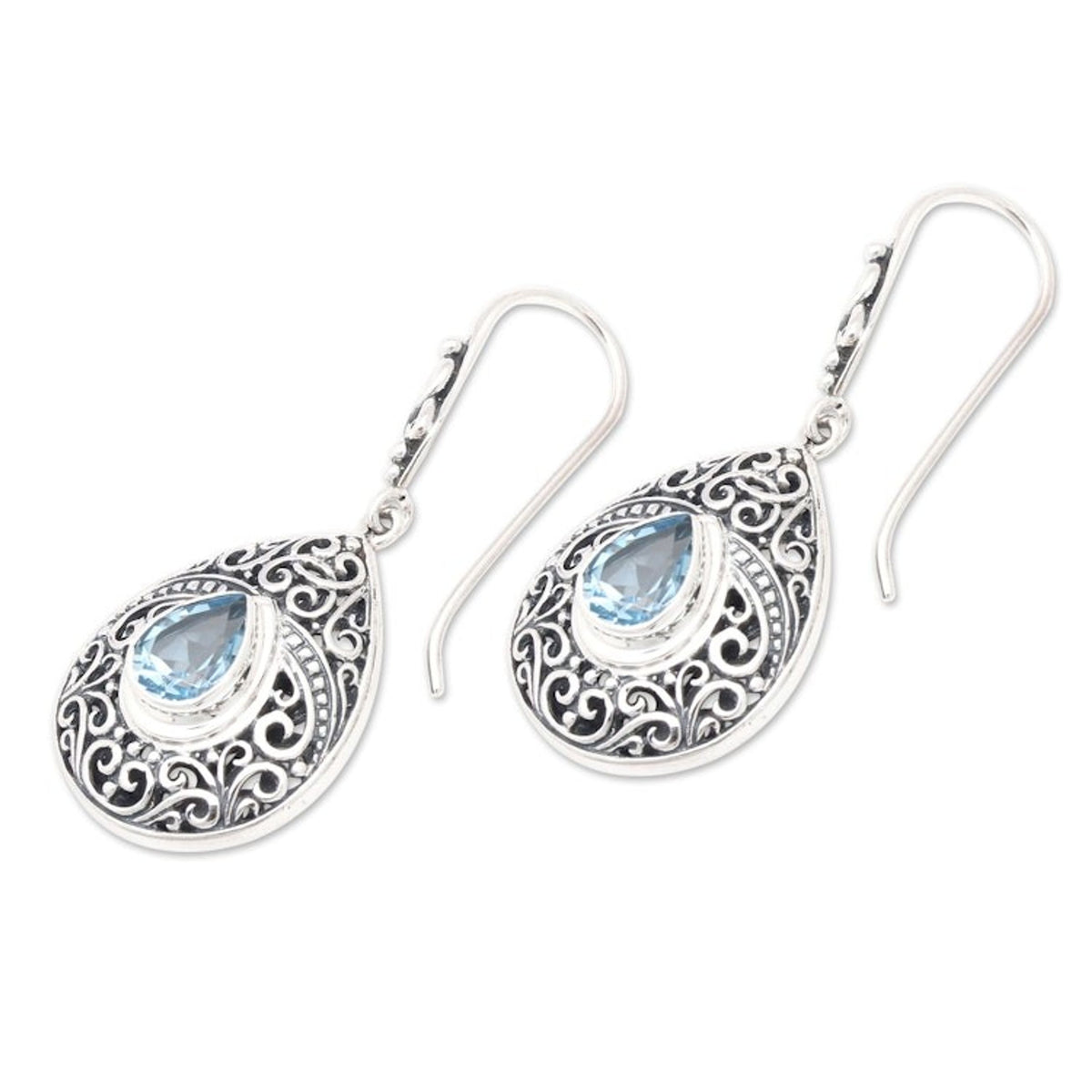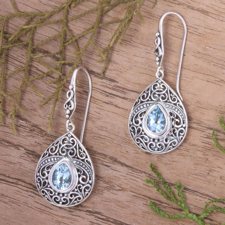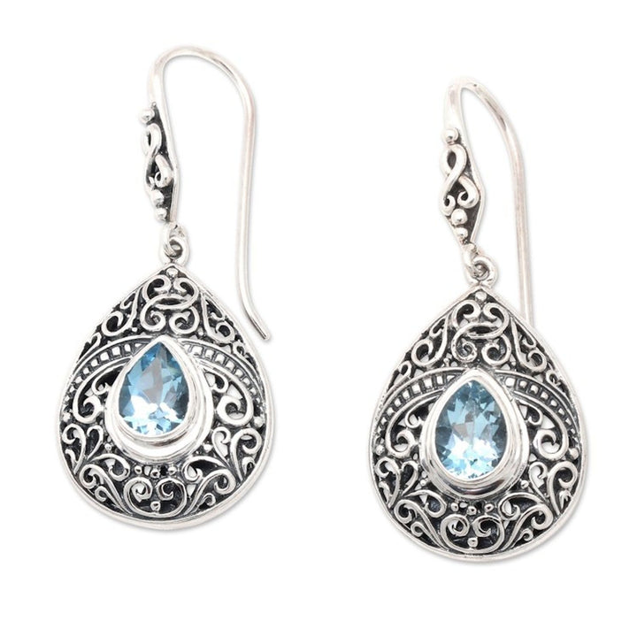 Handcrafted in Indonesia from 925 sterling silver and blue topaz, these dangle earrings measure 1.7 inches in length and 0.7 inches in width. They have a combination finish and secure with hooks. Please note that colors may vary slightly.