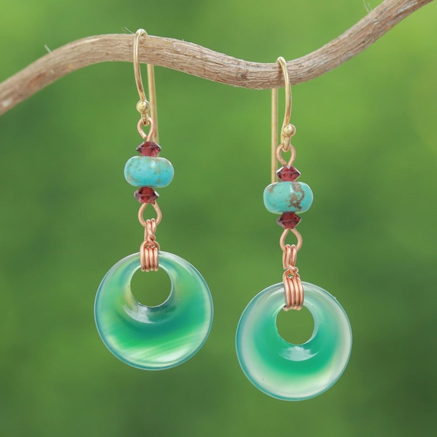 These 'Island Loops' earrings by Somluck Komolmith are a luxurious accessory. The colors of a paradisial island merge in these luxurious dangle earrings from Thailand. Artisan Somluck Komolmith represents the colors through green onyx, reconstituted turquoise and garnet gems, beautifully arranged on a copper structure that dangles from brass-plated sterling silver hooks. This piece is a beautiful reflection of Somluck's dedication to creating jewelry that embodies originality and care.