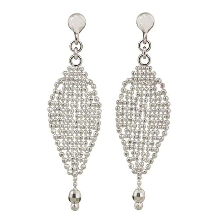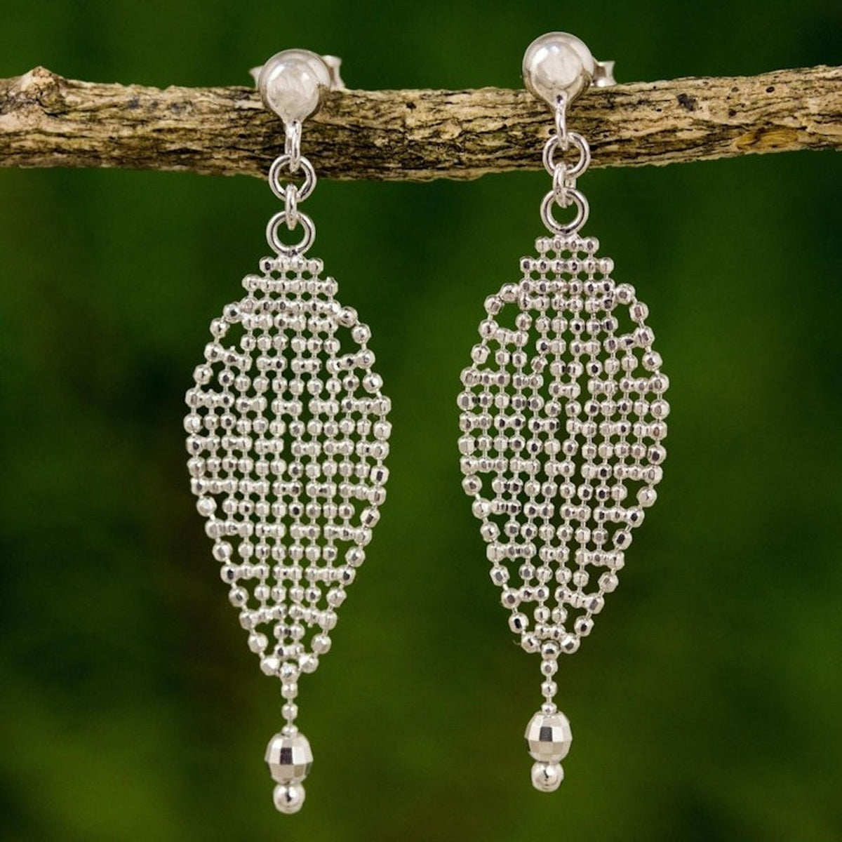 These 'Tulip Petal' earrings by Angels are a delightful accessory. These delightful earrings are inspired by the shape of tulip petals. The talented Thai artisan crafts her design in sterling silver, using diminutive ball chains in creative contemporary jewelry. This piece is a beautiful reflection of Angels' dedication to continuing her family legacy and supporting the artisans and communities who sustain Thailand’s silversmithing culture.