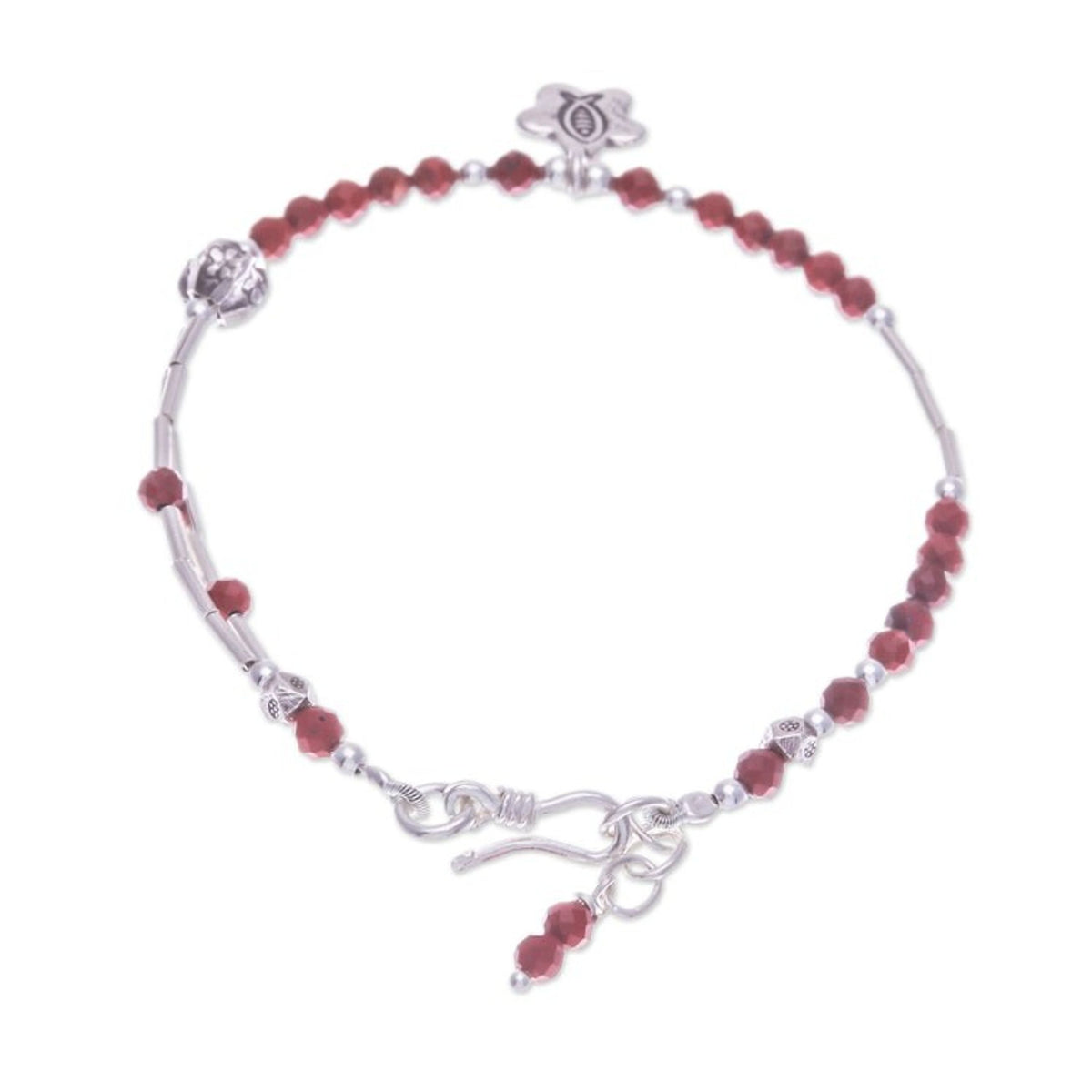 This 'Prosperous Strength' bracelet by Siranya is a charming accessory. Made with faceted jasper beads totaling over two carats and symbolizing inner strength, Siranya's charm bracelet combines the Hill Tribe's traditional metalwork with mysterious symbols. Local Thai artisans craft the piece by combining sterling silver and silver, all polished for a radiant look. As the main piece, a fish charm dangles from the accessory, inviting prosperity and abundance into your life. This piece is a beautiful reflection of Siranya's dedication to creating jewelry that blends artistry with lived experience.