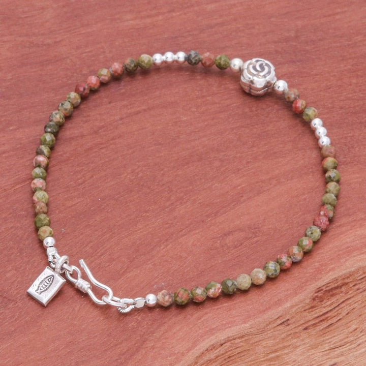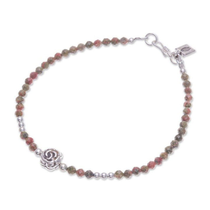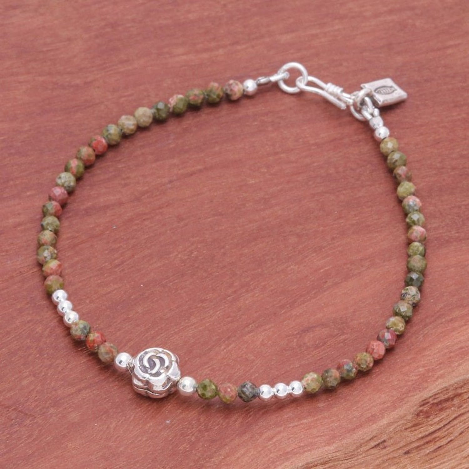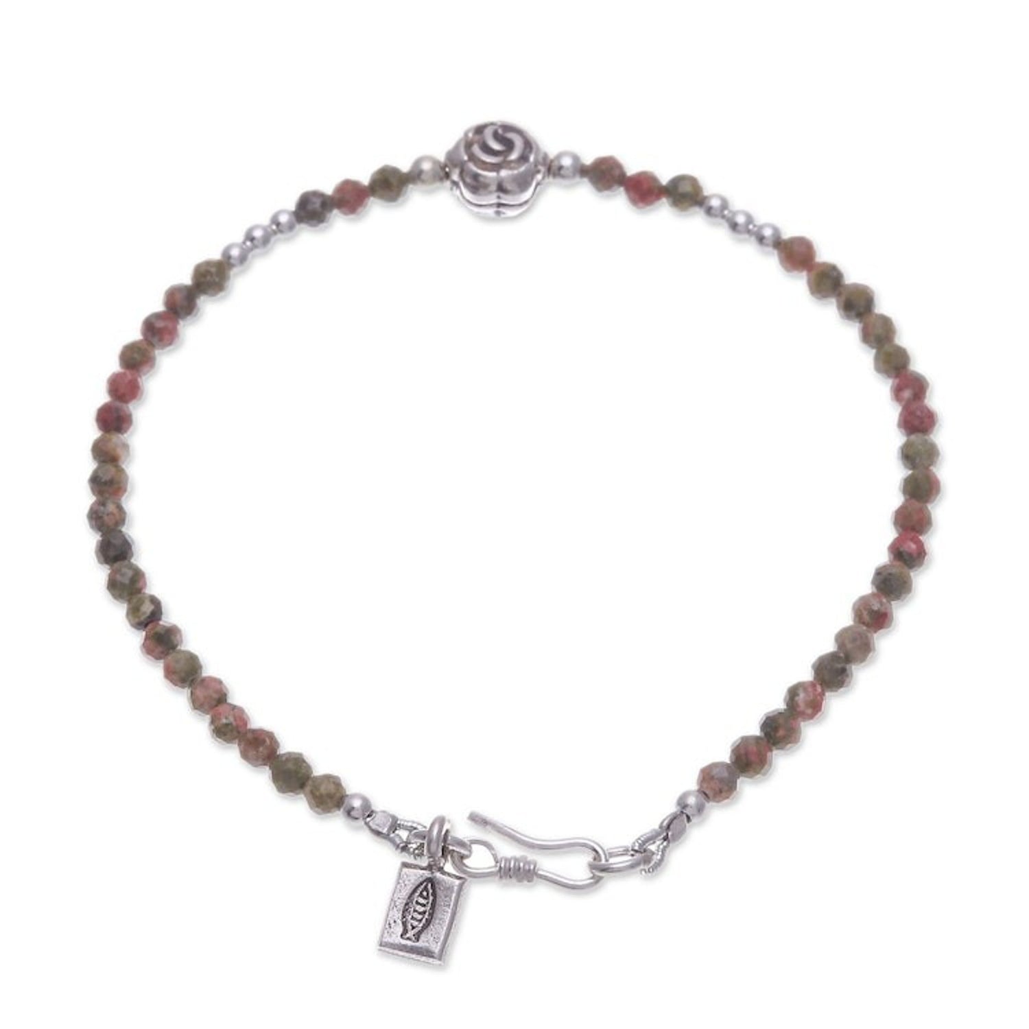 Handcrafted in Thailand from unakite, 925 sterling silver beads, and a 950 silver center bead and clasp, this beaded bracelet measures 7 inches in length. It has a combination finish and secures with an s-hook or hook clasp. Please note that the color and variegation of the stone will vary.