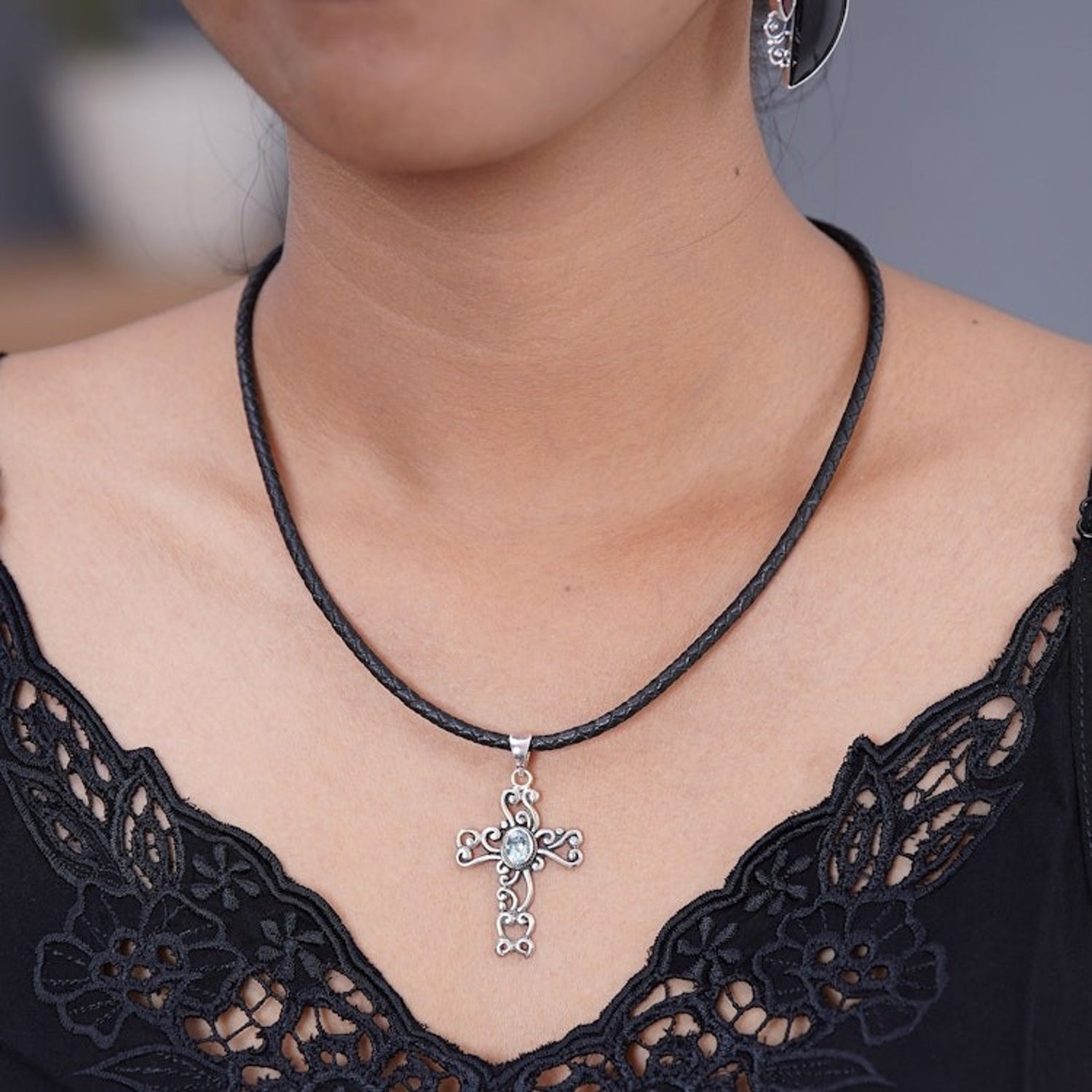 Unique Indonesian Sterling Silver and Blue Topaz Necklace 'Balinese Cross'
