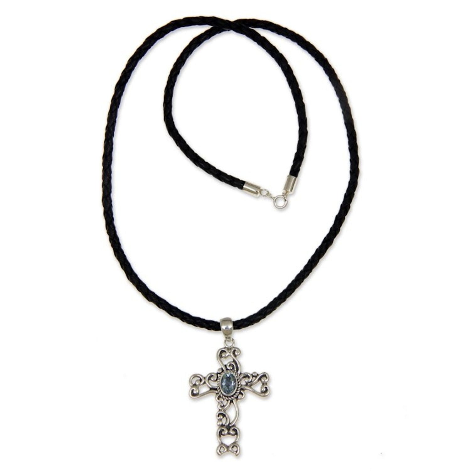 This 'Balinese Cross' necklace by Kenari is a beautiful accessory. Balinese tradition is evident in this sterling silver cross. Kenari entwines gleaming tendrils to evoke the floral wealth of the island. Centered with a blue topaz oval, the pendant is worn on a braided leather necklace. This piece is a beautiful reflection of Kenari's dedication to infusing each piece with creativity and perseverance while balancing tradition with innovation.