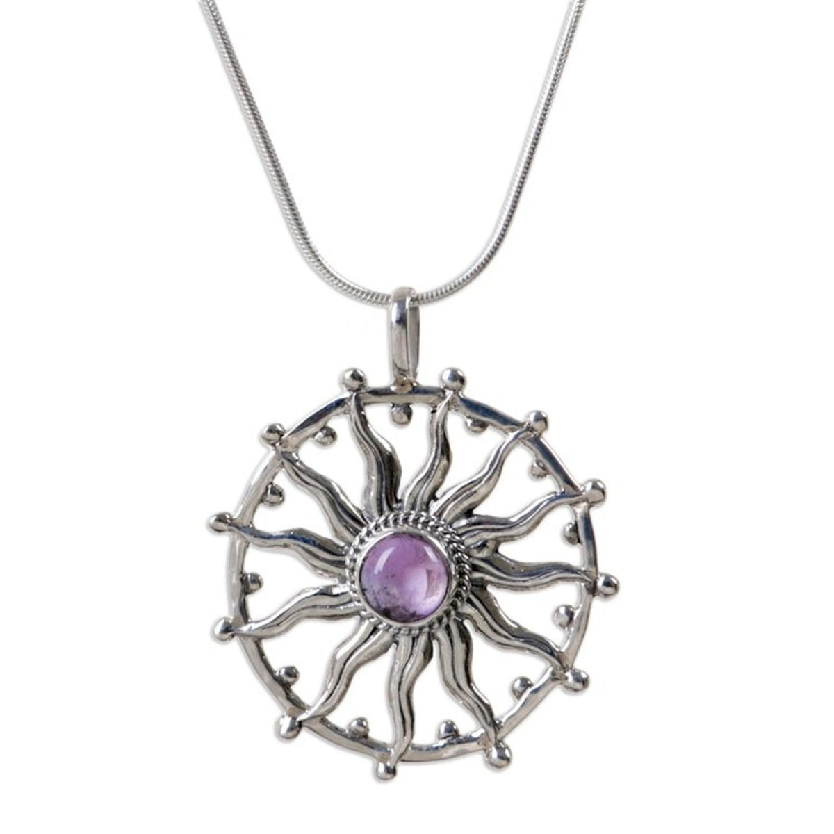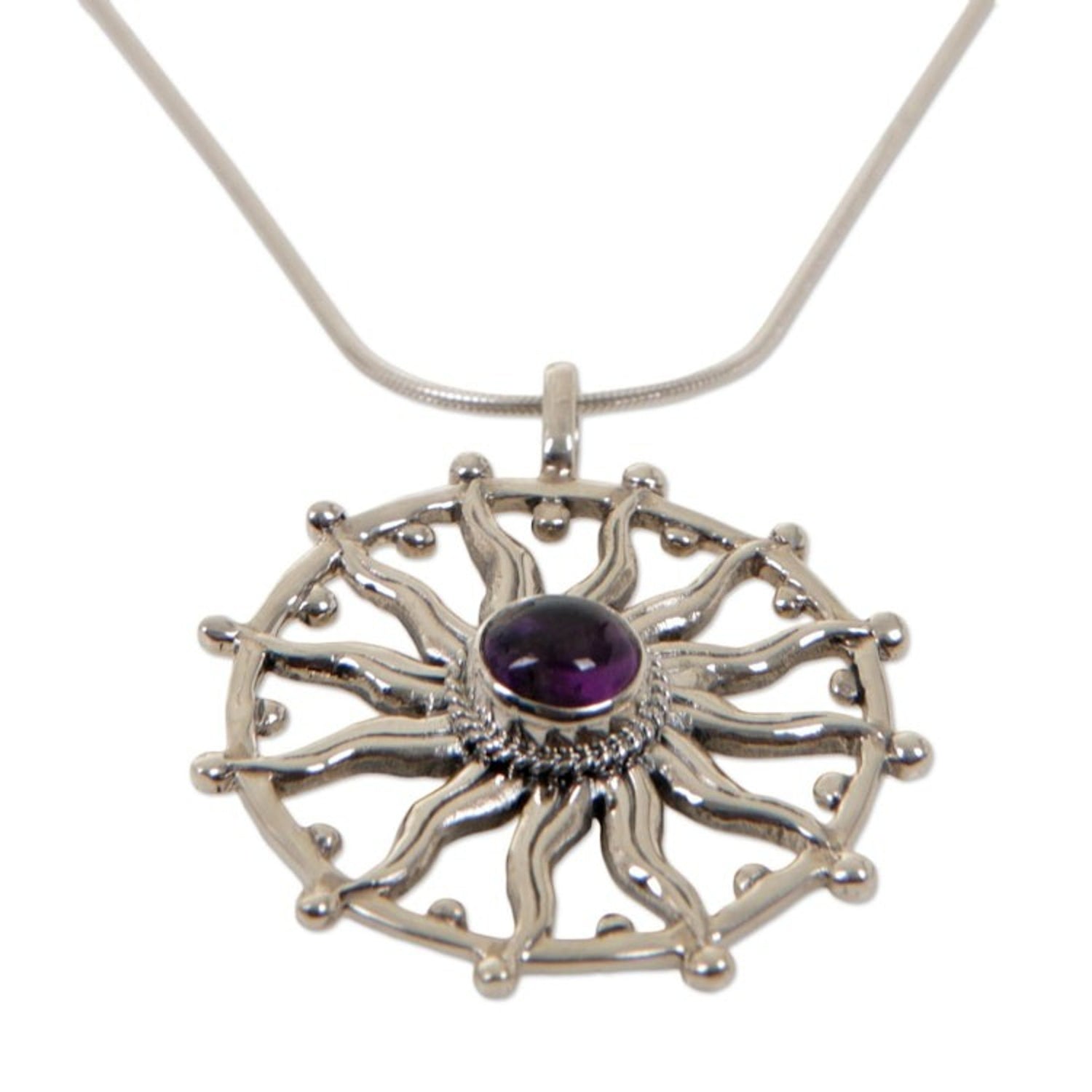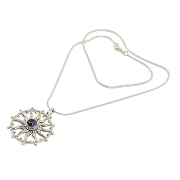 This Unique Silver and Amethyst Necklace 'Sun Spirit' by Independent Artisans captures the luminous energy of a dancing sun. Artisan Nyoman Rena, a third-generation Balinese craftsman, blends his woodcarving skills with metalwork to create this dazzling piece. The design features seamless sterling silver rays that radiate from a central, smooth amethyst hemisphere. A symbol of positive energy and vitality, this necklace is an enchanting piece that blends Balinese heritage with contemporary design, sharing the artistry of Bali with the world.