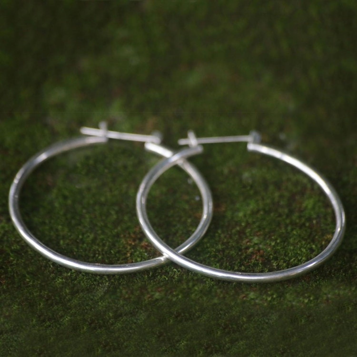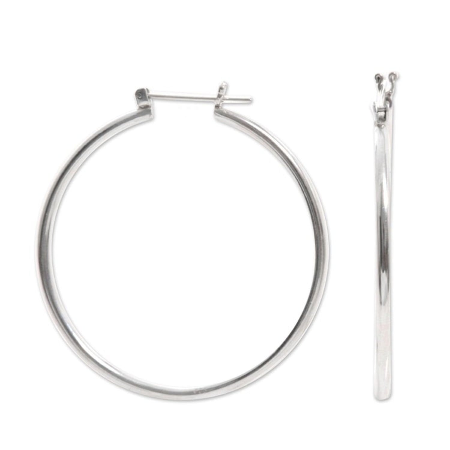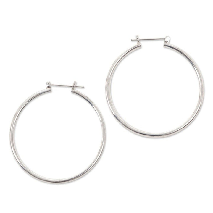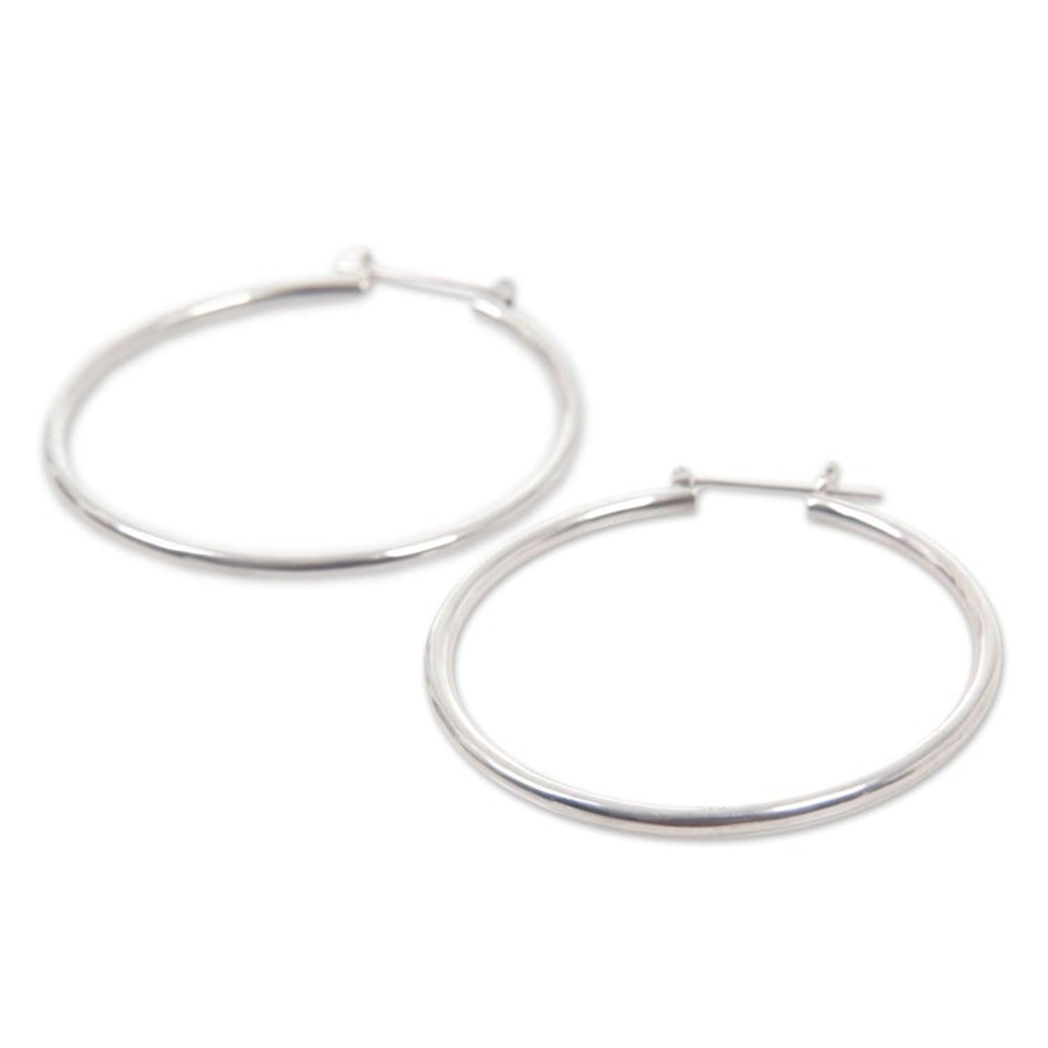 These Unique Sterling Silver Hoop Earrings 2 Inch 'Moonlit Goddess' by Independent Artisans are a timeless classic elevated with a touch of mystical lore. Crafted by hand by Balinese artisan Nyoman Rena, these fashionable hoops feature a high-polish sterling silver finish. Inspired by the belief that silver is consecrated to the Moon Goddess and has a soothing effect, these earrings are both a staple accessory and a meaningful adornment that embodies the artisan's vision of blending tradition with contemporary design.