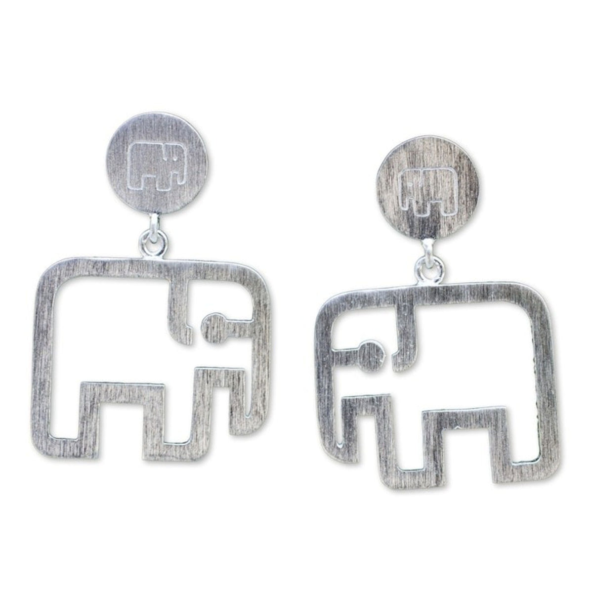 Unique Than Brushed Sterling Silver Dangle Earrings 'Elephant Encounter'