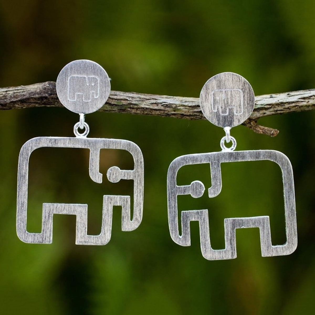 These Unique Than Brushed Sterling Silver Dangle Earrings 'Elephant Encounter' by Independent Artisans are a delicate balance of modern appeal and Thai artistry. Designed by Jantana, who grew up in a family of jewelers, these earrings depict elegant sterling silver elephants, a symbol of strength and wisdom. The brushed satin finish and original handcrafted design reflect both her personal style and her commitment to preserving her parents' legacy, creating a piece that shares joy and beauty with the world.