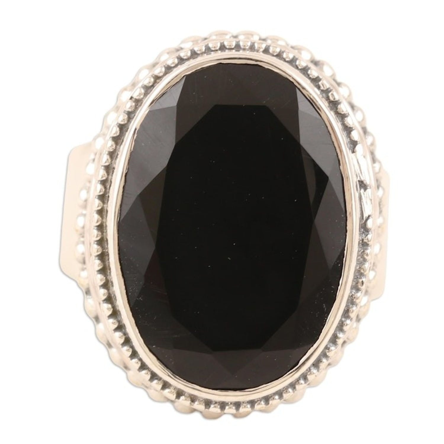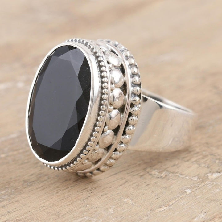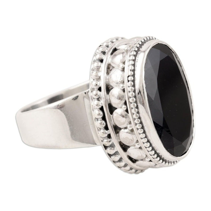 This Unisex Sterling Silver and Onyx Cocktail Ring 'Midnight Gloss' by Independent Artisans is a bold and elegant statement piece. Designed by Chintan, a third-generation jeweler from Mumbai, this ring perfectly fuses contemporary style with timeless Indian craftsmanship. A large, faceted black onyx gem in a bezel setting catches the light, surrounded by a shimmering sterling silver dot motif. The combination of artistry and tradition makes this ring a perfect expression of both heritage and modern design.