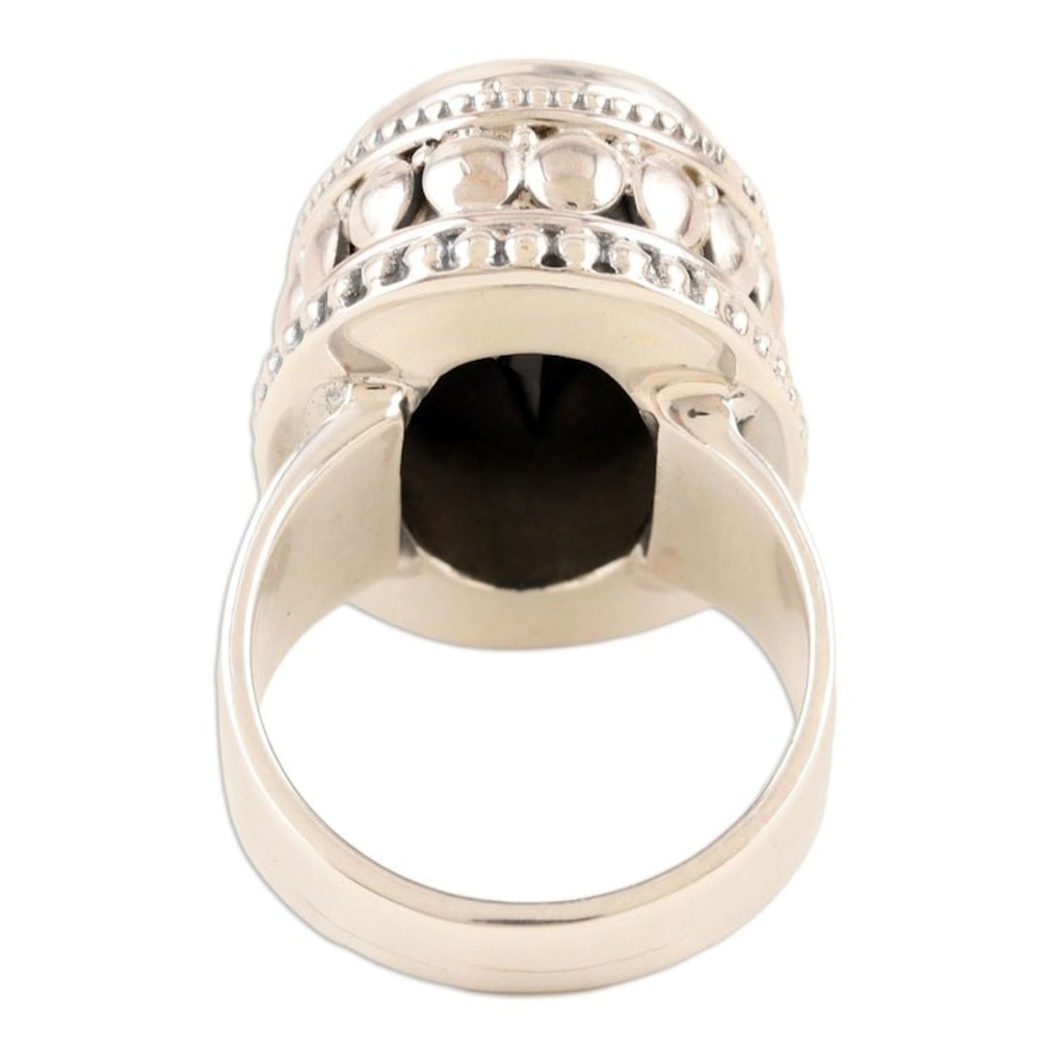 Handcrafted from 925 sterling silver and onyx with a combination finish, this ring has a band width of 4mm and a front that measures 0.9 inches L x 0.6 inches W x 0.4 inches H.
