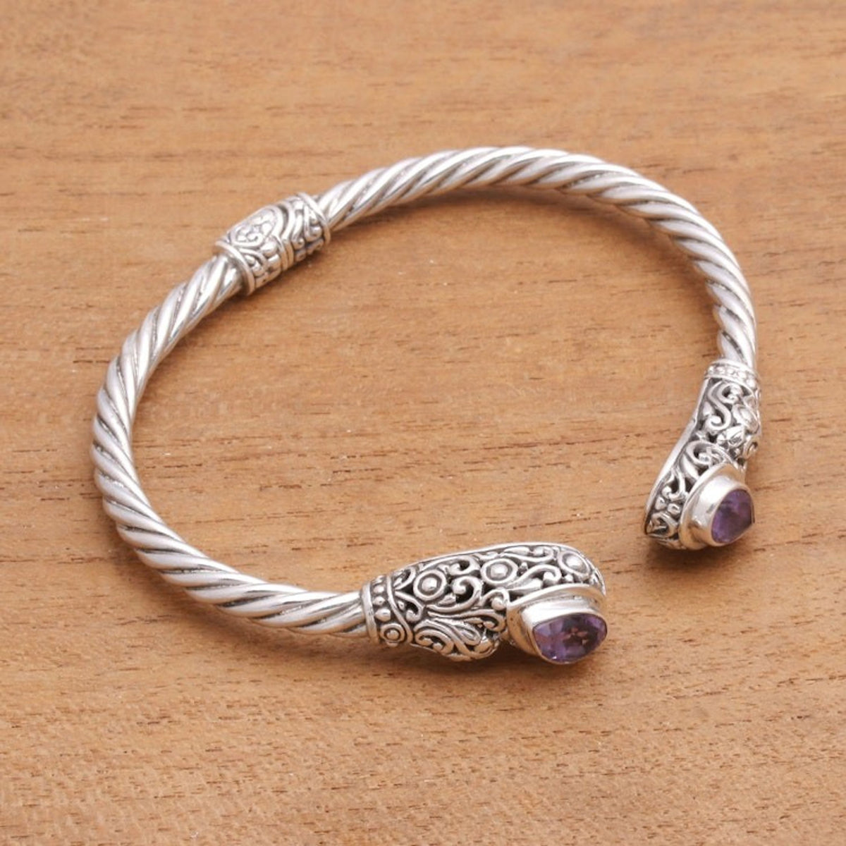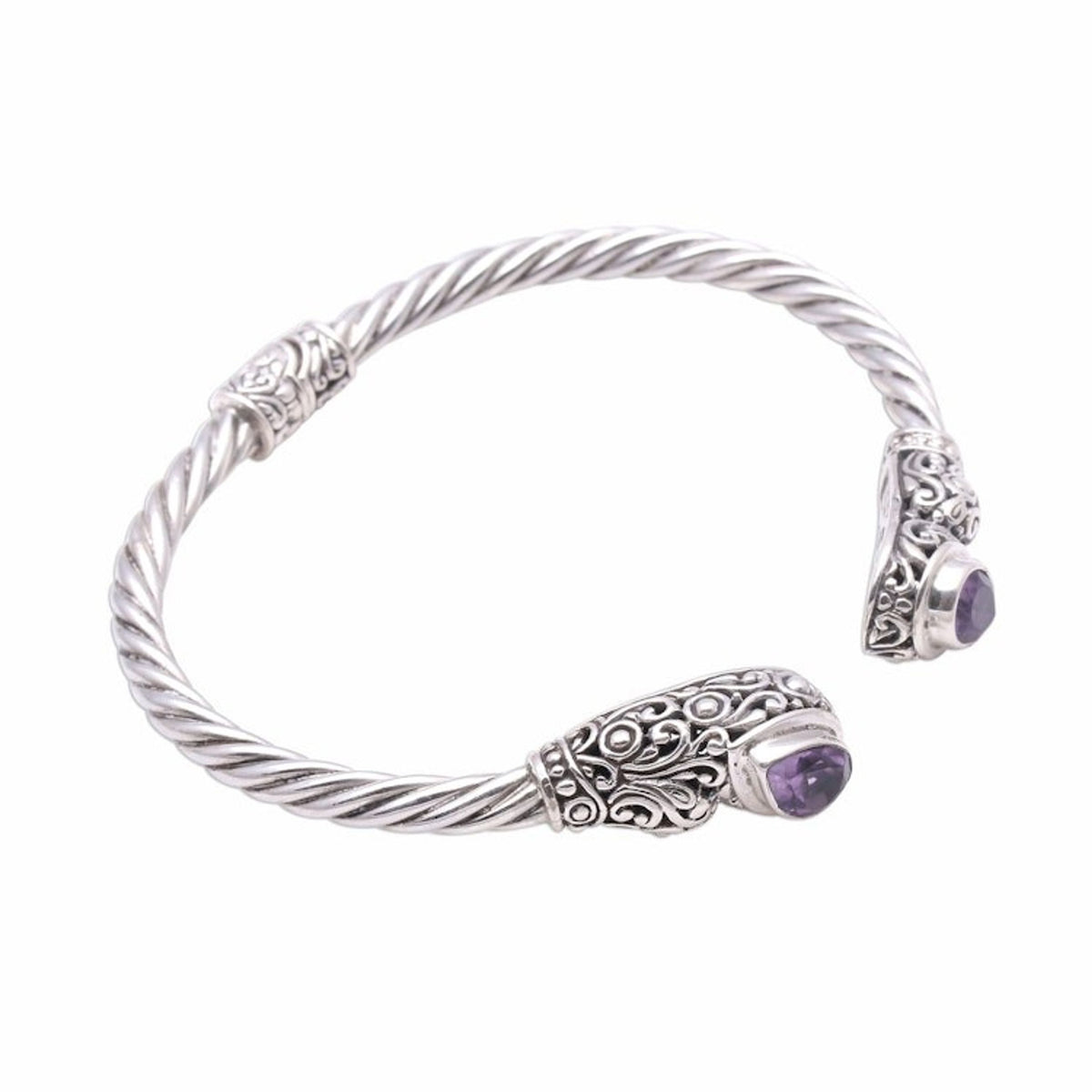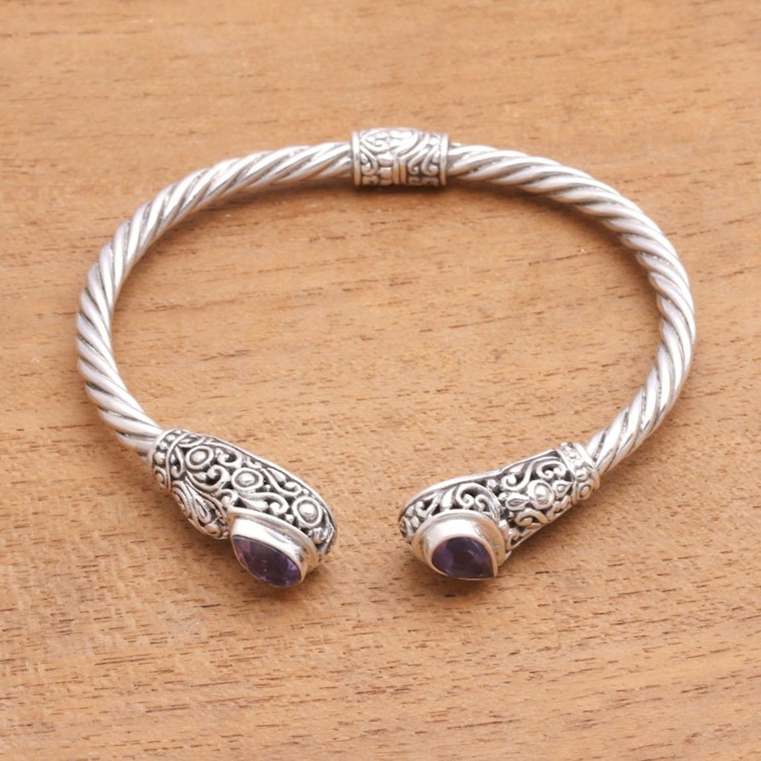 This Vine Pattern Amethyst Cuff Bracelet from Bali 'Vine Inspiration' by Independent Artisans is a celebration of Indonesia’s rich biodiversity and a tribute to family legacy. Artisan Giri Tasmana, son of a featured jeweler, creates this rope-pattern cuff bracelet with intricate openwork patterns inspired by vines. The sterling silver is beautifully finished with teardrop amethyst gems, each weighing 2.5 carats. The bracelet's concealed hinge offers a secure and comfortable fit, making it a modern approach to Balinese artistry.