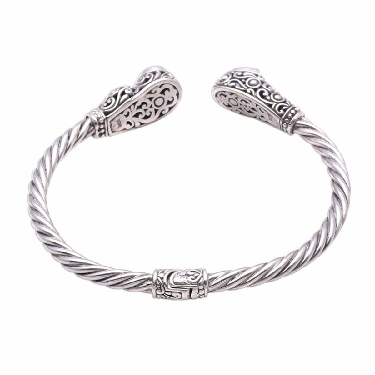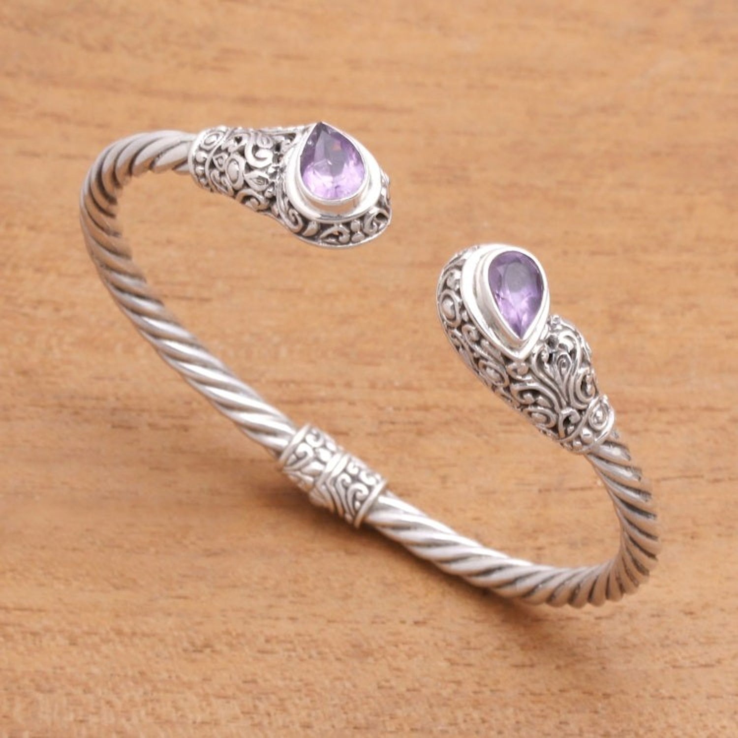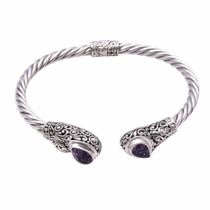 This Vine Pattern Amethyst Cuff Bracelet from Bali 'Vine Inspiration' by Independent Artisans is a celebration of Indonesia’s rich biodiversity and a tribute to family legacy. Artisan Giri Tasmana, son of a featured jeweler, creates this rope-pattern cuff bracelet with intricate openwork patterns inspired by vines. The sterling silver is beautifully finished with teardrop amethyst gems, each weighing 2.5 carats. The bracelet's concealed hinge offers a secure and comfortable fit, making it a modern approach to Balinese artistry.