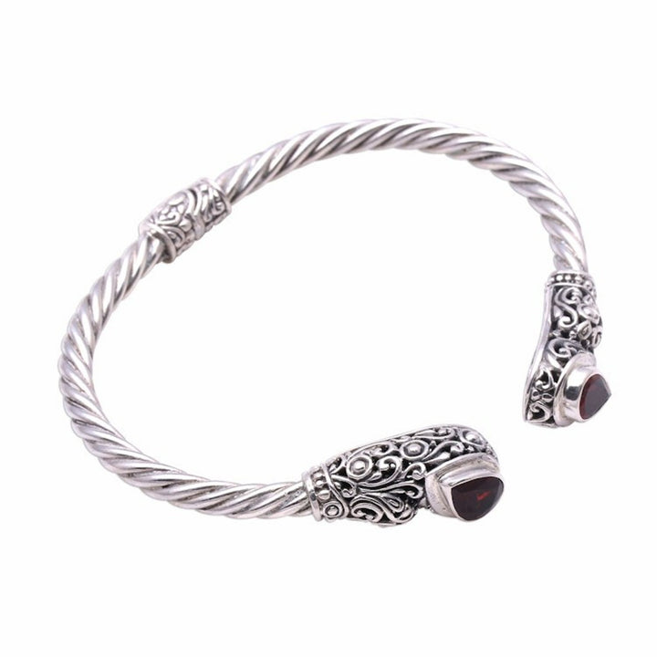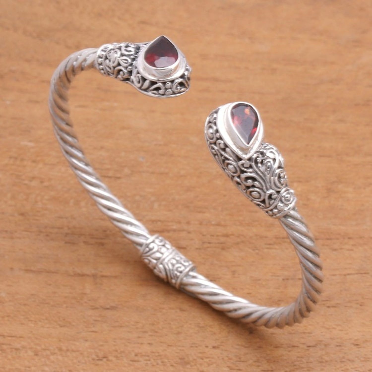 This Vine Pattern Garnet Cuff Bracelet from Bali 'Vine Inspiration' by Independent Artisans is a unique expression of nature’s beauty and a homage to traditional Balinese artistry. Giri Tasmana, an independent-spirited artisan, crafts this sterling silver rope-pattern cuff with intricate vine openwork. The ends of the bracelet are adorned with two teardrop garnet gems totaling 2.5 carats, a powerful reflection of his commitment to preserving nature’s beauty through design and carrying forward his family’s legacy.