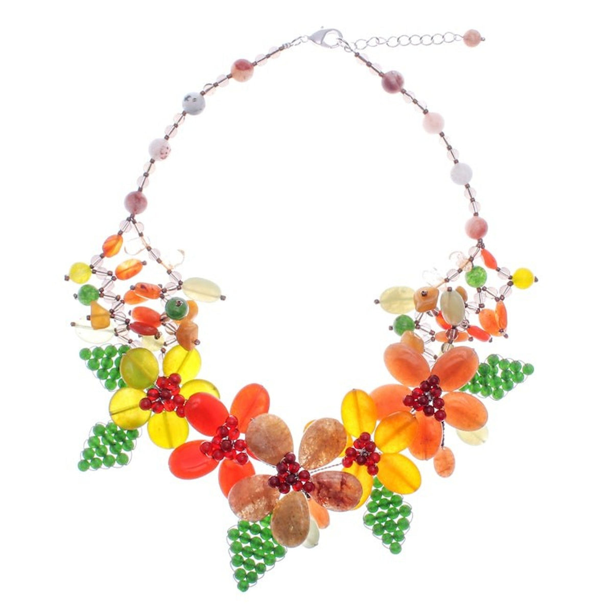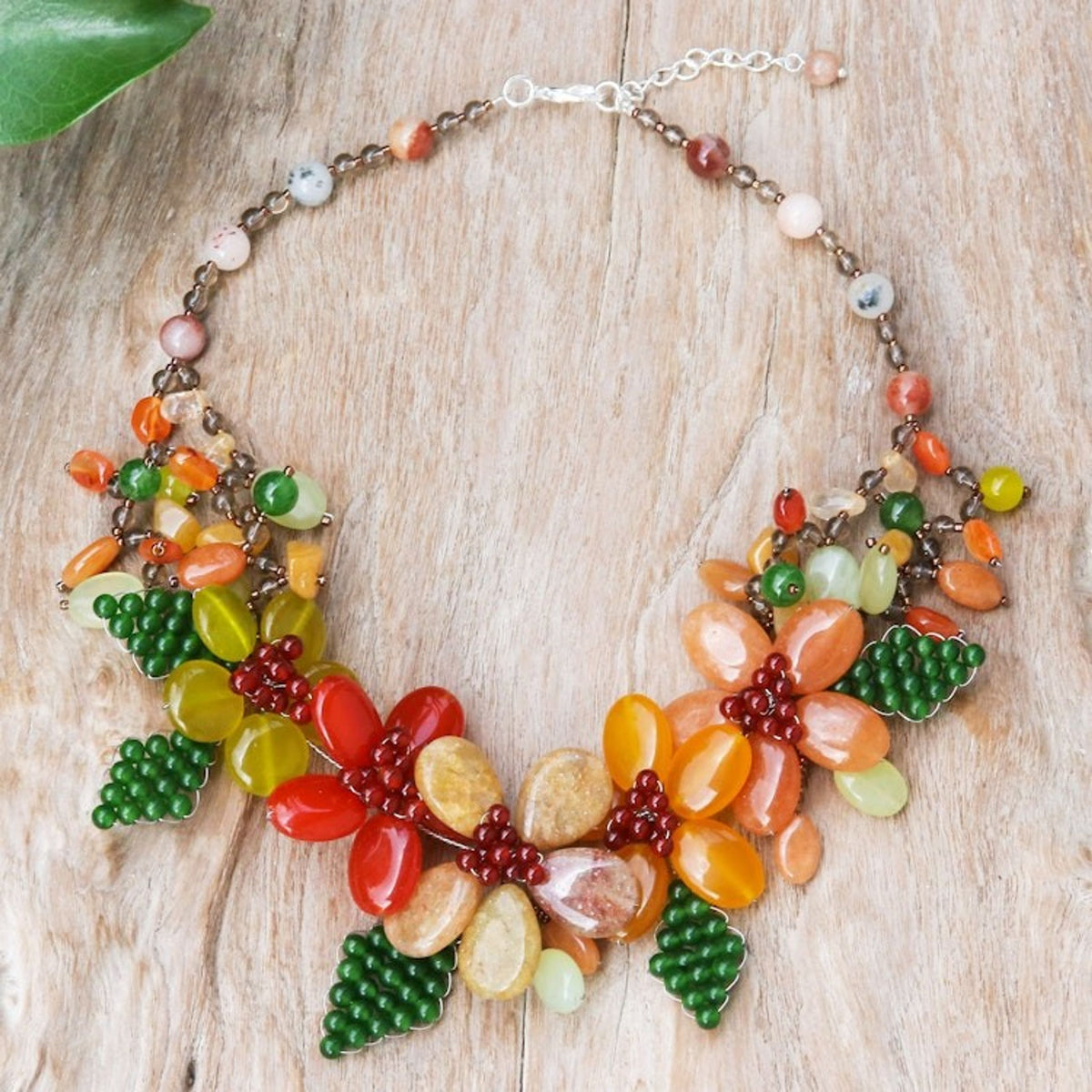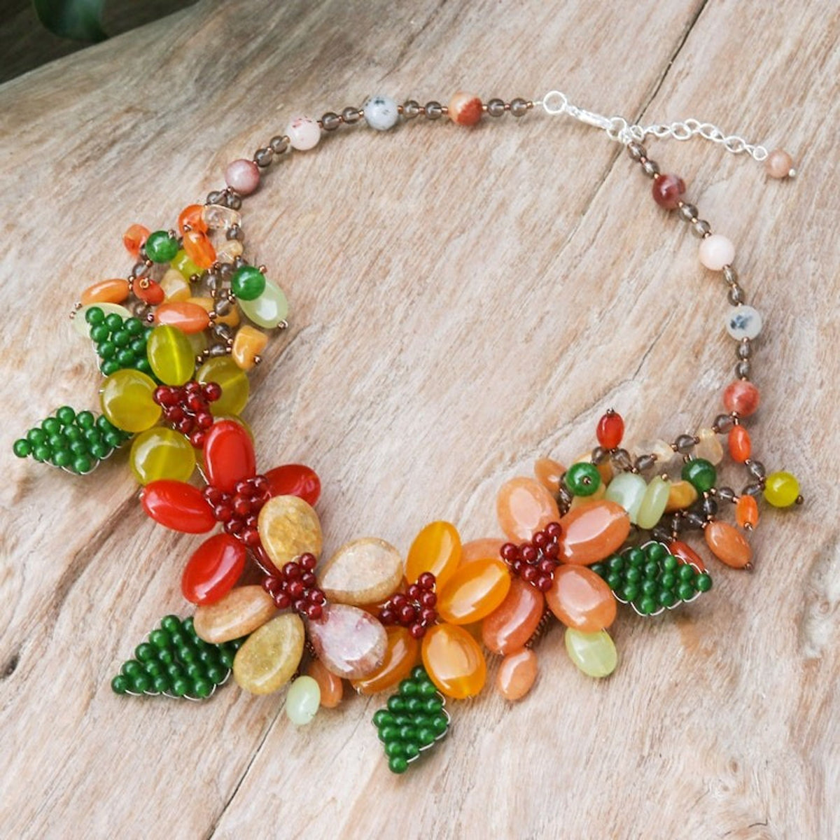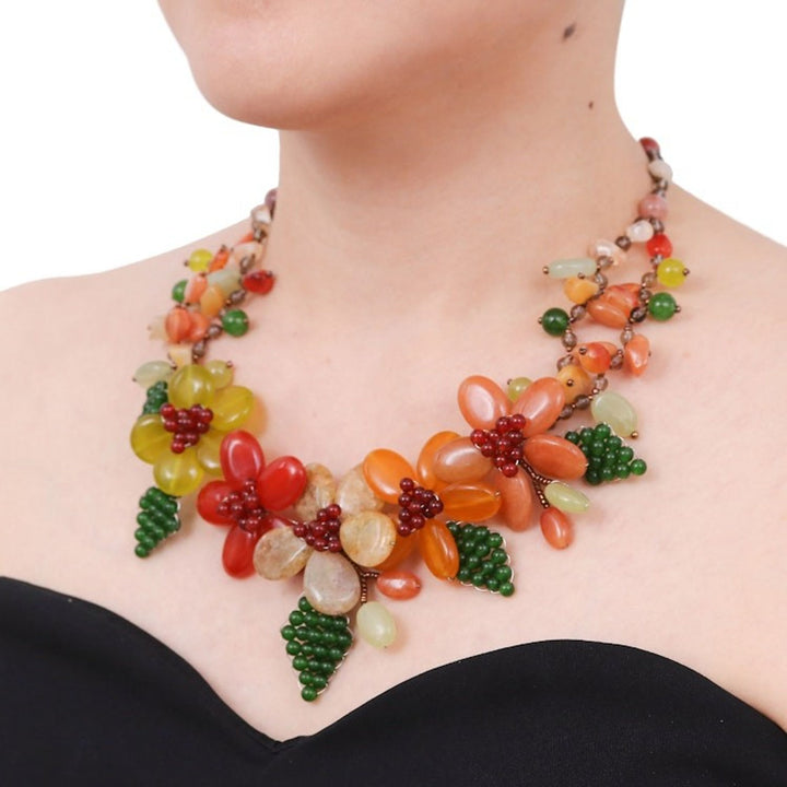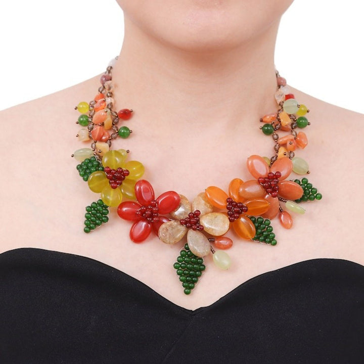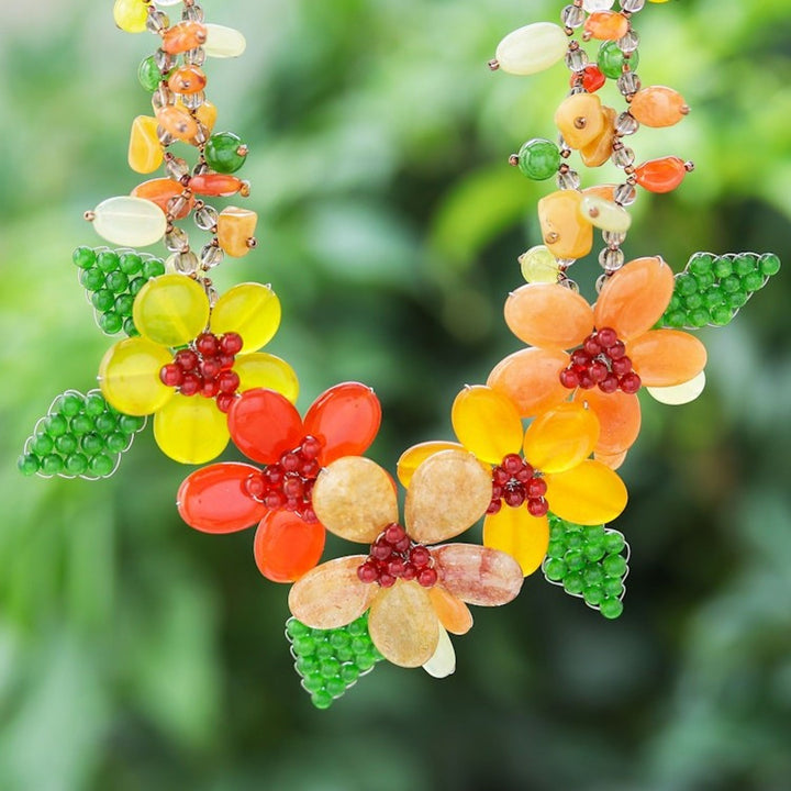This Warm and Green-Toned Floral Multi-Gemstone Beaded Necklace 'Summer Petals' by Independent Artisans is a sublime piece that captures the vibrant essence of the summer season. Designed by Thai artisan Nareerat, this necklace features blooms crafted from glass beads, quartz, serpentine, and carnelian jewels in a warm and green-toned palette. The delicate manual techniques used to create this piece reflect the artist's dedication to preserving traditional craftsmanship, while the little silver-toned brass accents add a luminous touch.