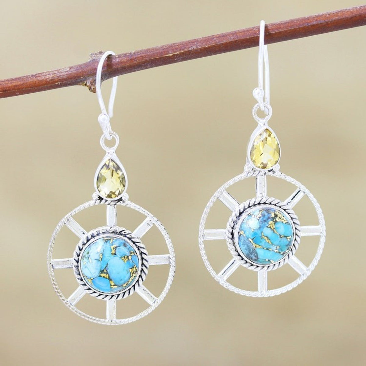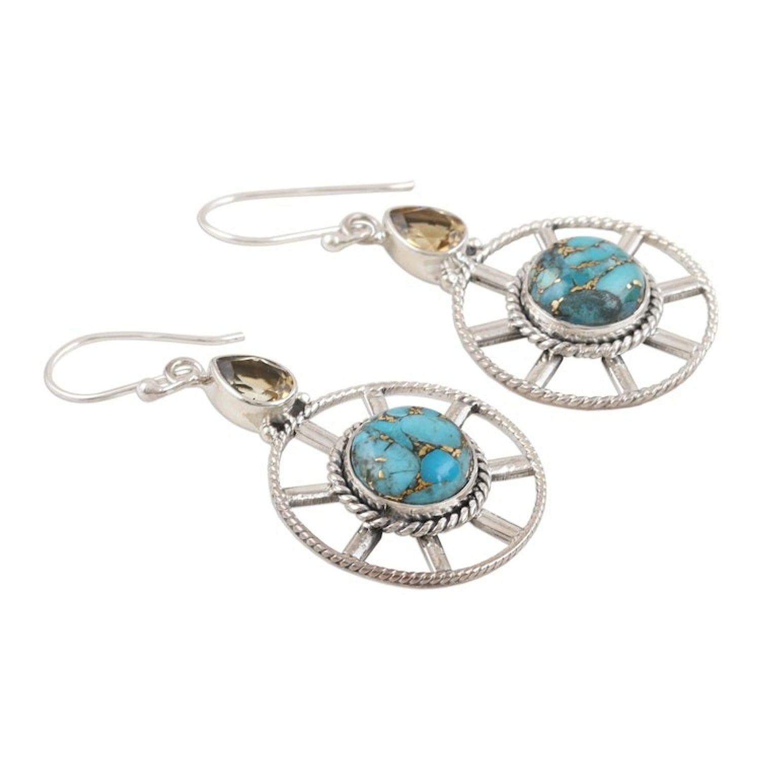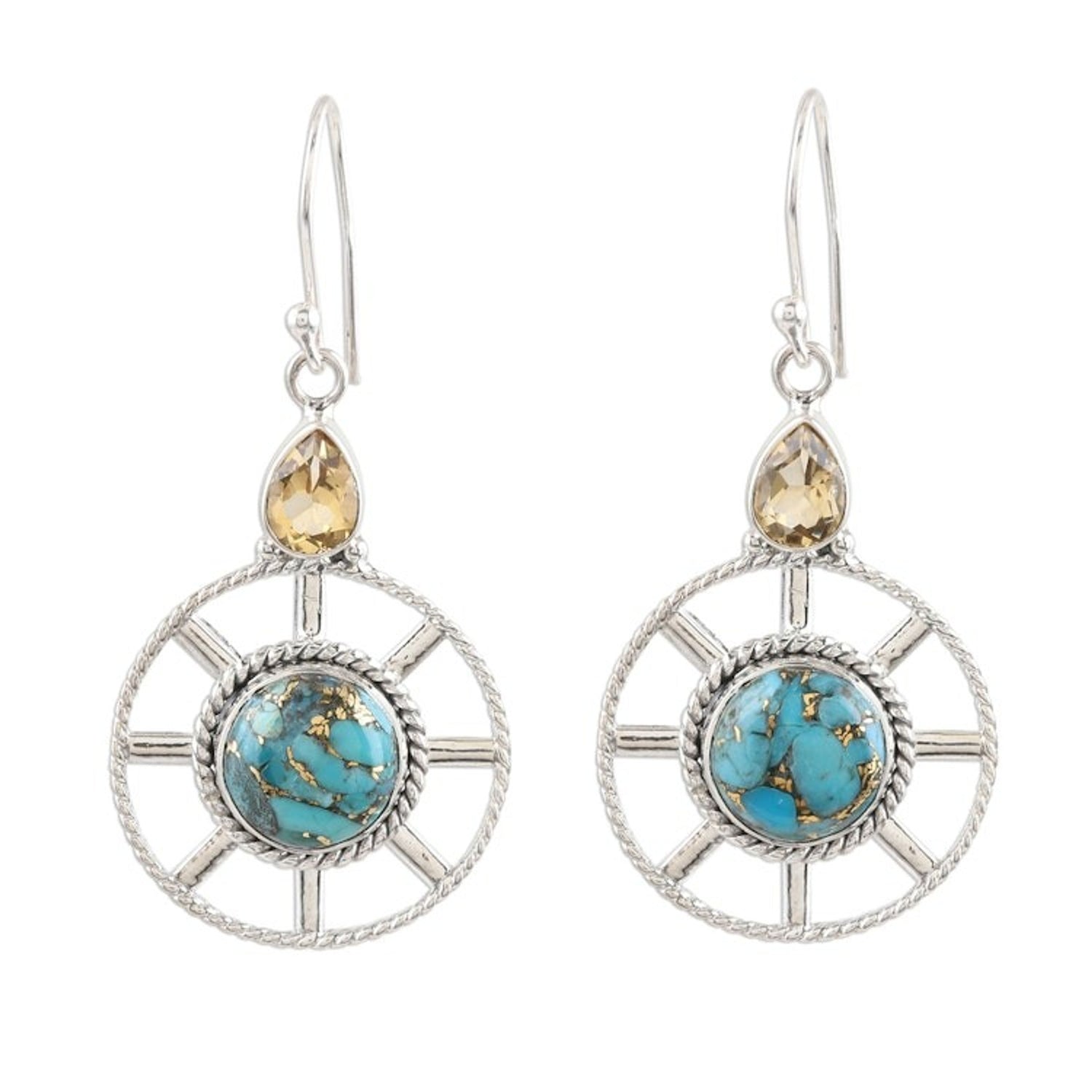 Wheel-Shaped Citrine and Composite Turquoise Earrings 'Wheel in the Sky'