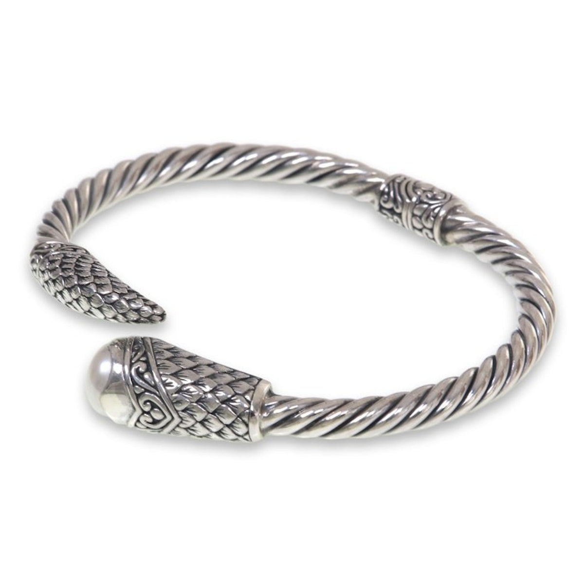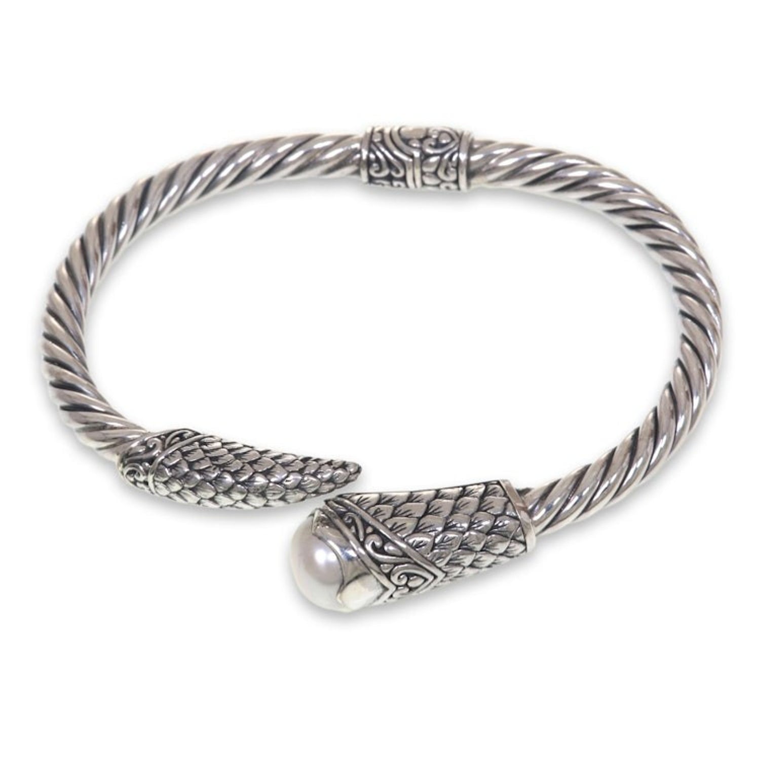 This White Cultured Pearl and 925 Sterling Silver Bangle Bracelet 'Sukawati Royal' by Independent Artisans exudes royal Balinese elegance and timeless grace. Designed by Kadek Wijanegara, this bracelet is a result of a practice that combines technical skill with soulful intention. The sterling silver bangle is beautifully detailed with feather motifs at both ends, a tribute to Balinese art, and a stunning silvery-white cultured pearl. The concealed hinge allows for convenience and comfort, making this piece a perfect blend of tradition and modern wearability.