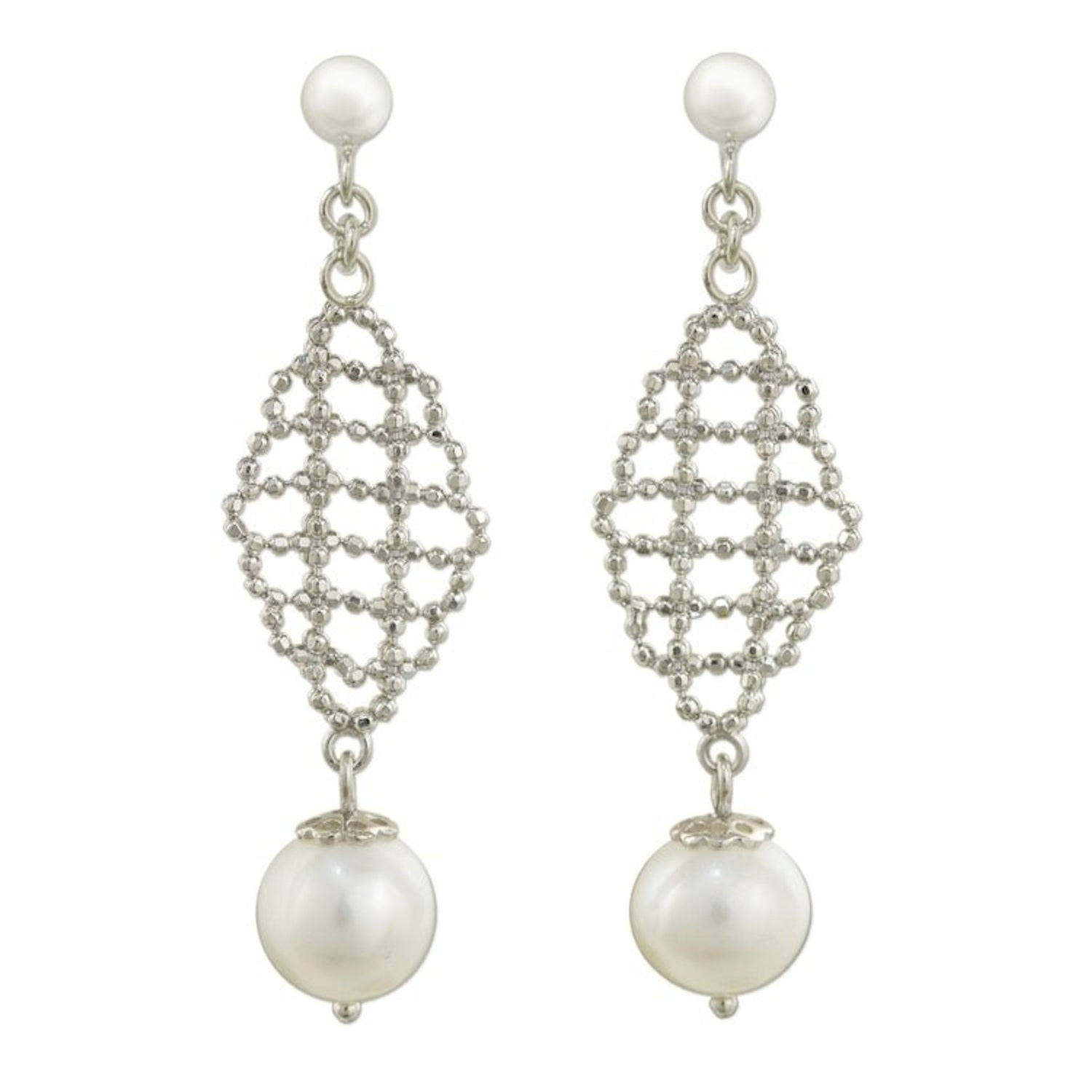 These White Pearls on Artisan Crafted 925 Sterling Silver Earrings 'White Rose Mist' by Independent Artisans are a design that blends classic elegance with modern energy. Created by Angels, a Thai artisan who continues her family's legacy, these sterling silver earrings are masterfully crafted with a woven effect from minute beads. The design culminates with white iridescent pearls that sway with graceful movement, embodying both tradition and refinement while supporting the communities that sustain Thailand's silversmithing culture.