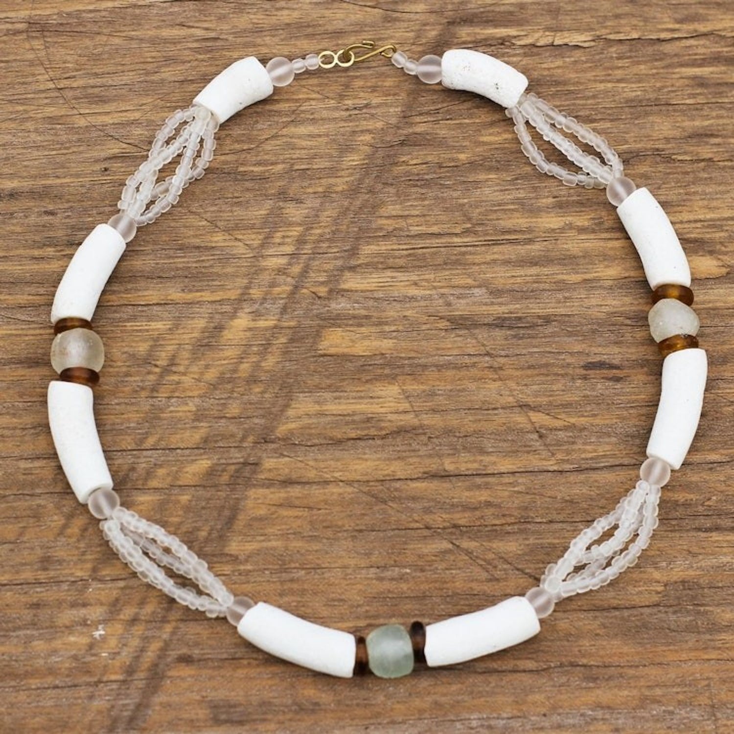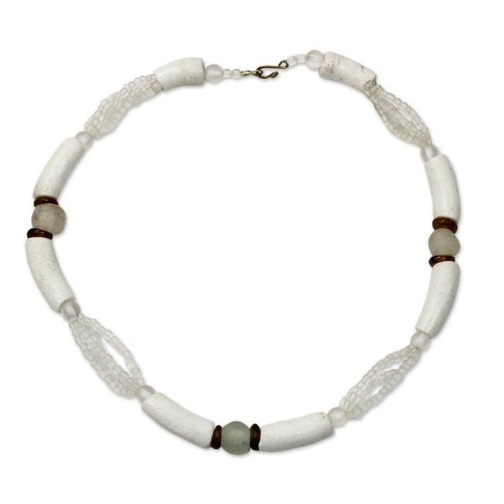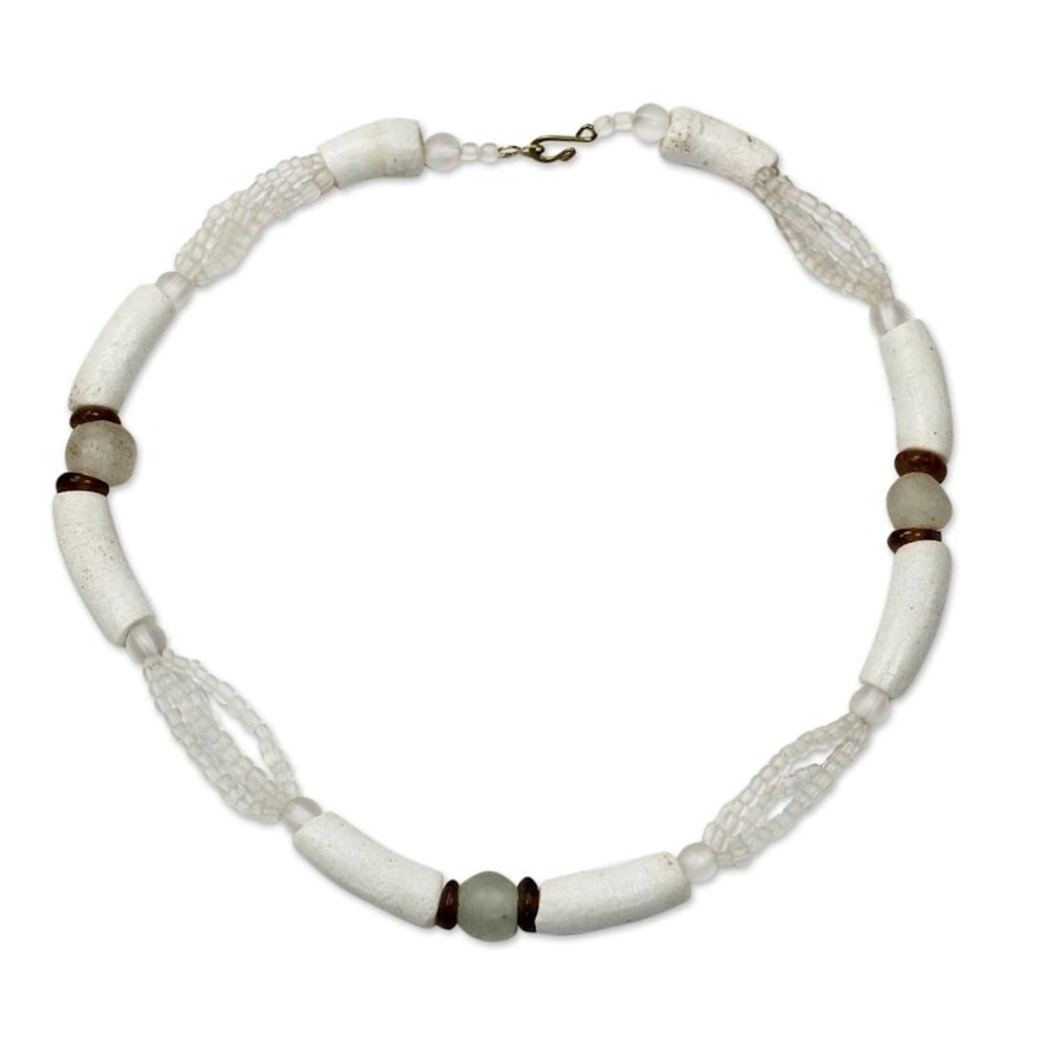 White Recycled Glass Beaded Necklace from Ghana Jewelry 'African Glamour'